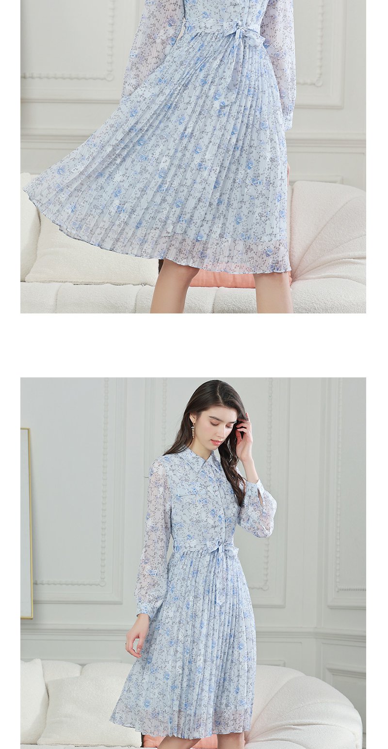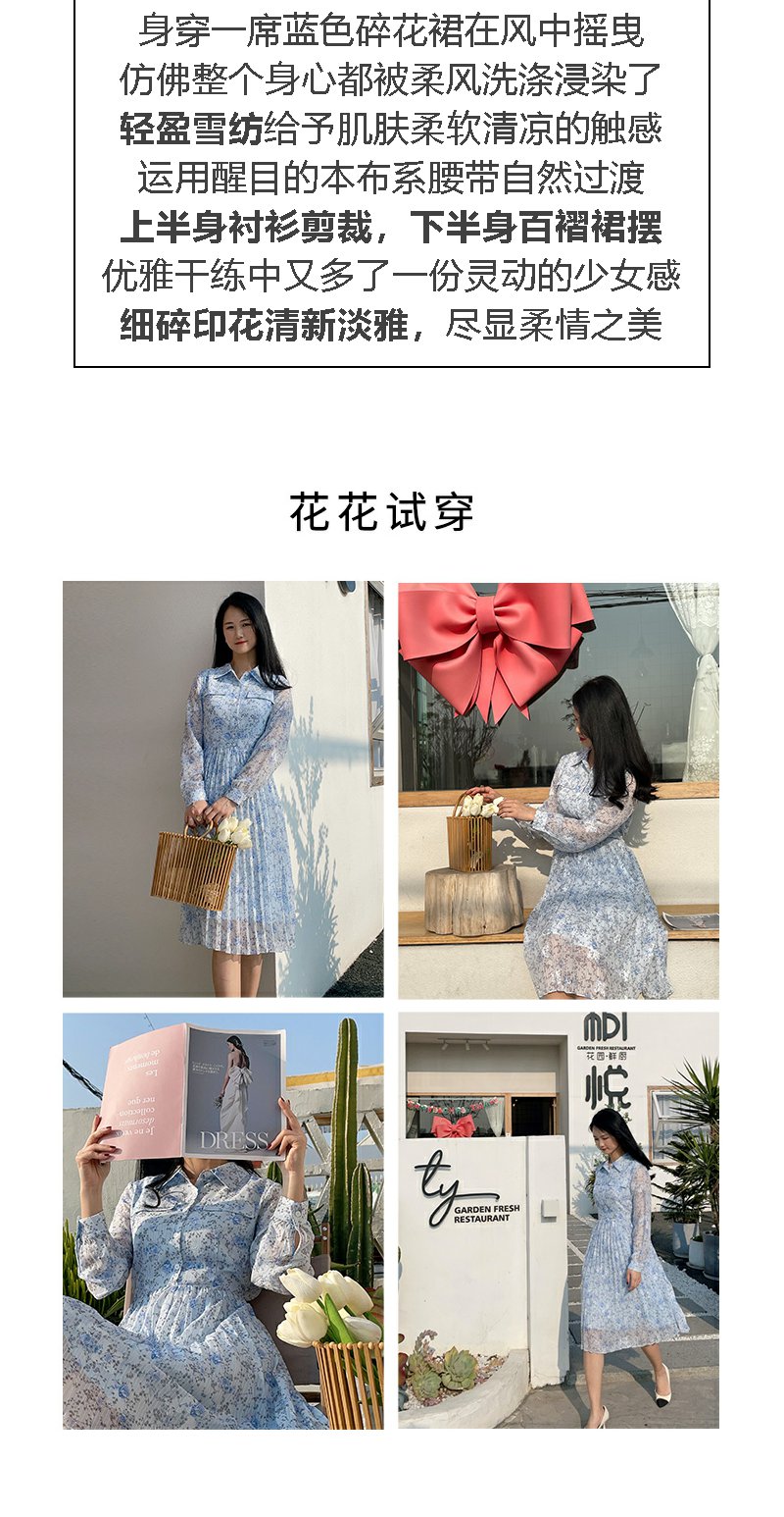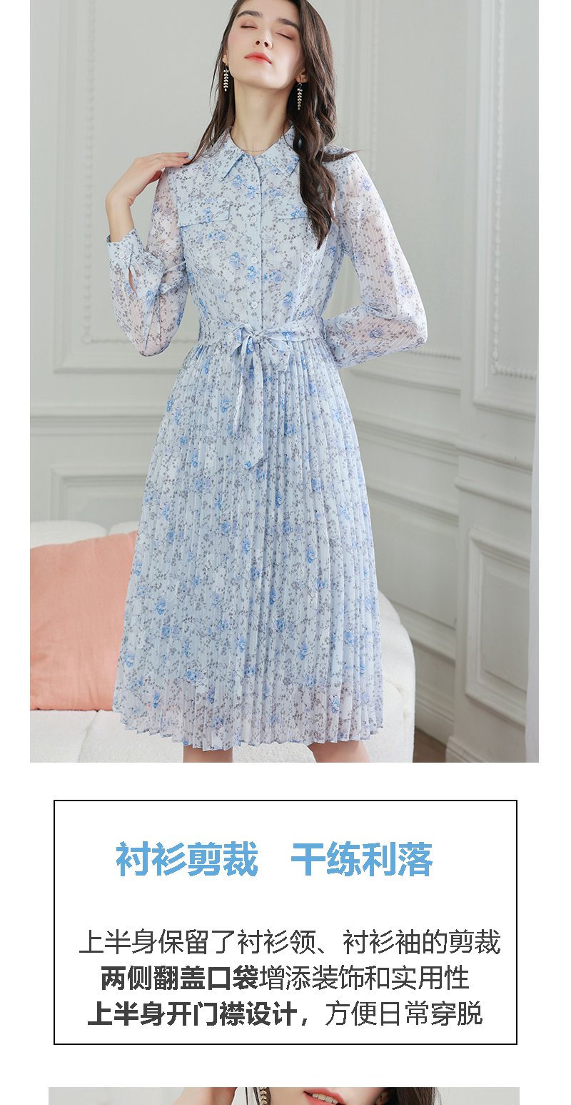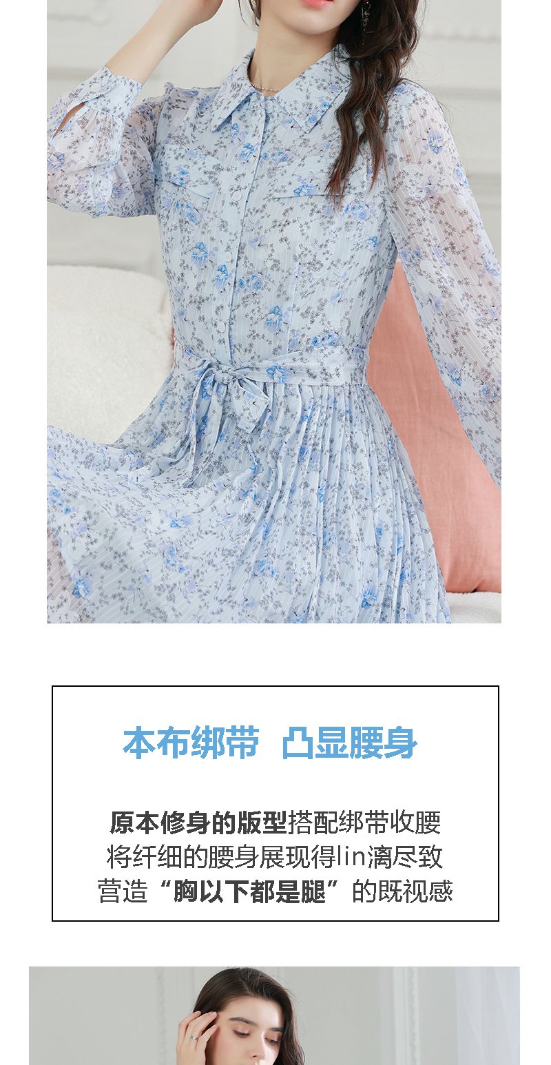 未风蓝色雪纺碎花连衣裙女早秋2024秋季新款气质显瘦娃娃领百褶裙