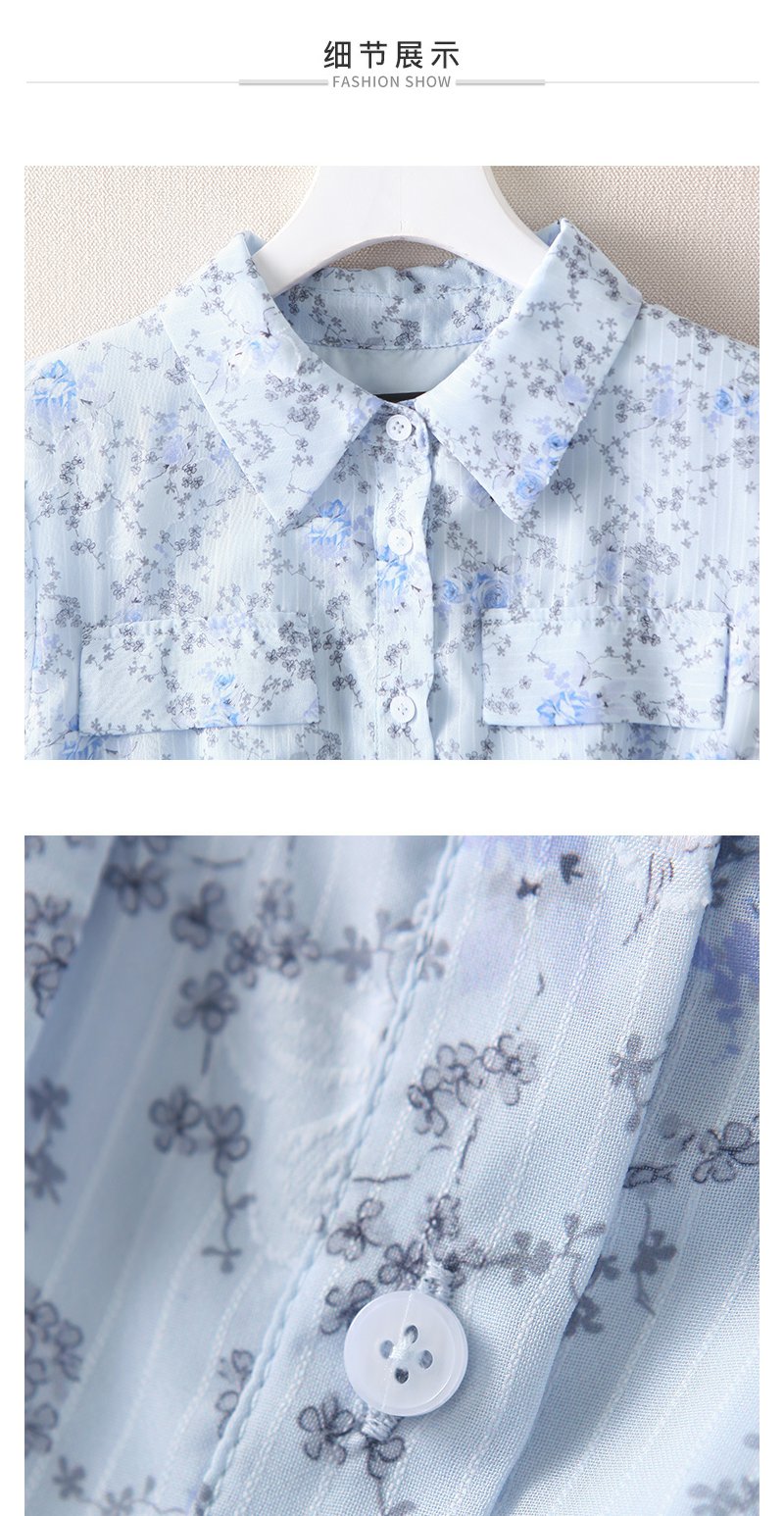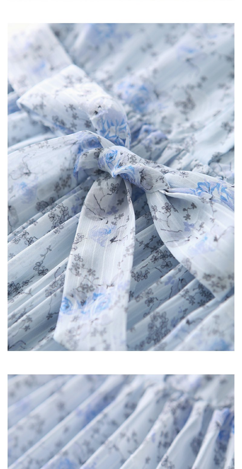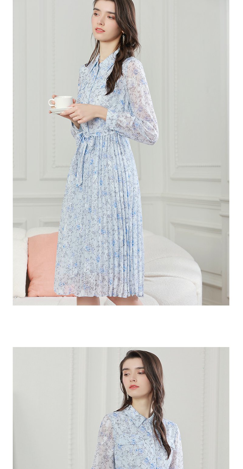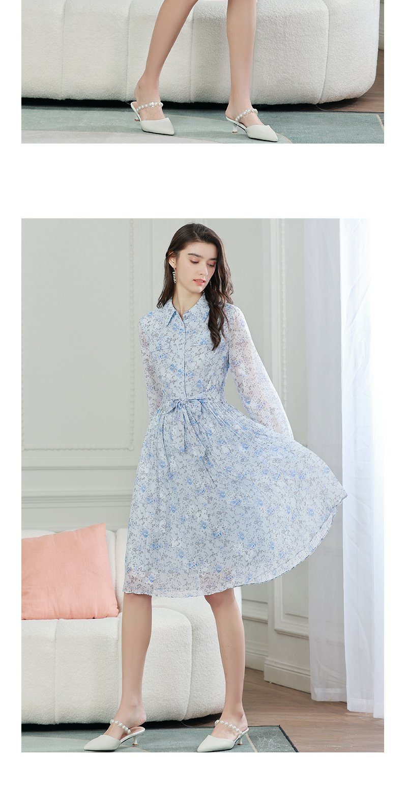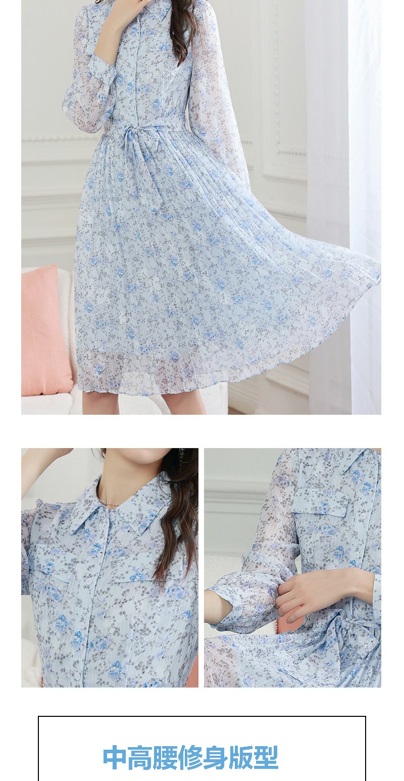 未风蓝色雪纺碎花连衣裙女早秋2024秋季新款气质显瘦娃娃领百褶裙