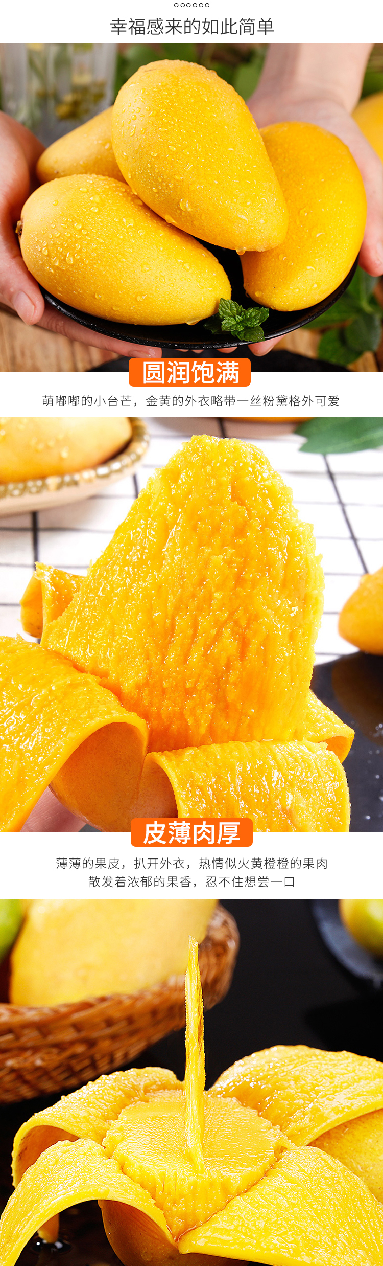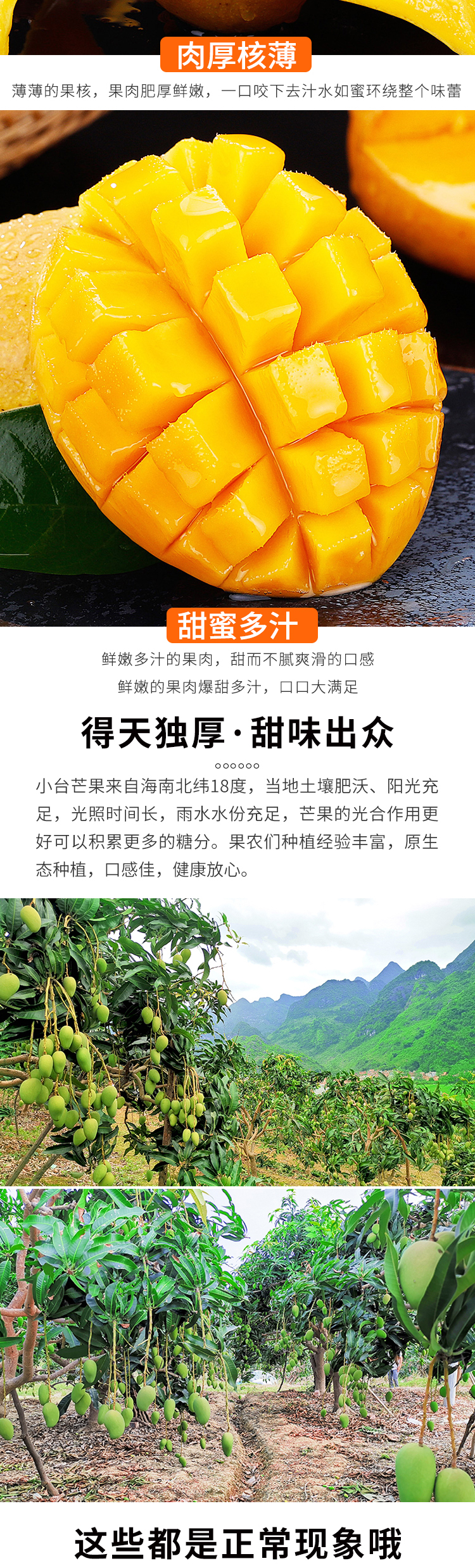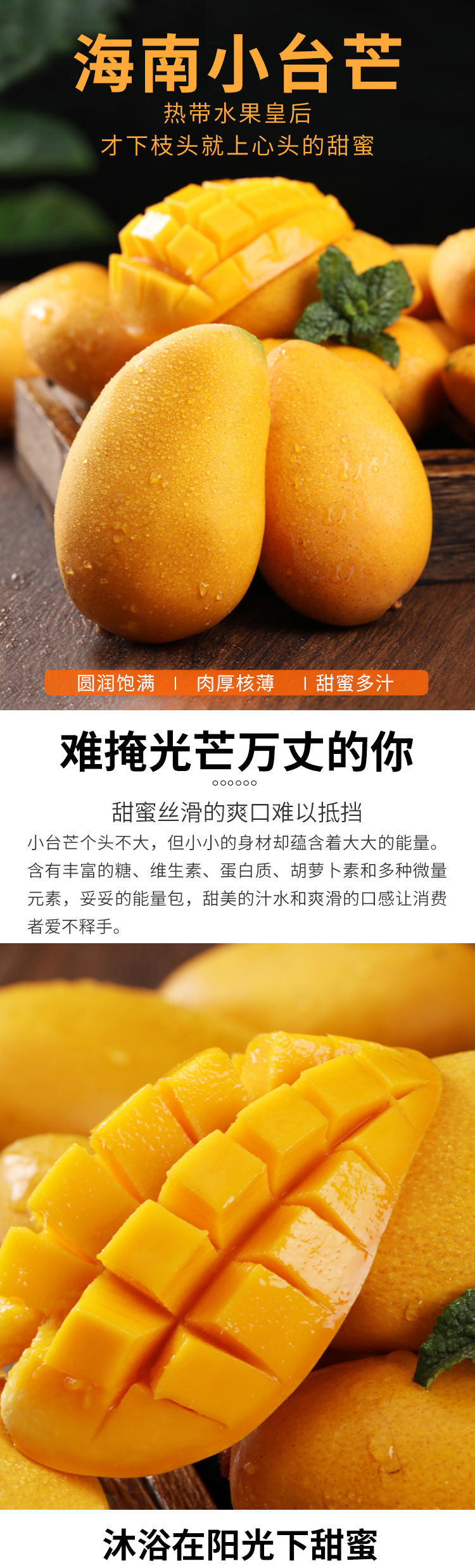 小台农芒果 ——水果中的“小甜心” 台农芒果甜度极高,核小皮薄肉厚,果肉细致无纤维,风味可口、外观讨好,肉质好、入口酥、香味浓、纤维细,是芒果中身价最俊俏的品种。