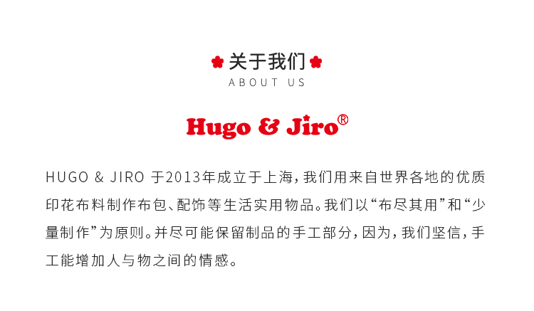 HUJI祤集于2013年成立于上海,我们用世界各地的优质印花布料制作布包、配饰等生活实用物品,以“布尽其用”为原则,保持少量制作,并尽可能保留手工部分。我们坚信,手工能增加人与物之间的情感。