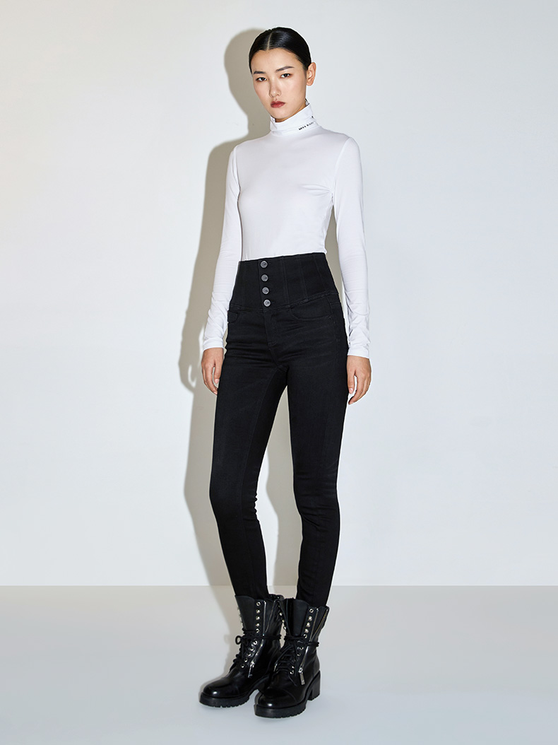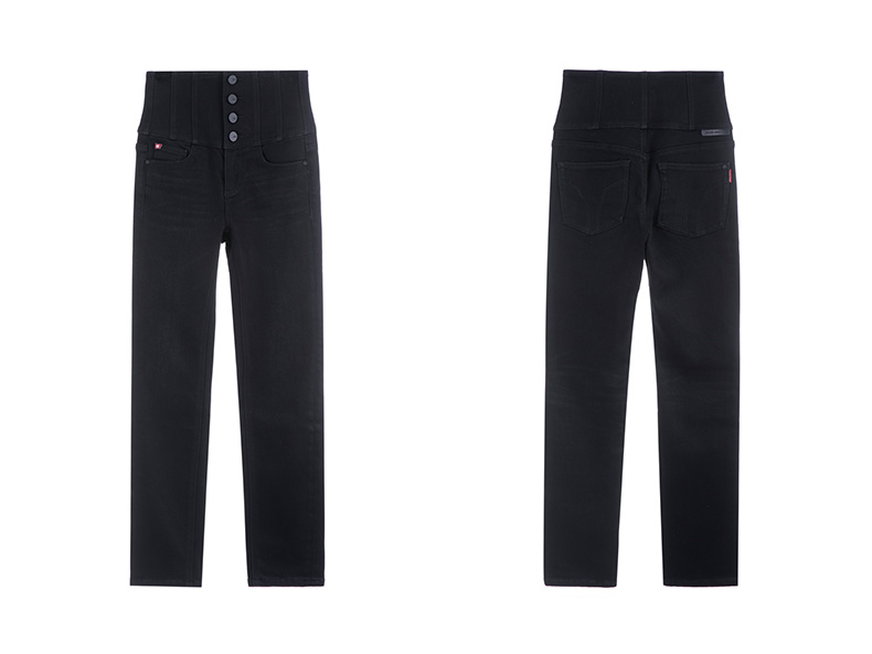 紧身小脚铅笔裤配以黑色洗水色调,尤为显瘦百搭
