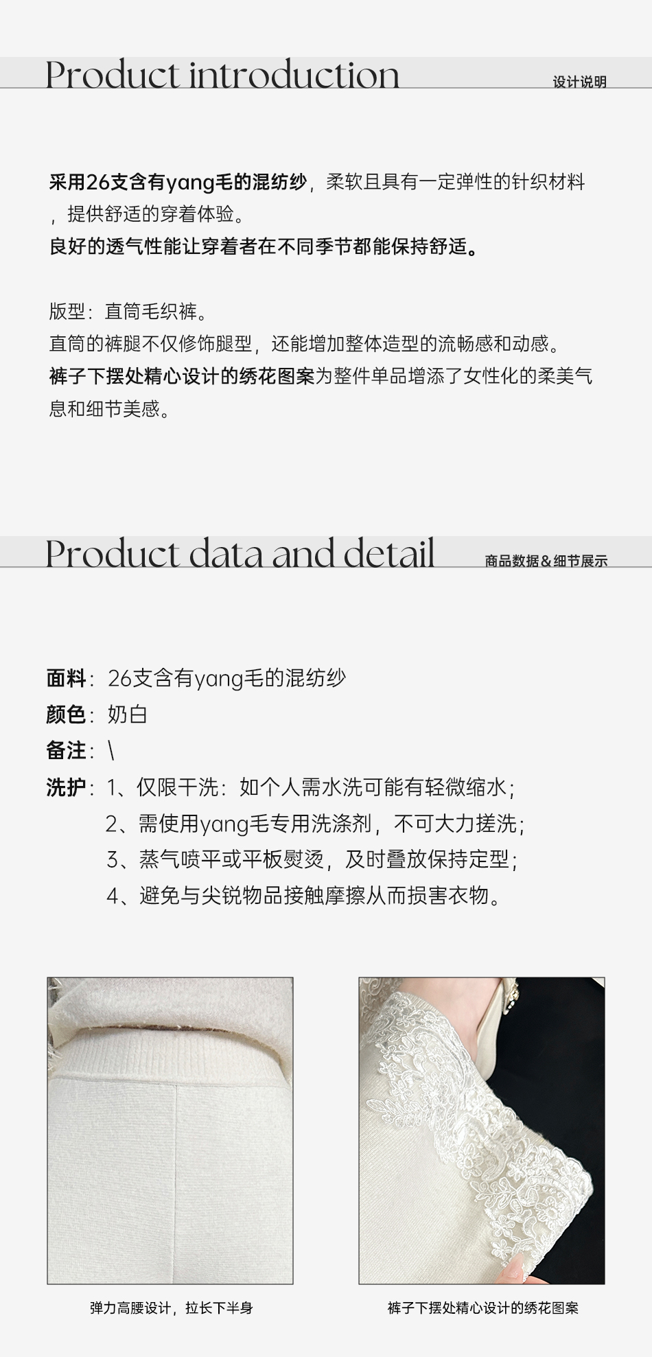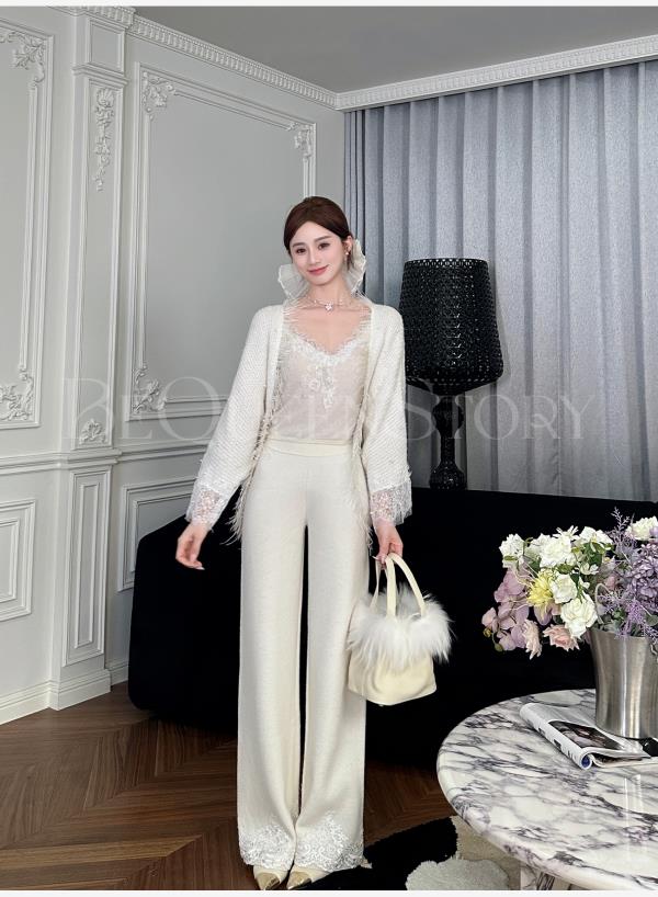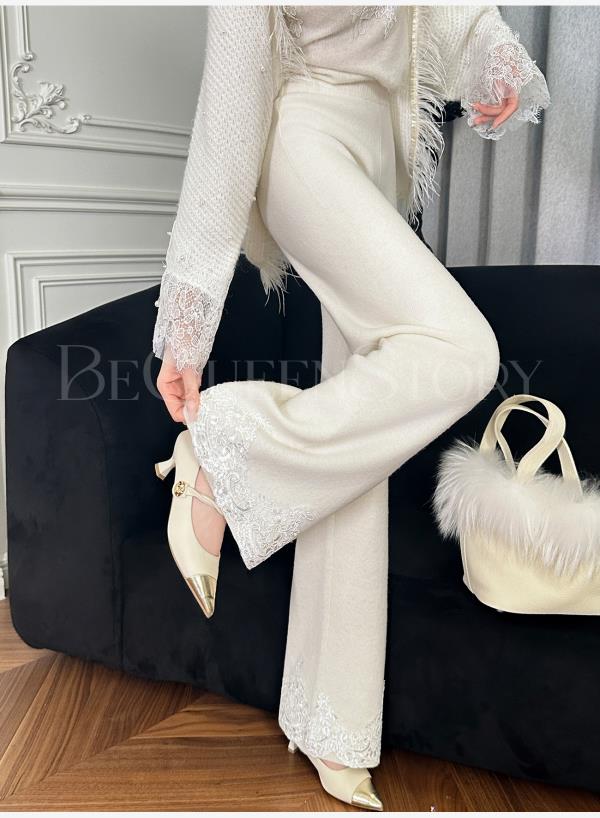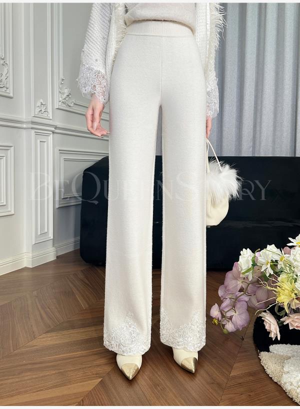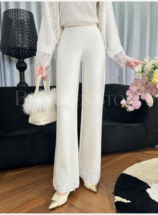 BeQueenStory【白影霜花】舒适柔软绵羊毛混纺绣花直筒阔腿休闲裤