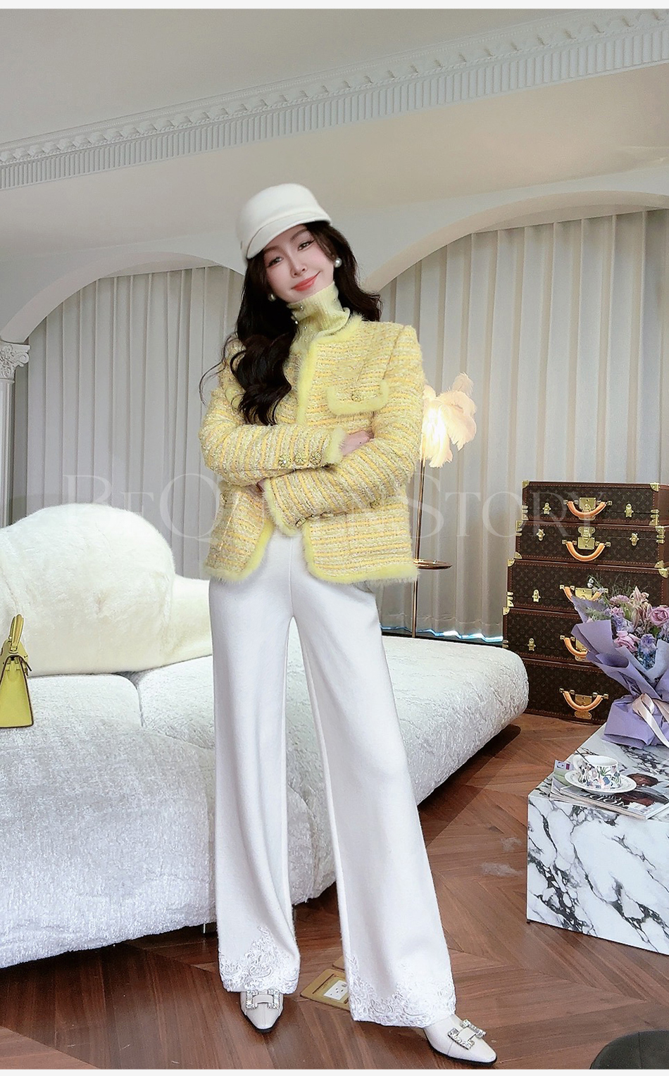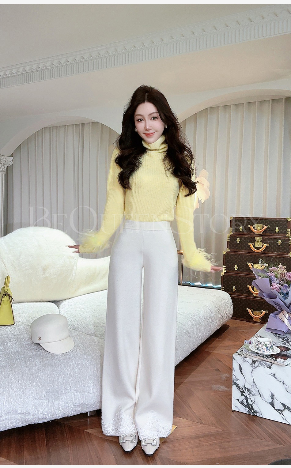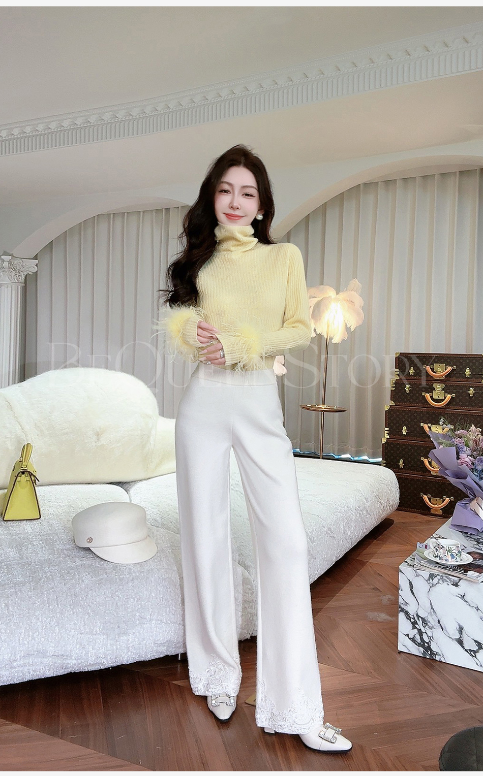 BeQueenStory【白影霜花】舒适柔软绵羊毛混纺绣花直筒阔腿休闲裤