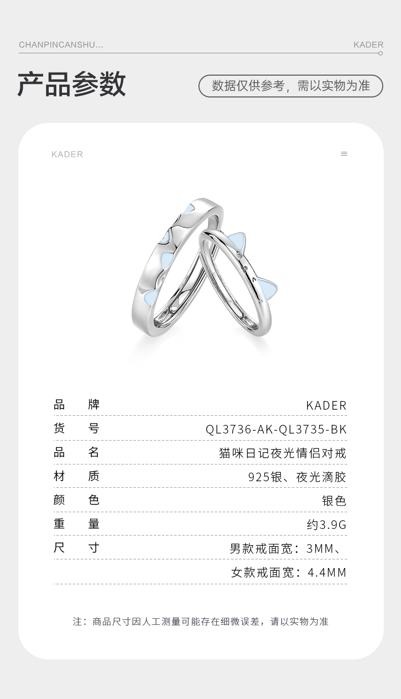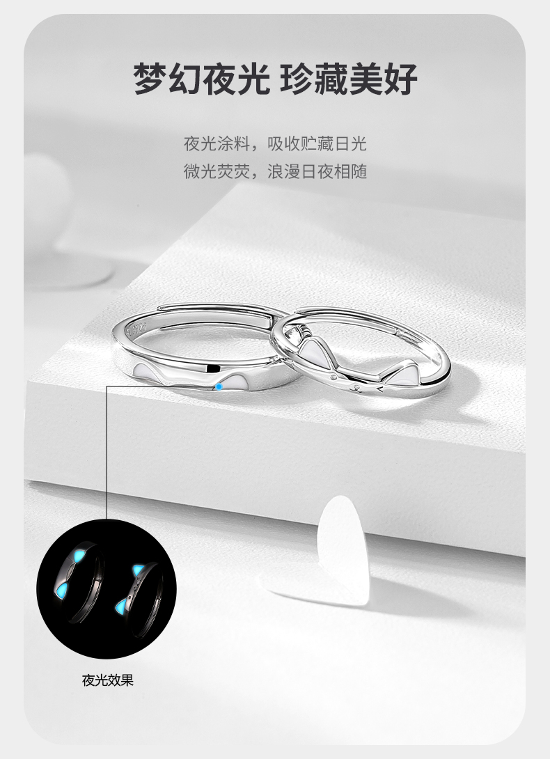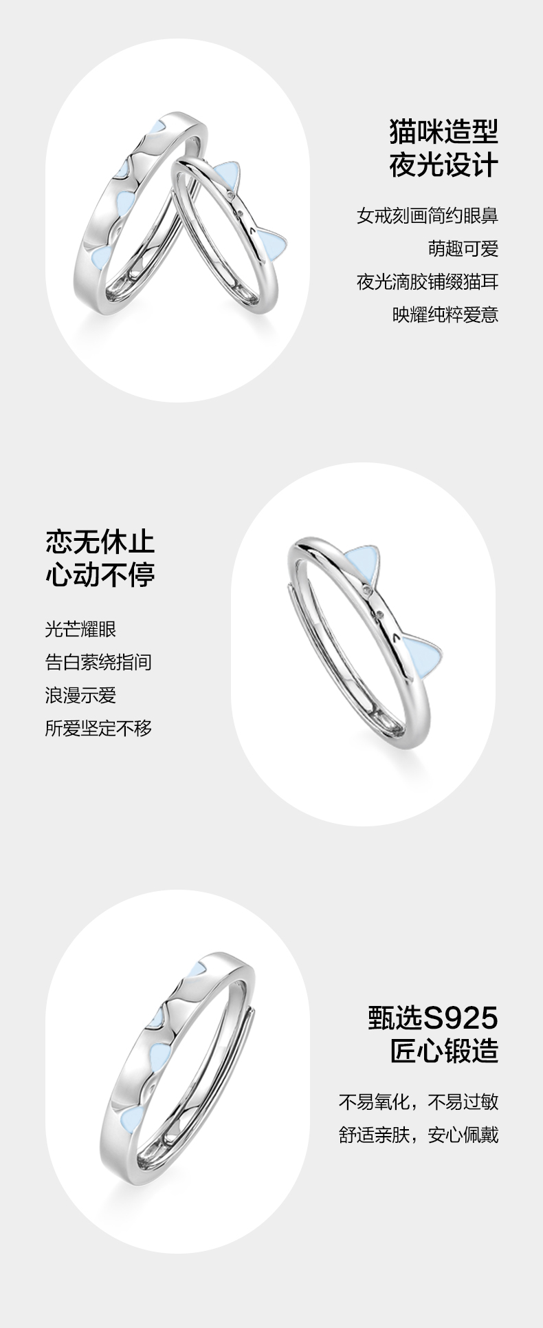 【夜光|原创】 卡蒂罗KADER 猫咪日记情侣对戒(夜光) 轻奢可爱ins风萌趣猫耳生动立体俏皮设计开口可调节一对 925银 戒指 男女同款情侣款 银色 蛇年礼