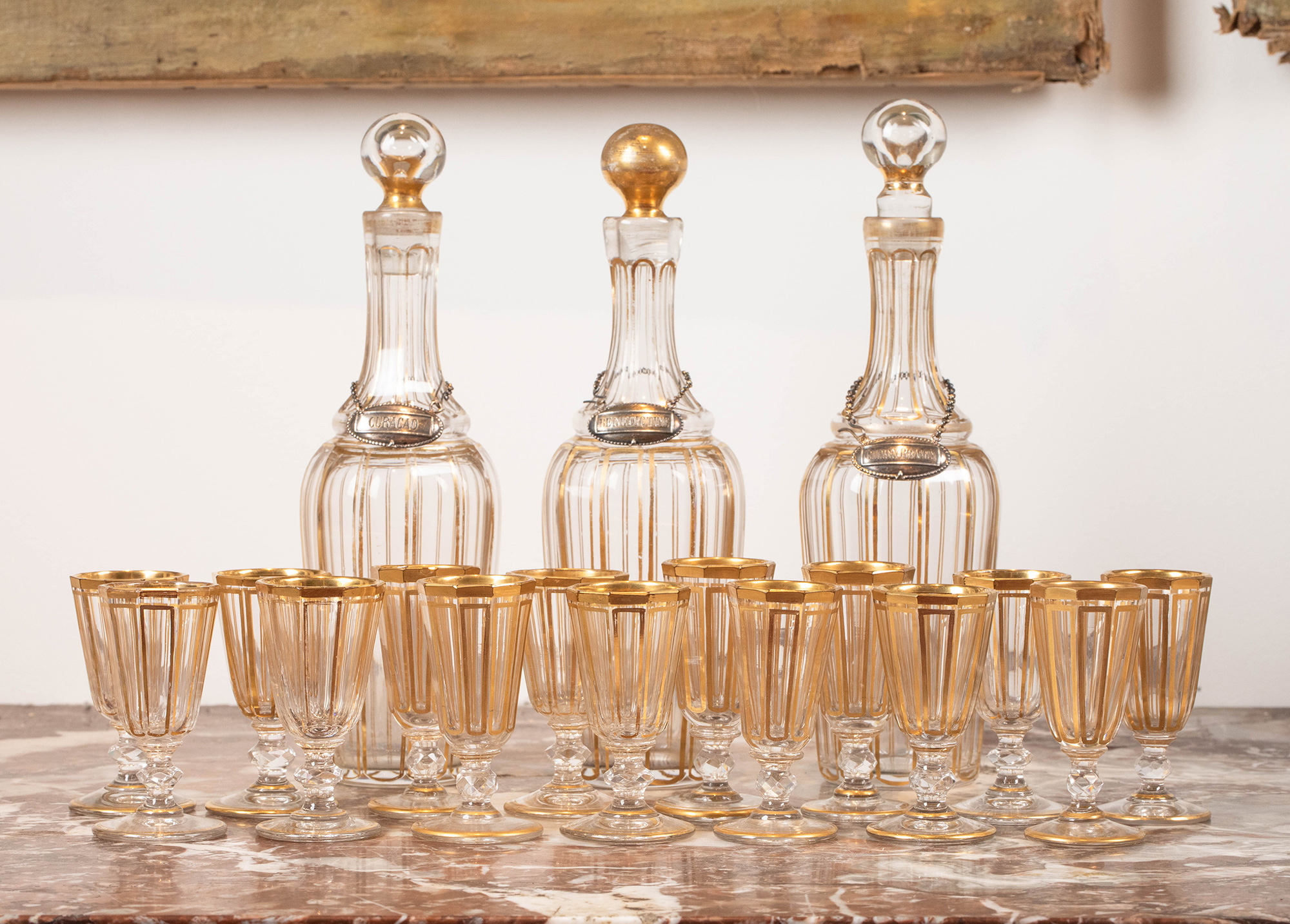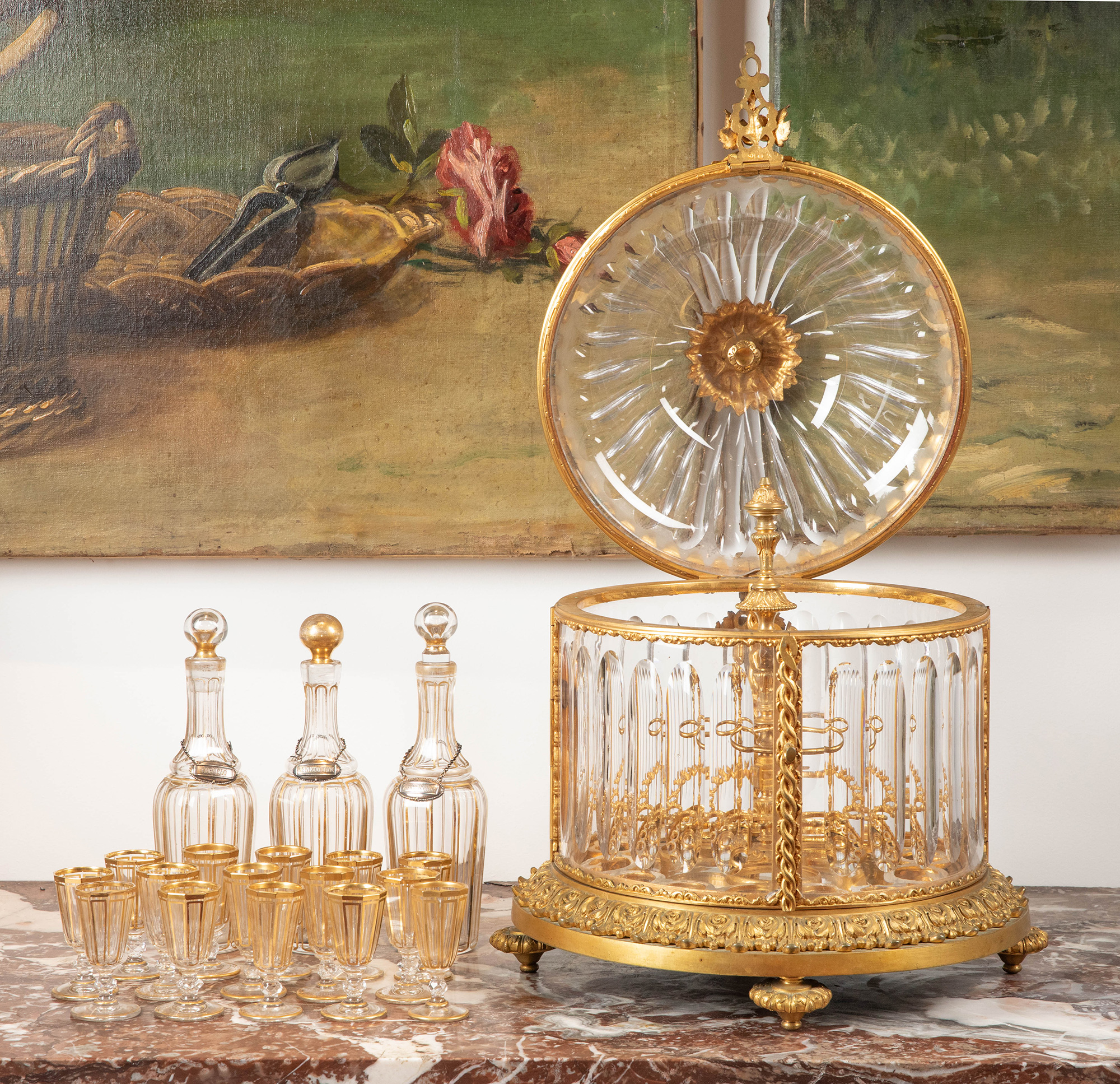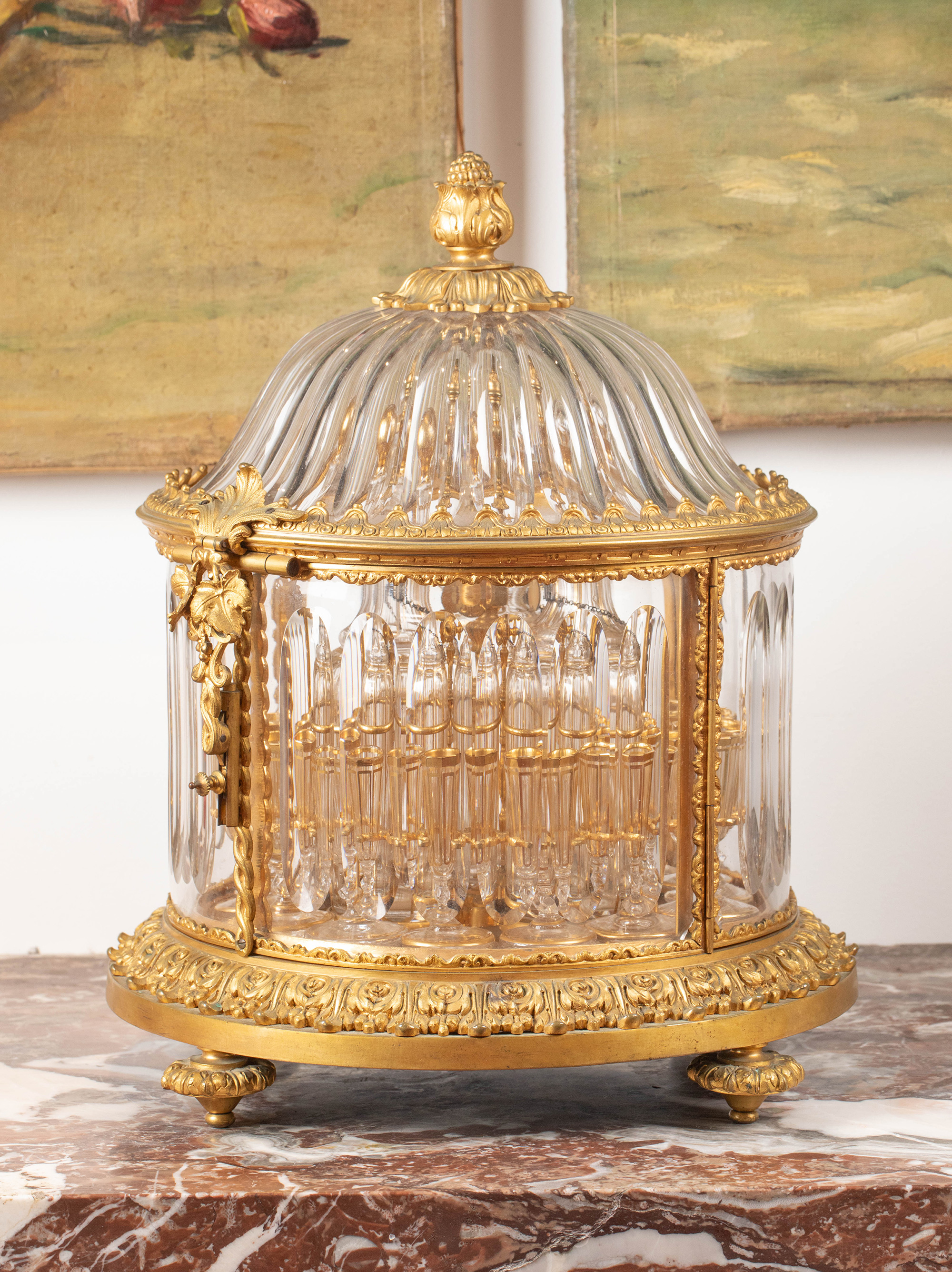 19世纪法国著名水晶工坊巴卡拉出品葡萄藤叶主题铜鎏金精雕烈酒箱及支架装饰描金水晶酒具套件