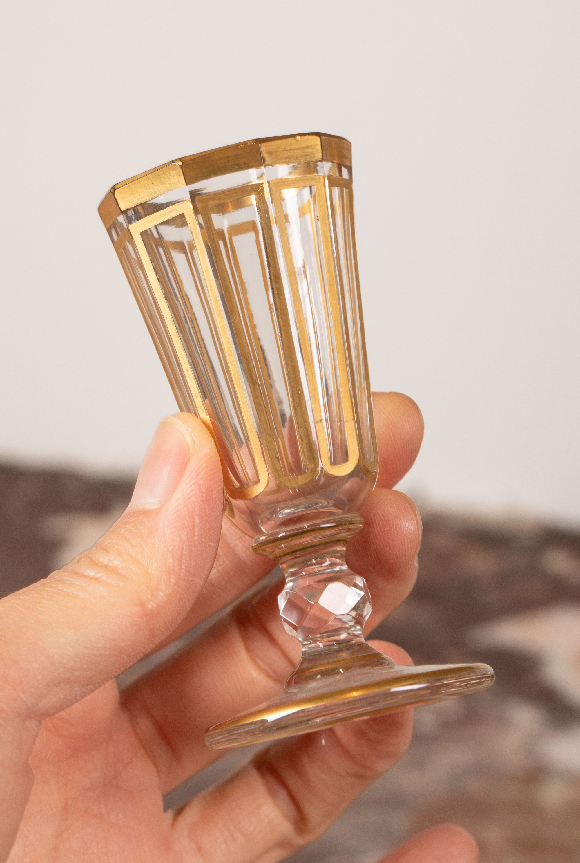独角鹿西洋古董19世纪法国著名水晶工坊巴卡拉出品葡萄藤叶主题铜鎏金精雕烈酒箱及支架装饰描金水晶酒具套件