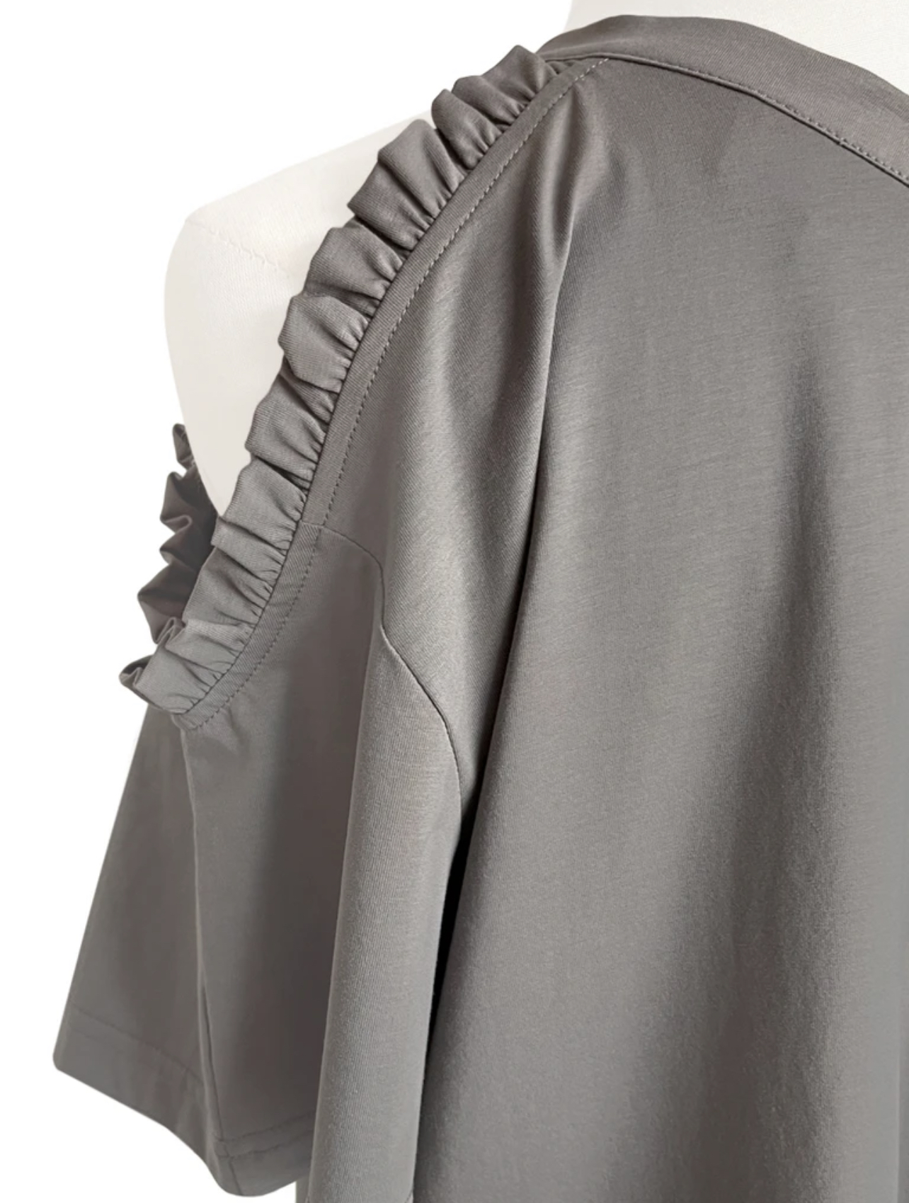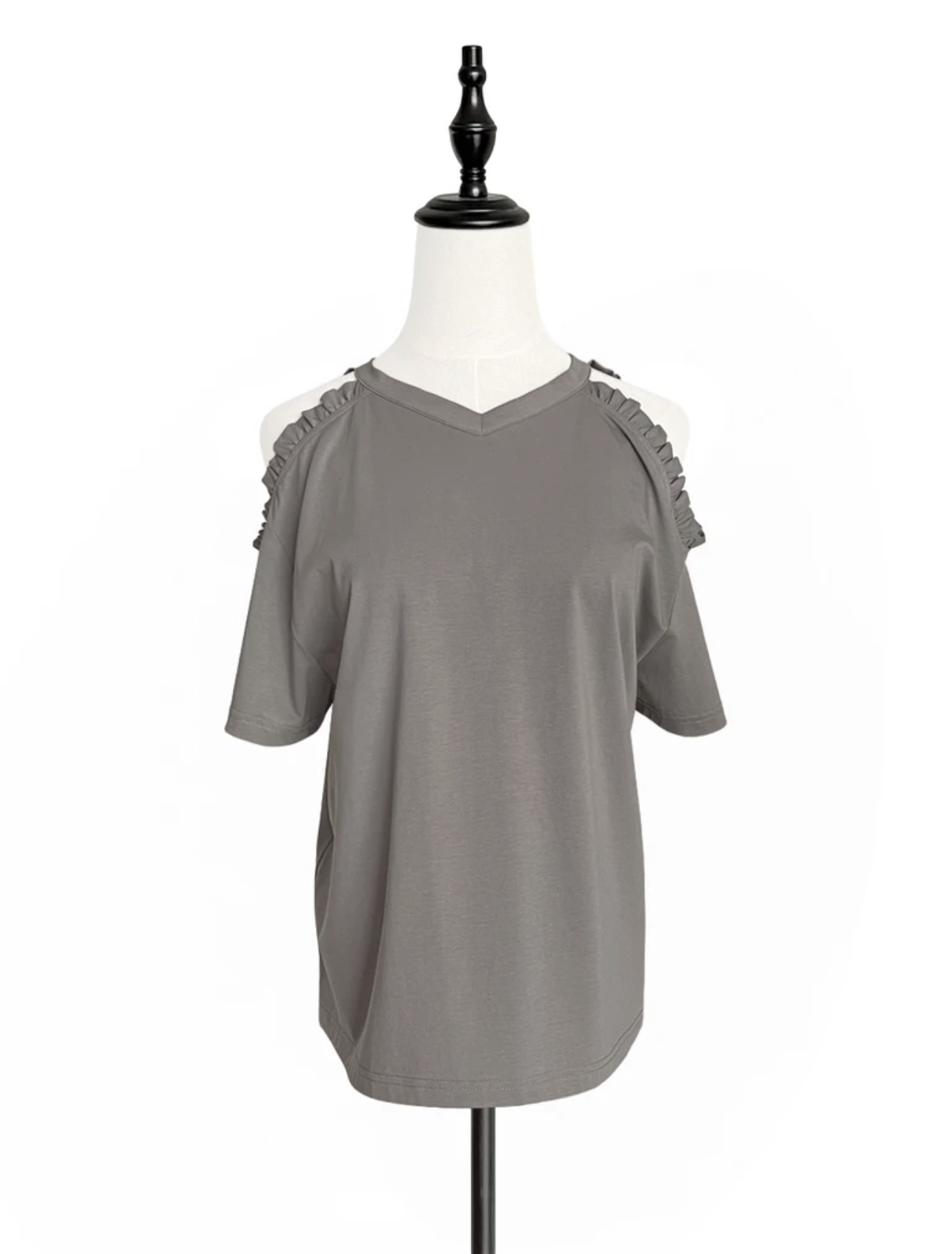 TYNVIE 露肩花边装饰短袖T恤 - 灰色
