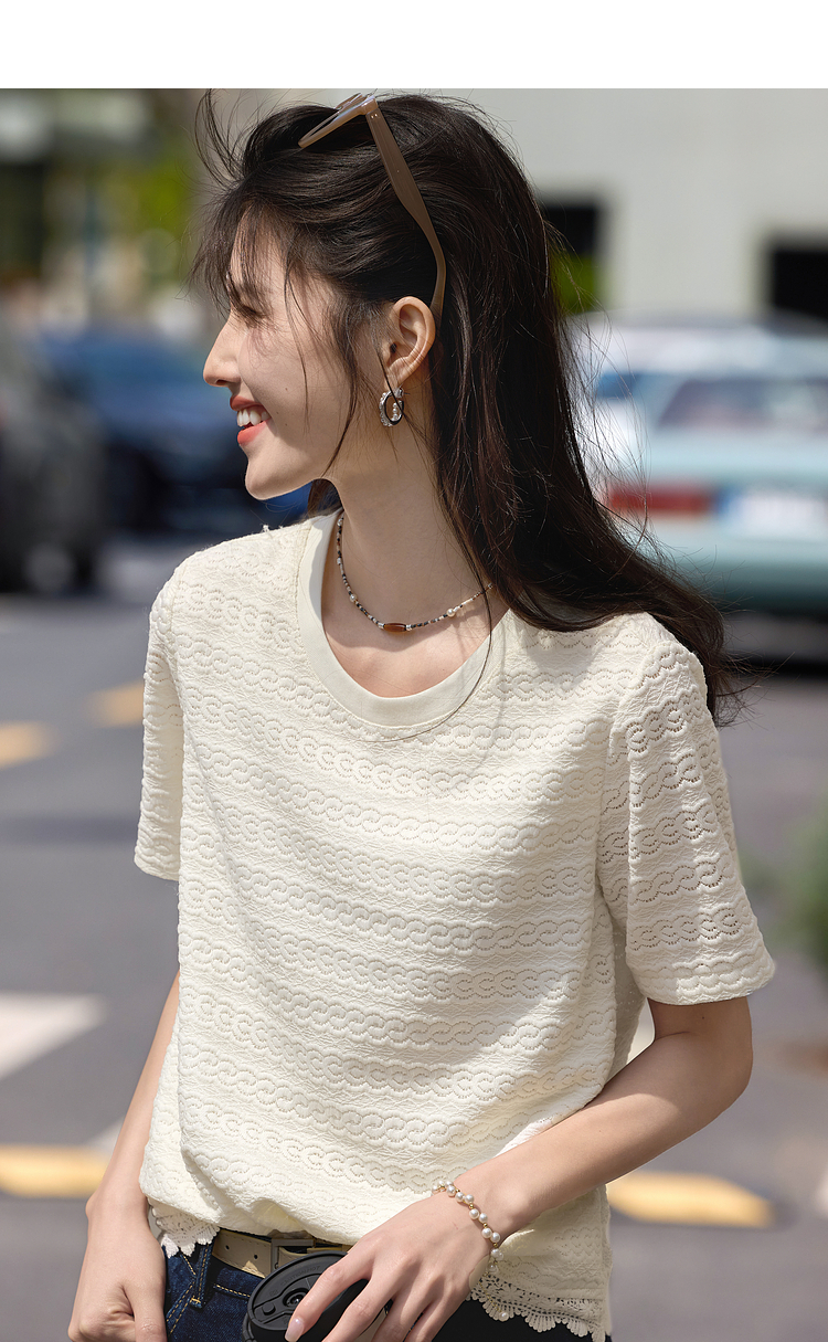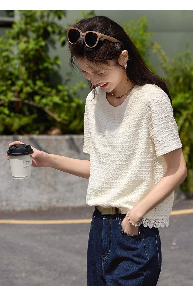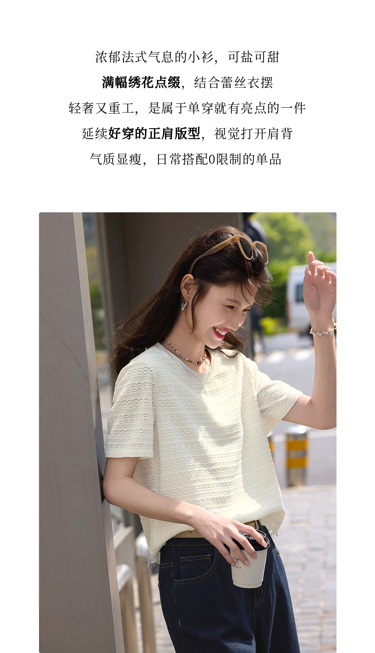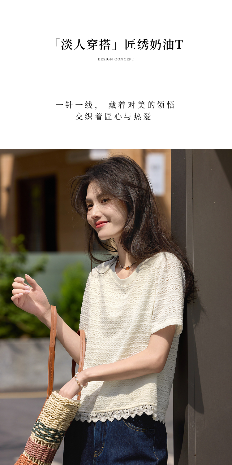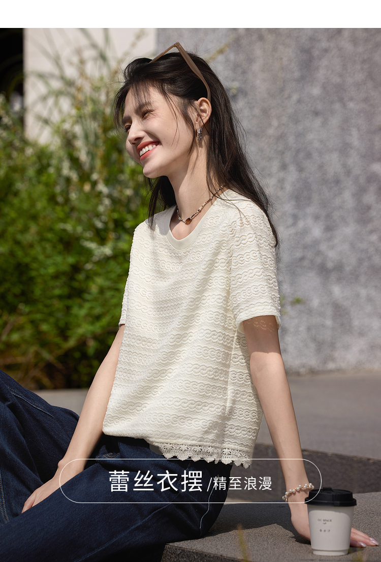 【专属特价】熙世界法式重工绣花圆领T恤短袖女夏季气设计感蕾丝衣摆正肩上衣