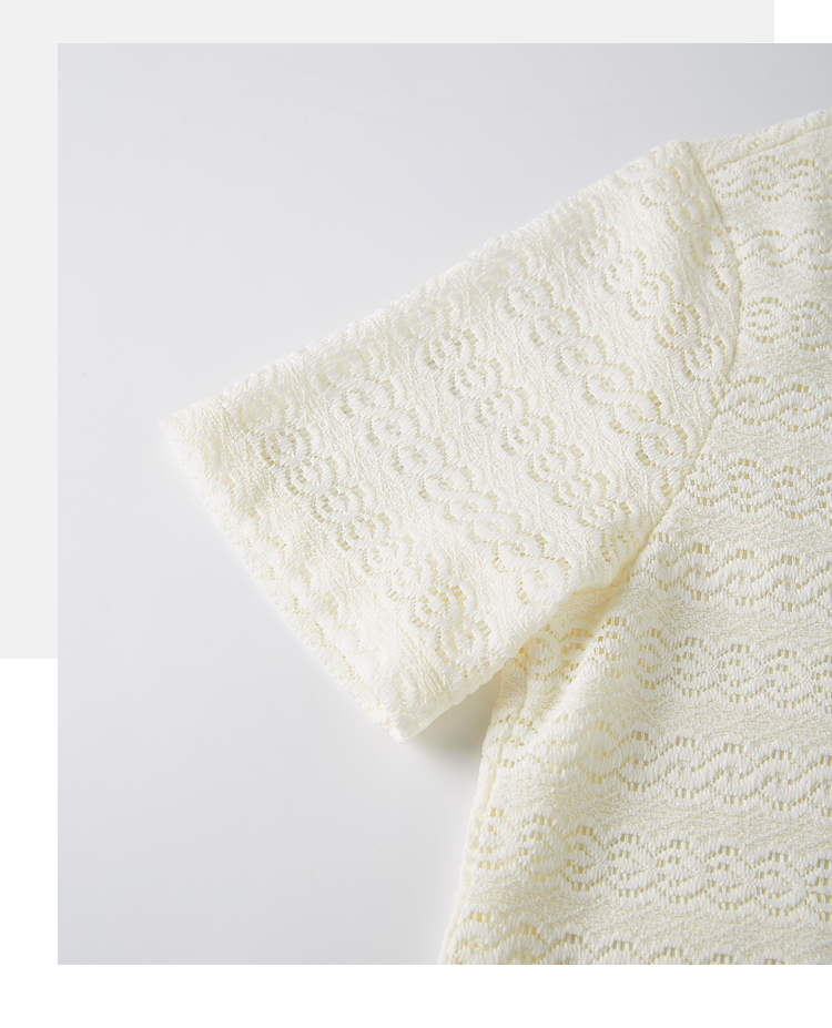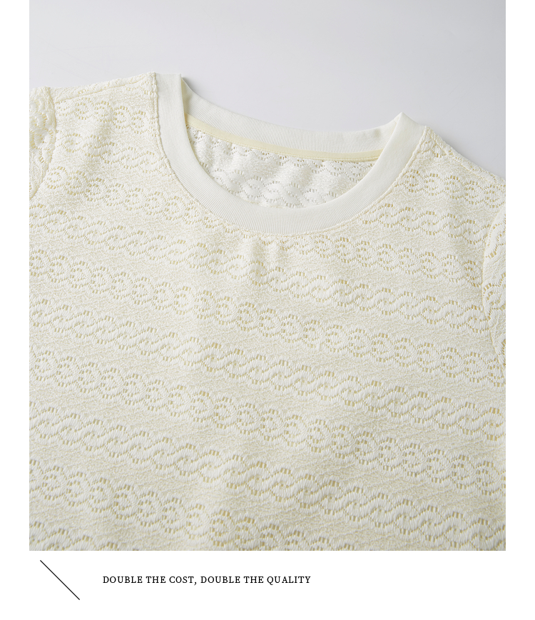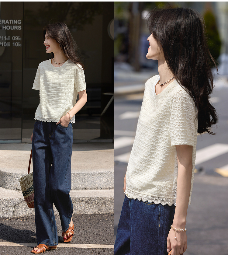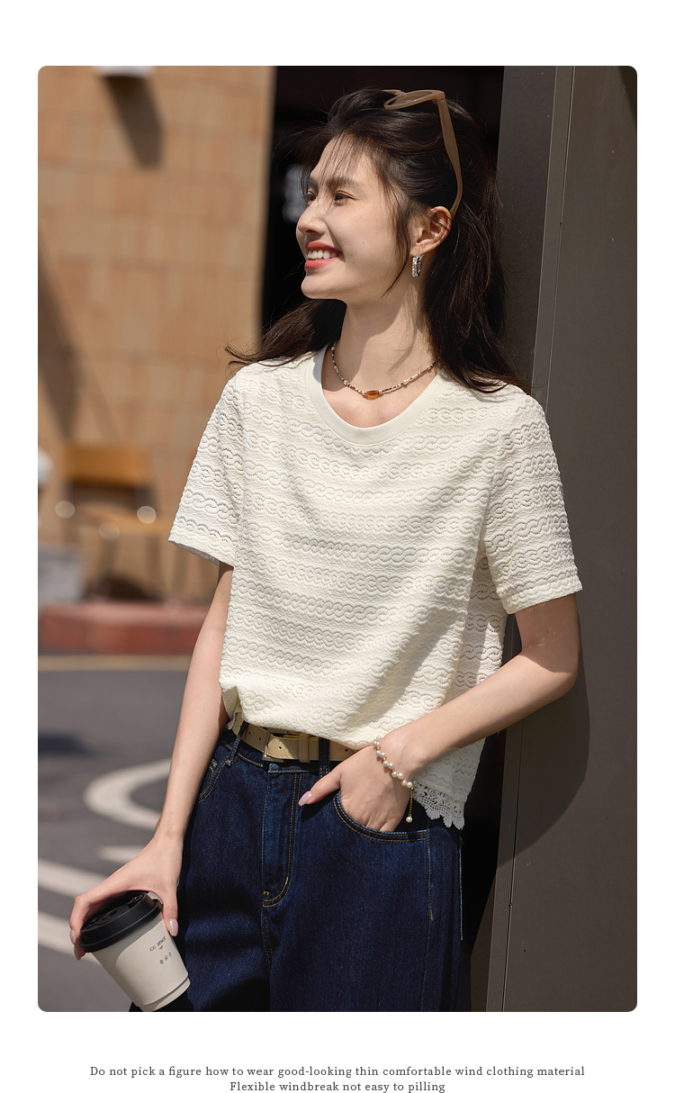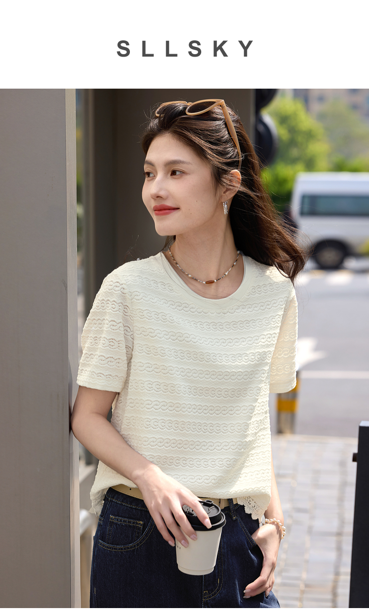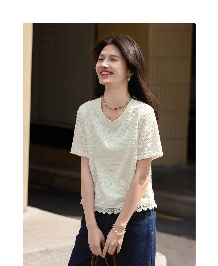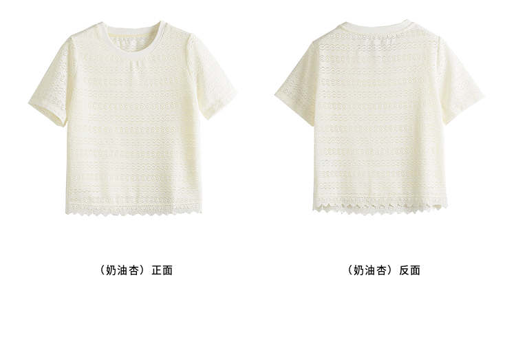 【专属特价】熙世界法式重工绣花圆领T恤短袖女夏季气设计感蕾丝衣摆正肩上衣