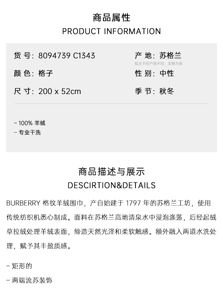 BURBERRY 巴宝莉 男女通用宽格纹羊绒围巾 格子 8094739 C1343