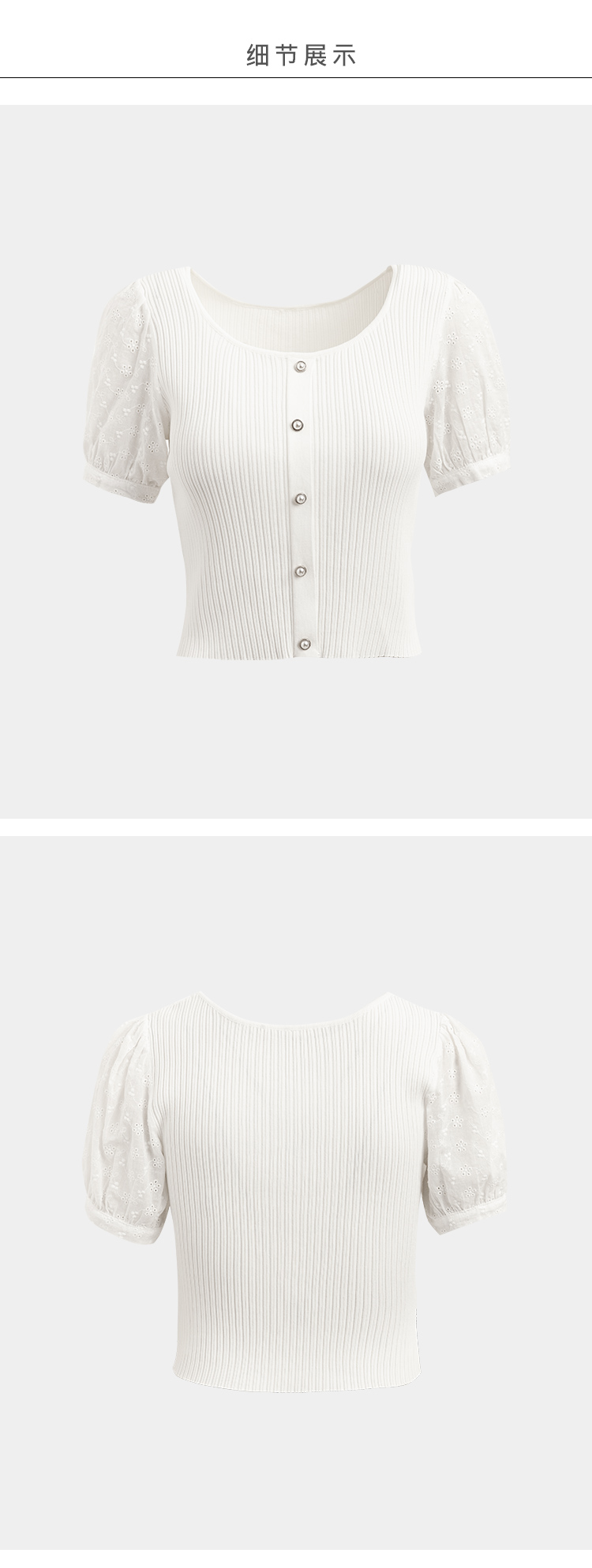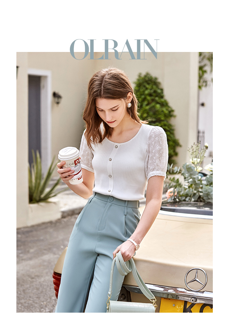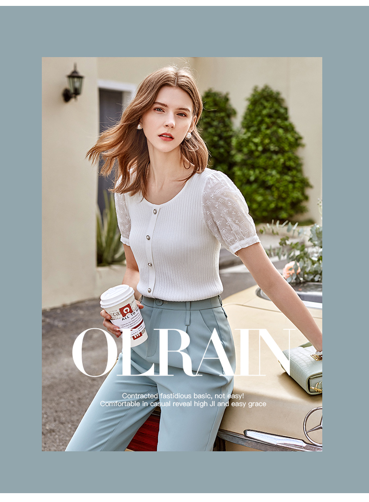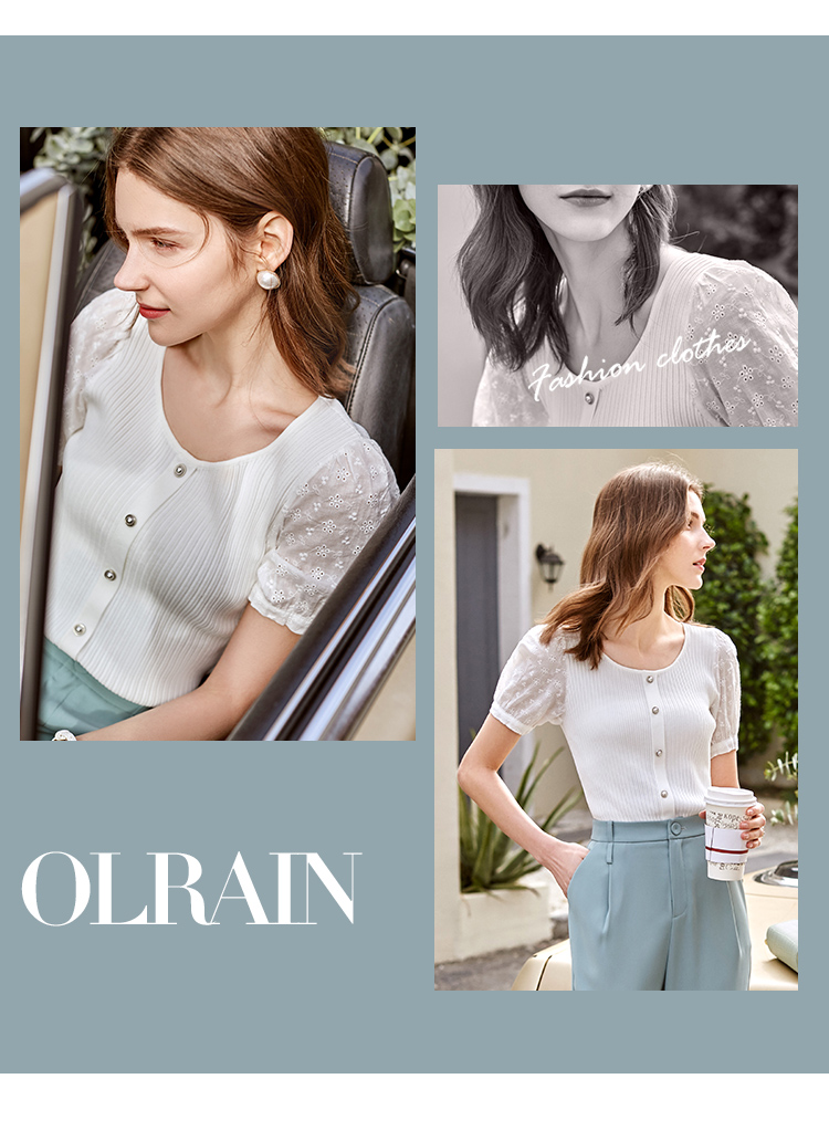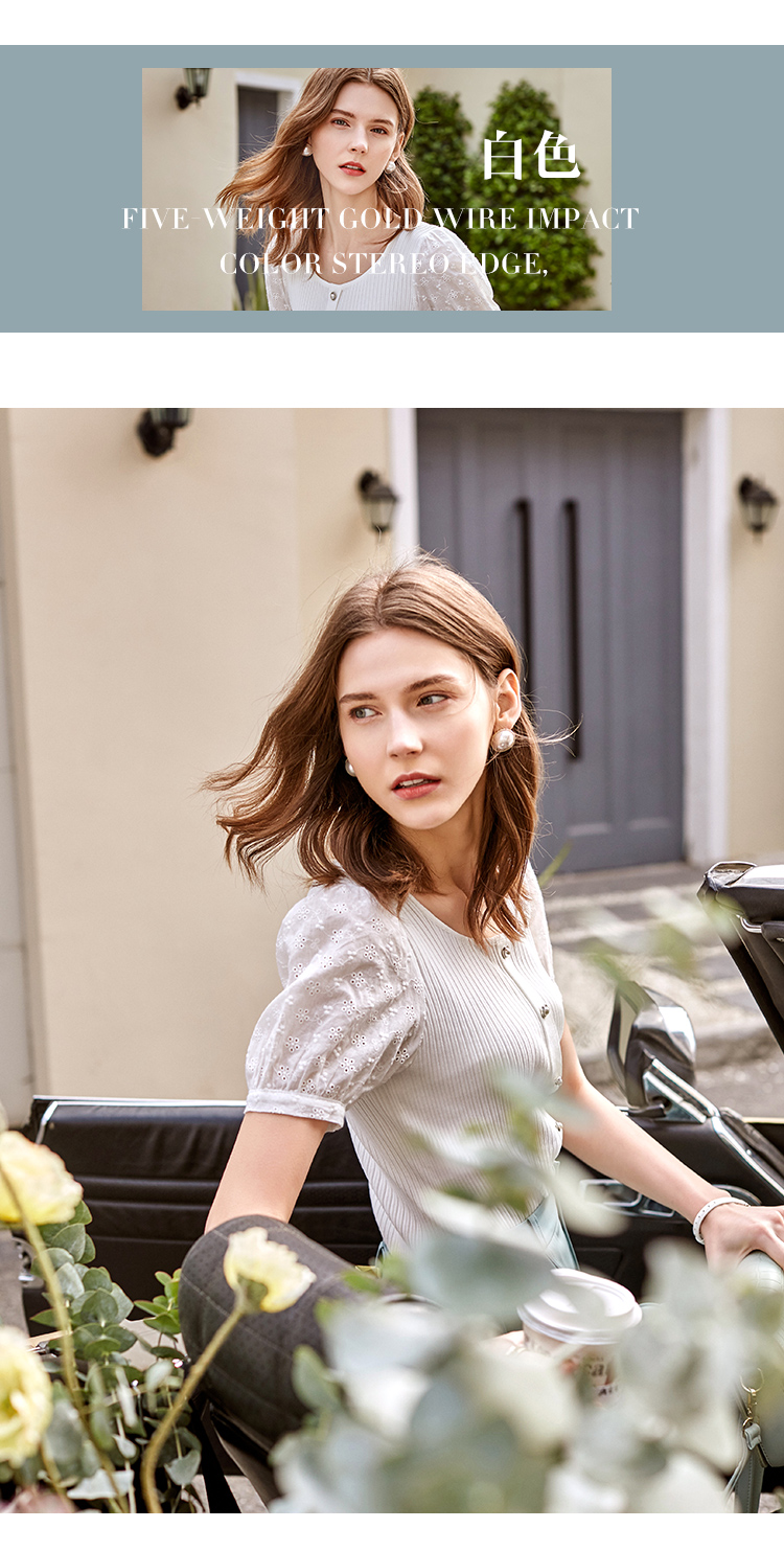 欧芮儿短袖毛针织衫女2021春款修身显瘦提花拼接年轻优雅时髦上衣