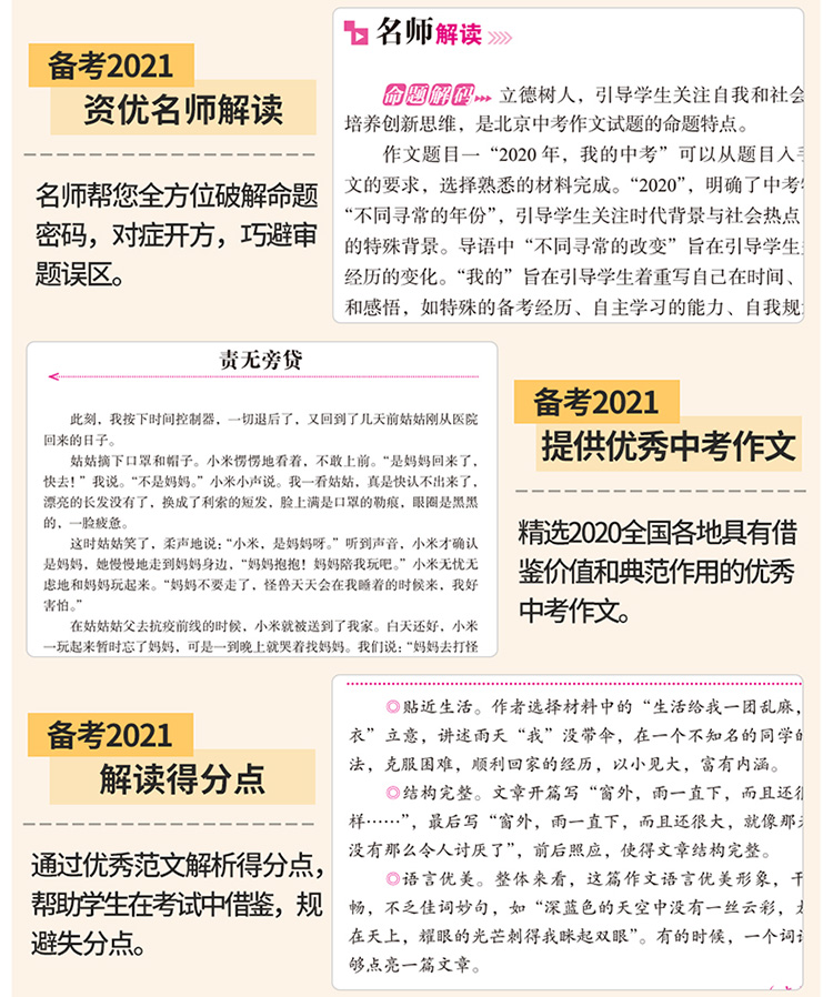 深度解析2020年中考作文题,分析各地命题规律及趋势,通过优秀范文解析得分亮点,帮助学生近距离感受中考。本书由全国各地优秀教师编写,辅导全面、深入,通过解密2020年全国各地中考作文,为2021年中考作文写作提供有效指导和建议。