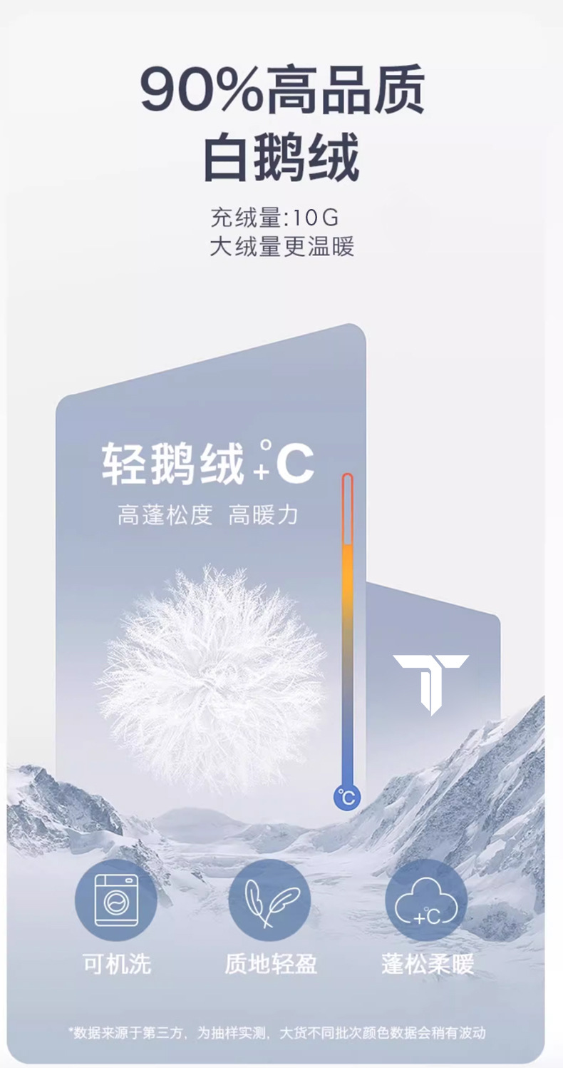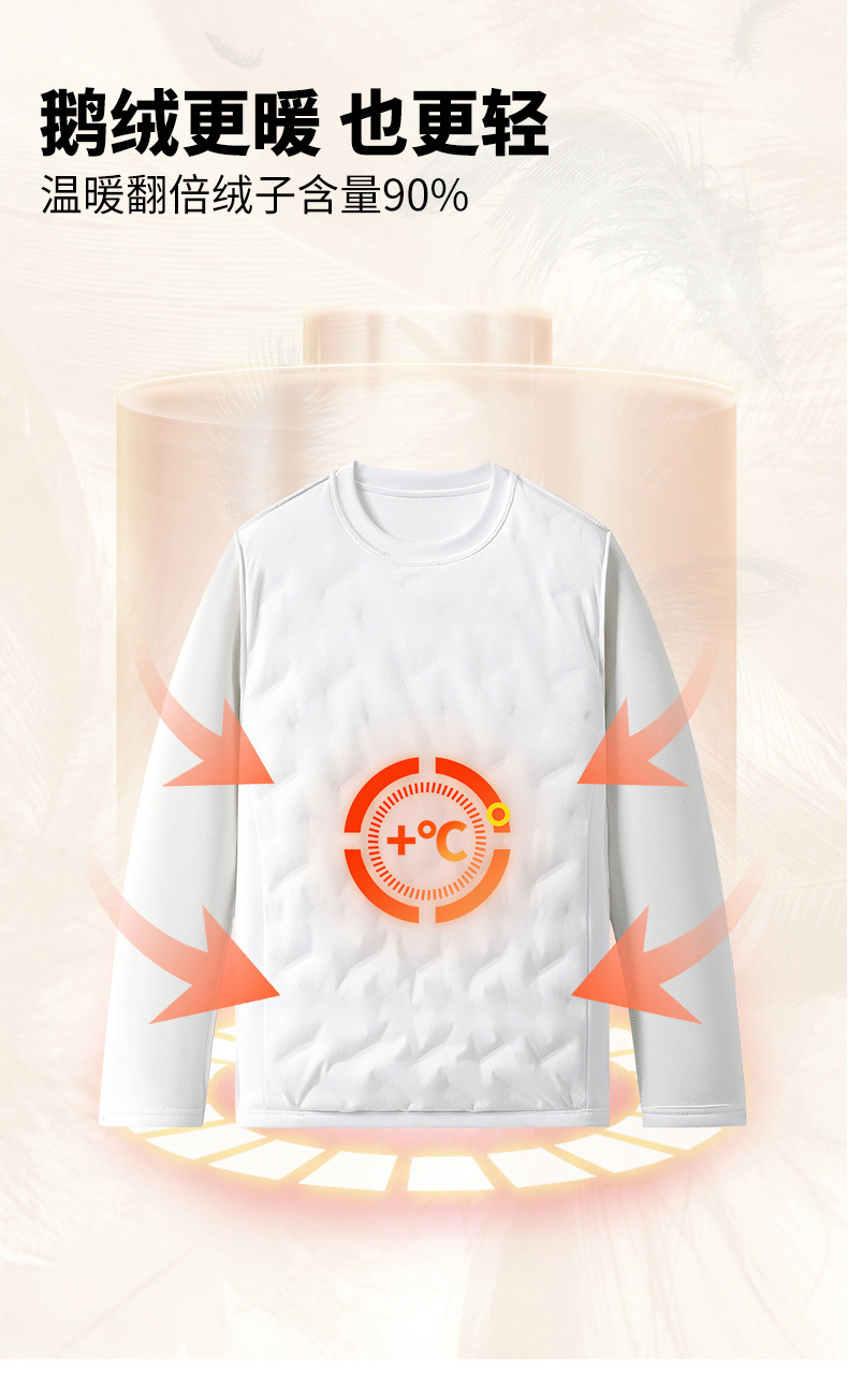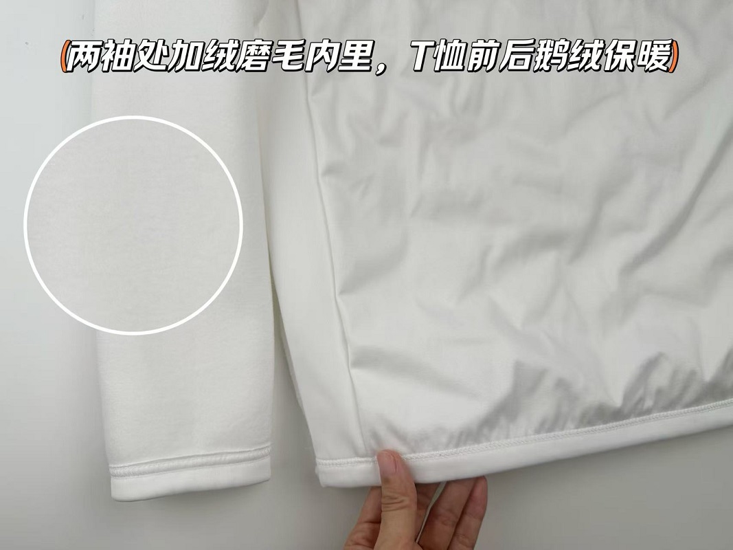 JIAOAIER男女鹅绒T恤,黑科技拒水防污,大身鹅绒+双袖加绒磨毛,分区保暖不臃肿 ;新国标90白鹅绒,一件抵三件可机洗打底衣。