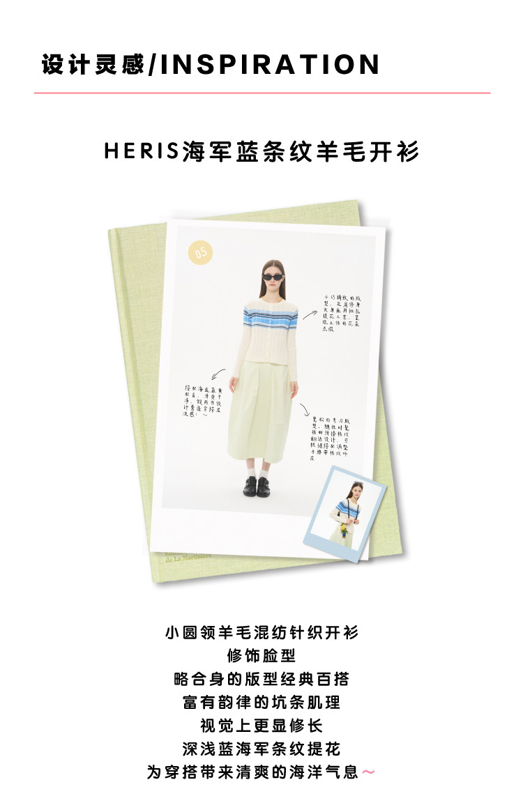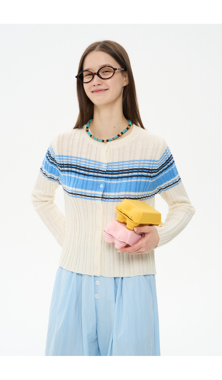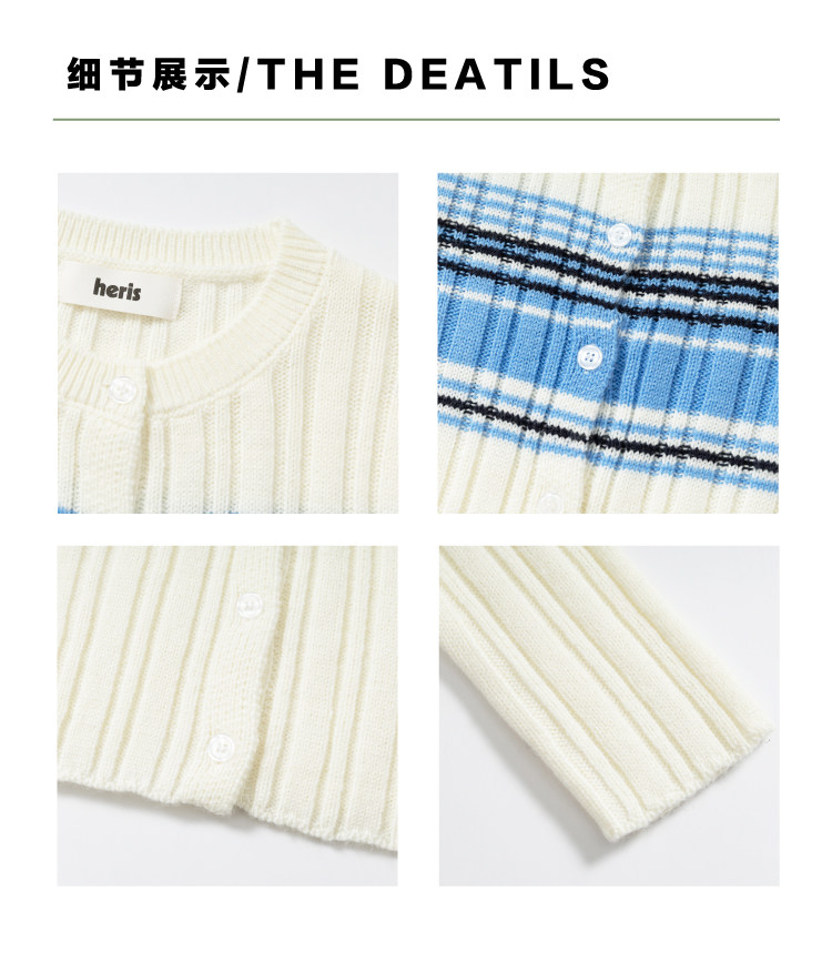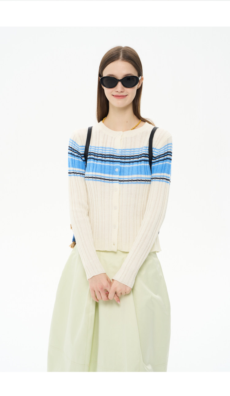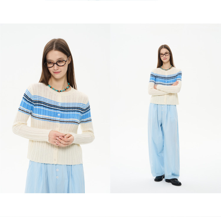 heris/H61101/“航海假日”海军蓝条纹 坑条提花显瘦羊毛针织开衫
