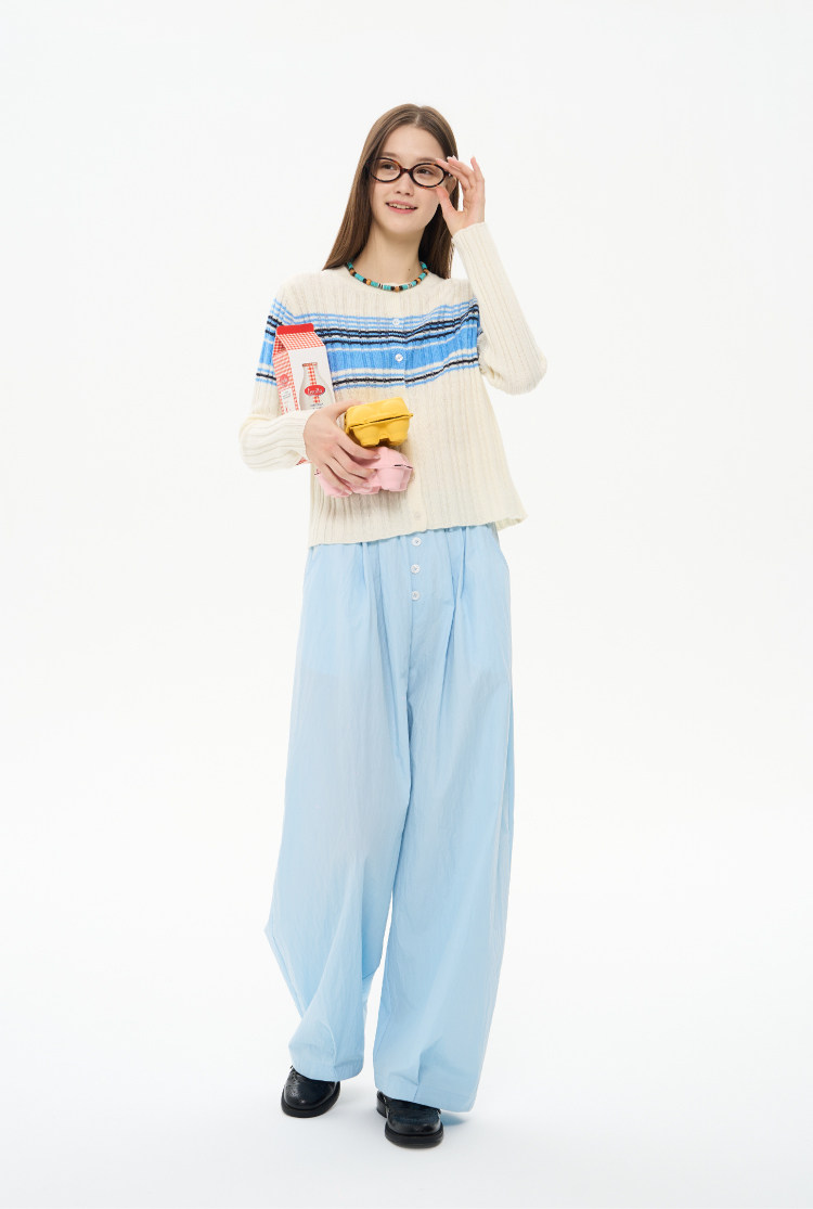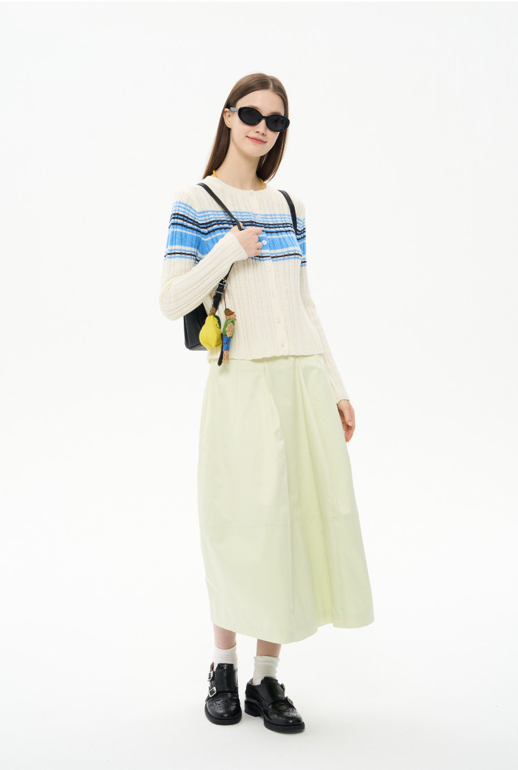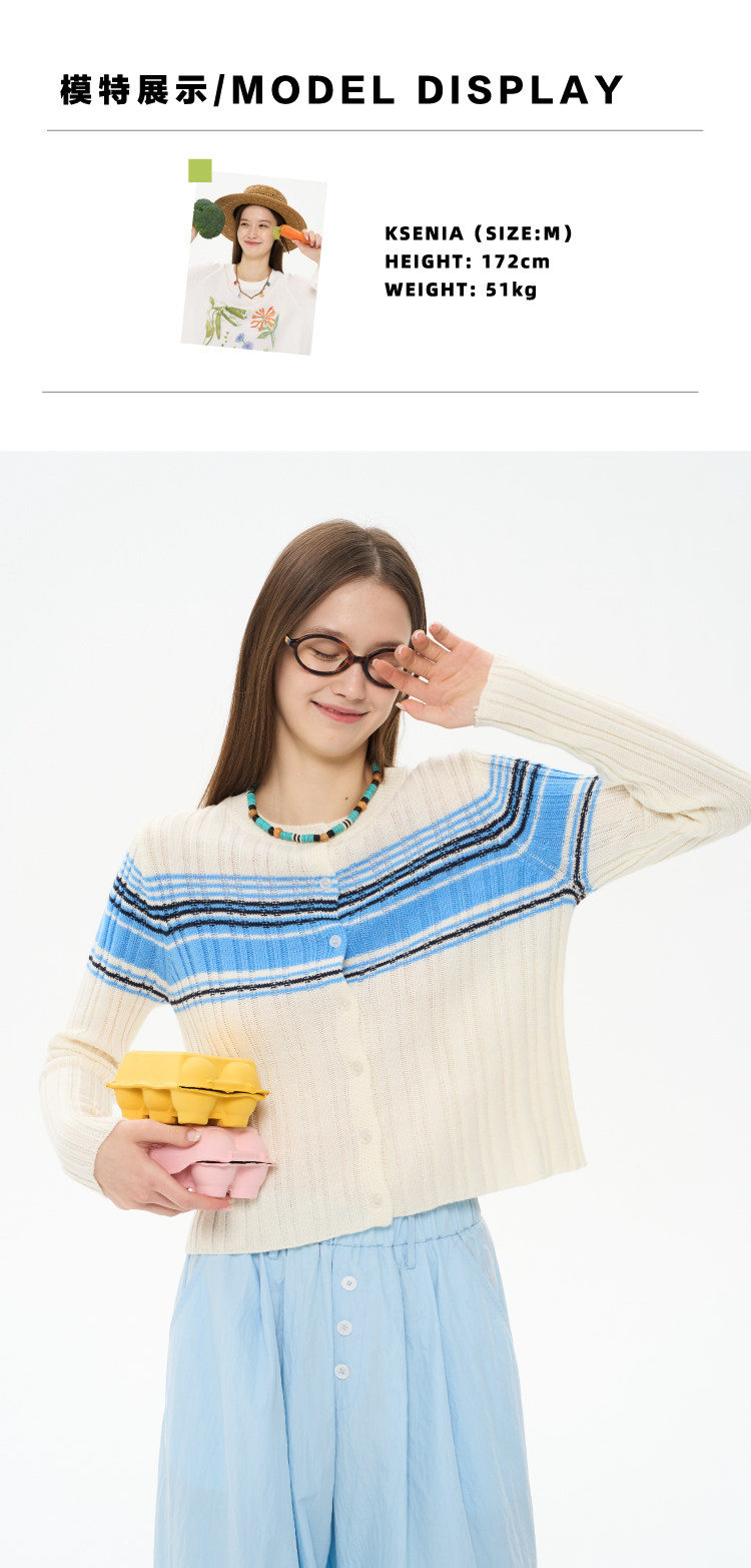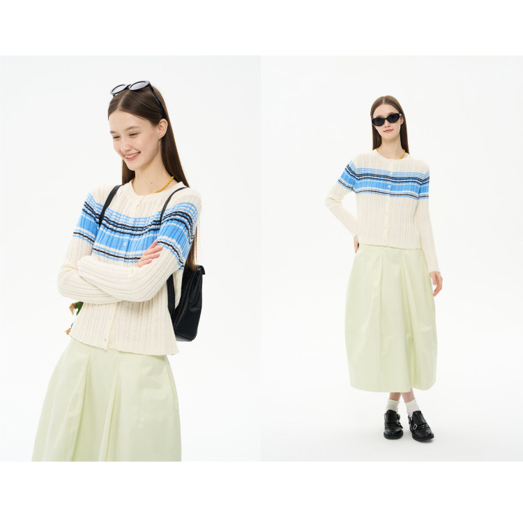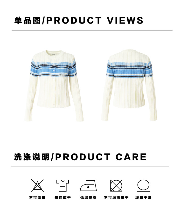 heris/H61101/“航海假日”海军蓝条纹 坑条提花显瘦羊毛针织开衫
