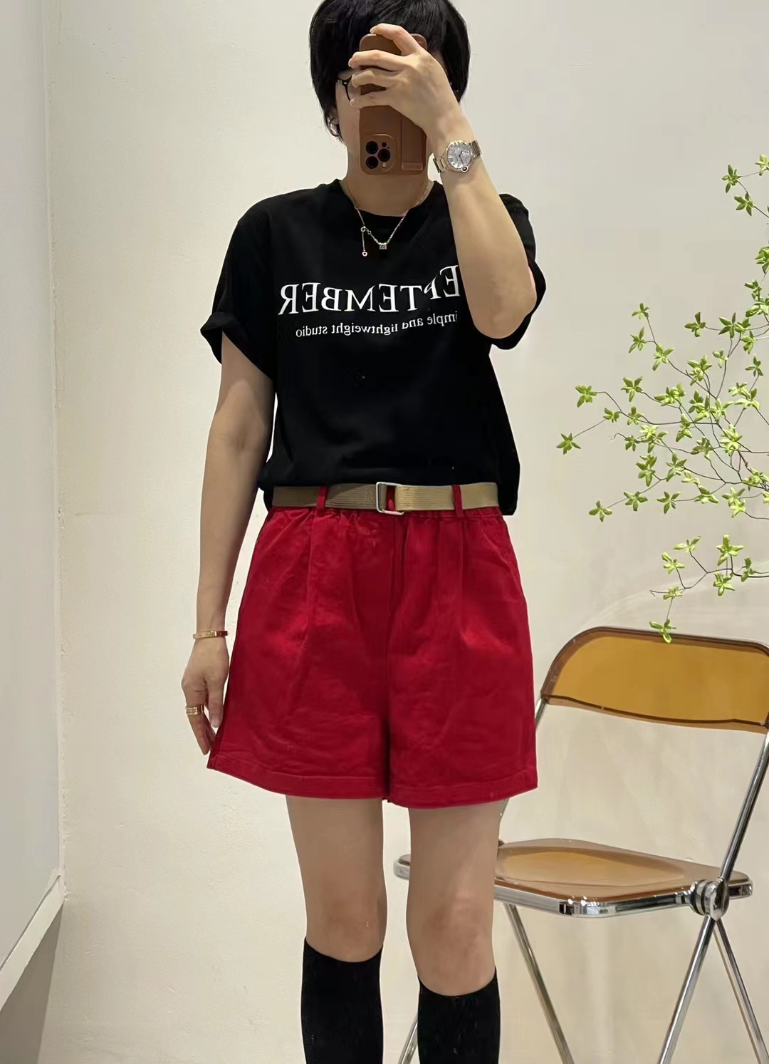 3633 # 桔 红 M L 新款松紧纯色五分休闲裤 显瘦百搭复古百搭