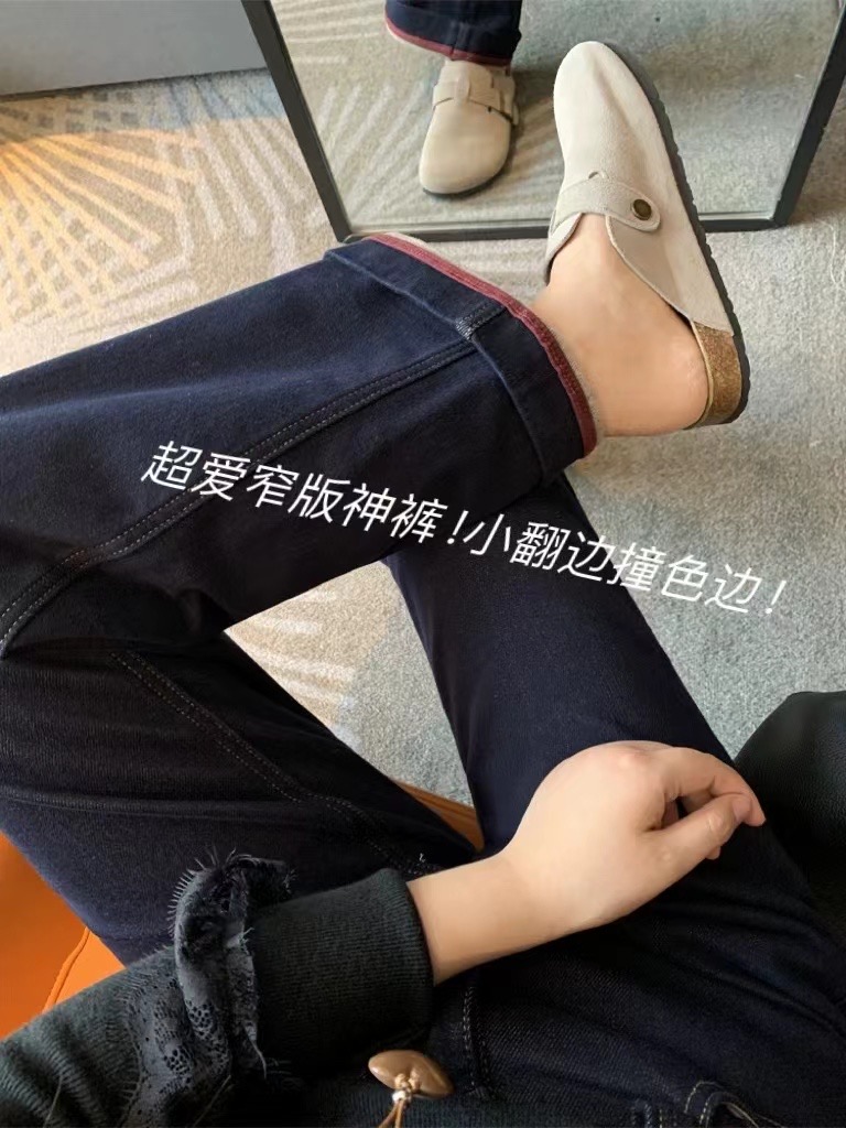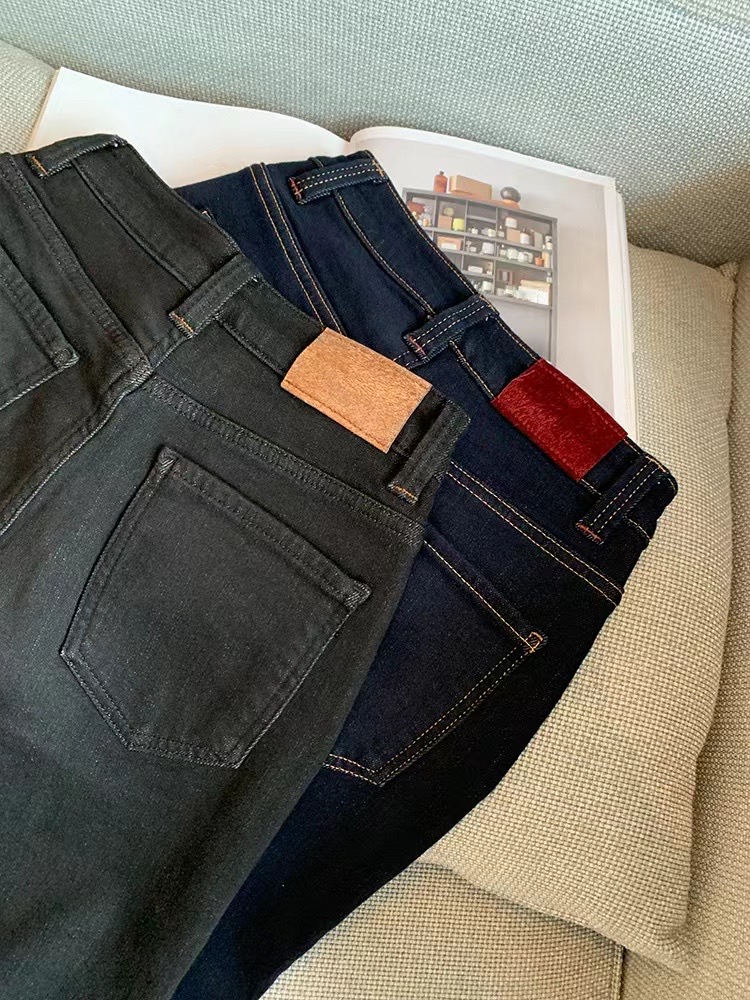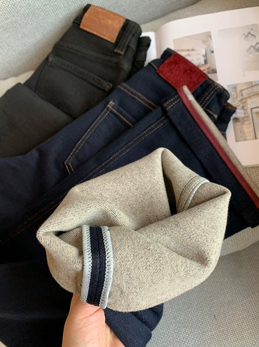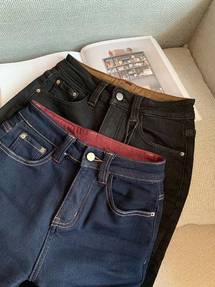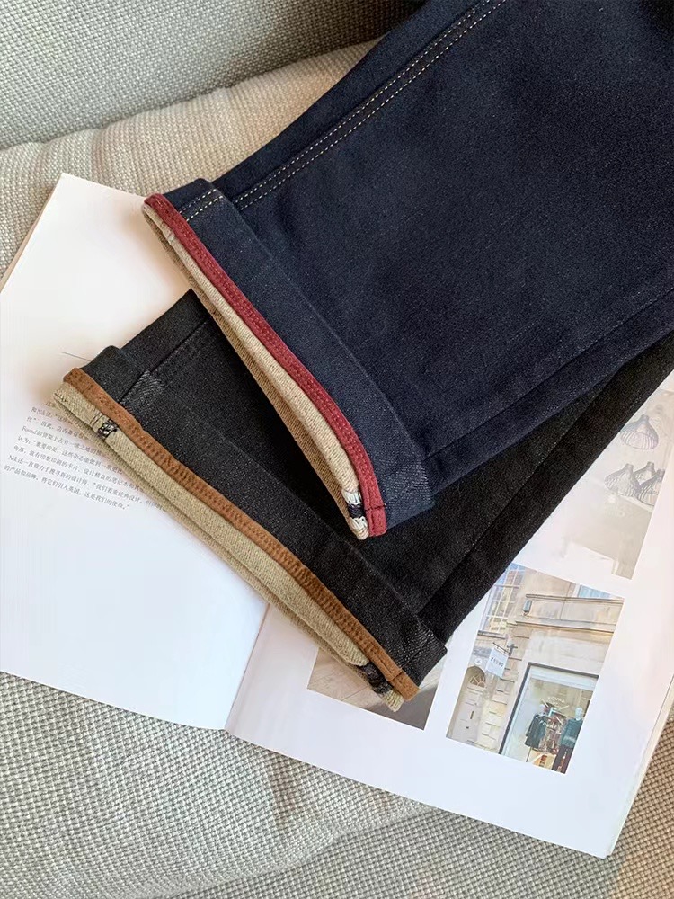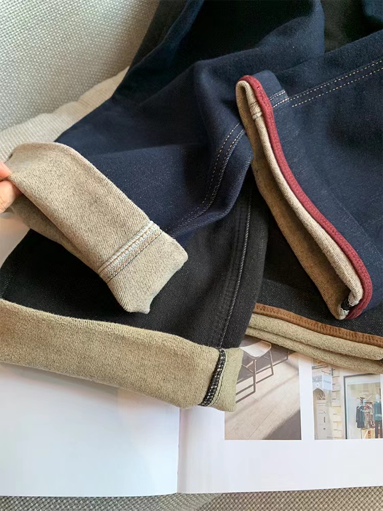 老米优品🎈3-5天!薄绒款!防褪色工艺《复古撞色设计植绒窄版直筒牛仔裤》柔软,微弹,温暖,bai搭!K241121B