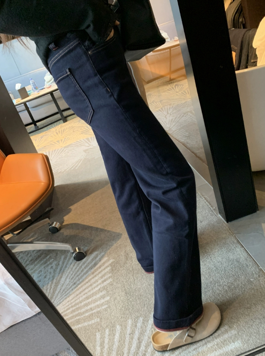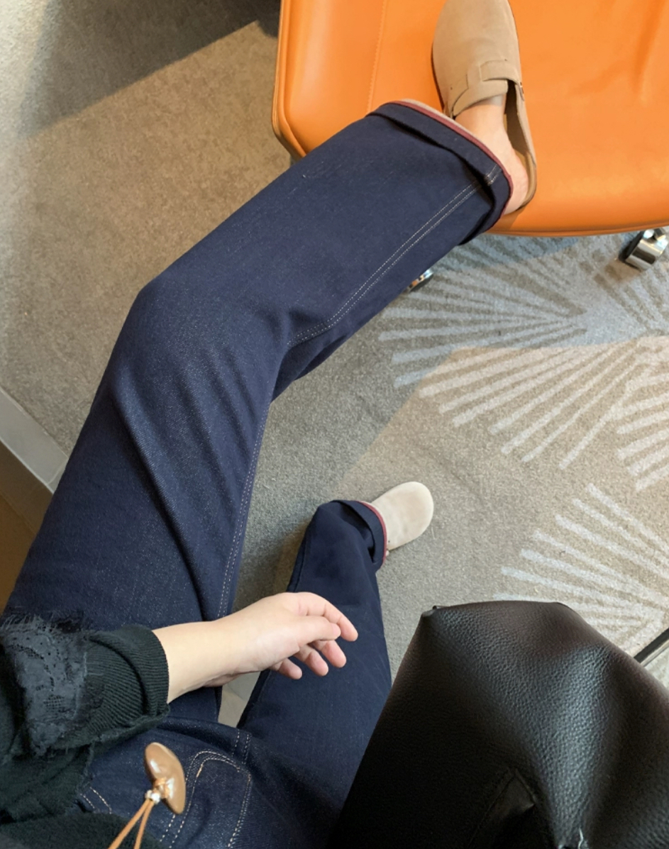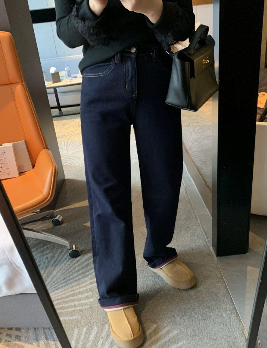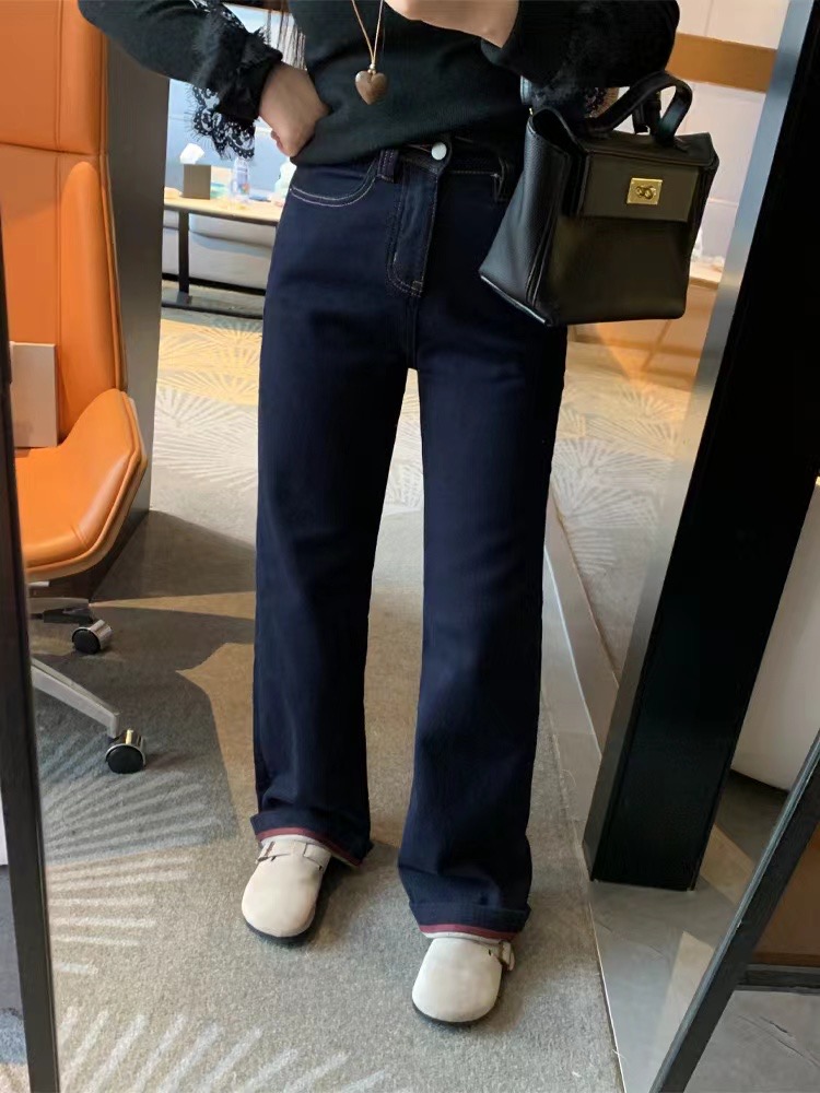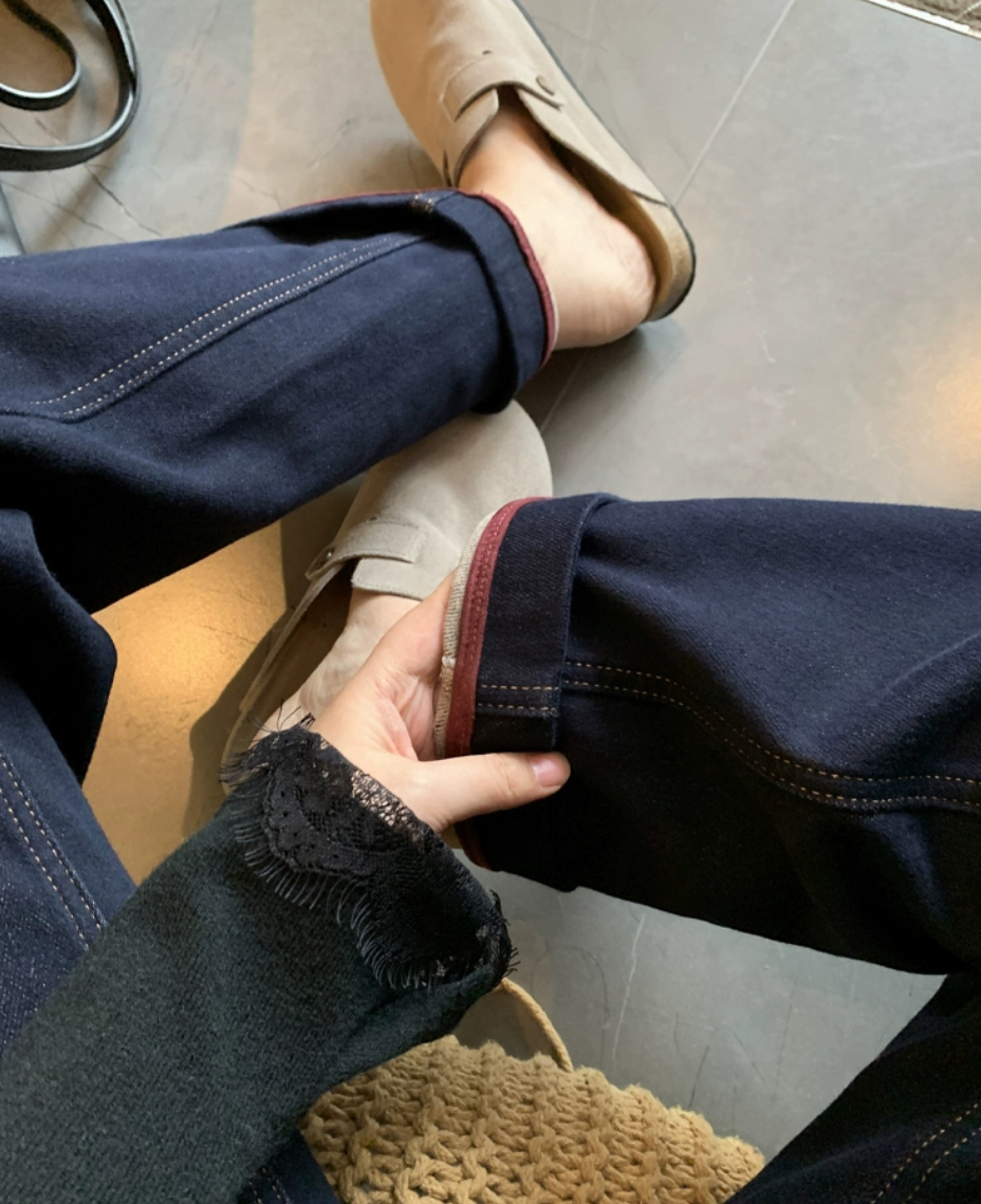 老米优品🎈3-5天!薄绒款!防褪色工艺《复古撞色设计植绒窄版直筒牛仔裤》柔软,微弹,温暖,bai搭!K241121B