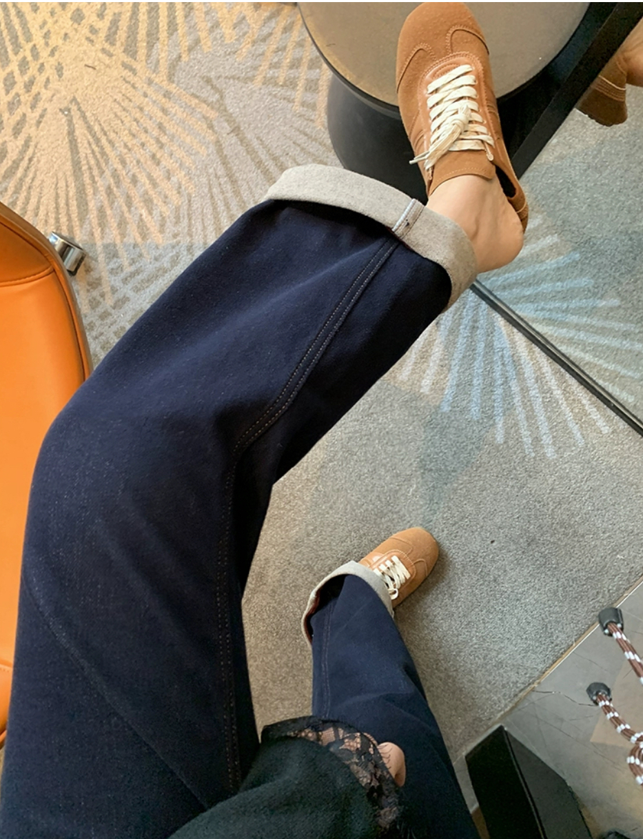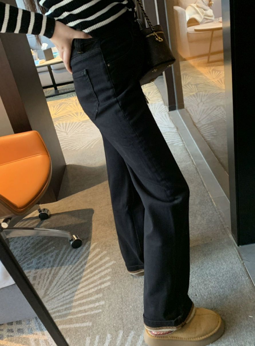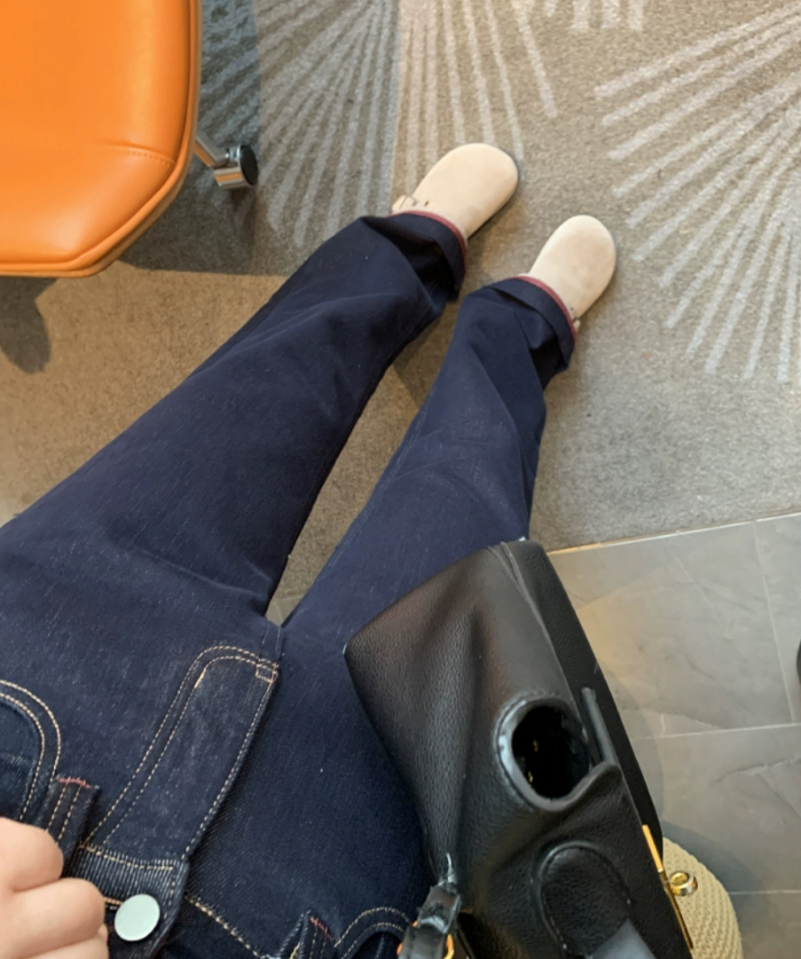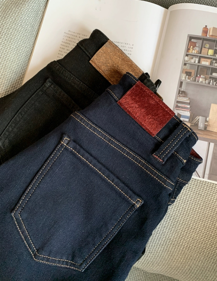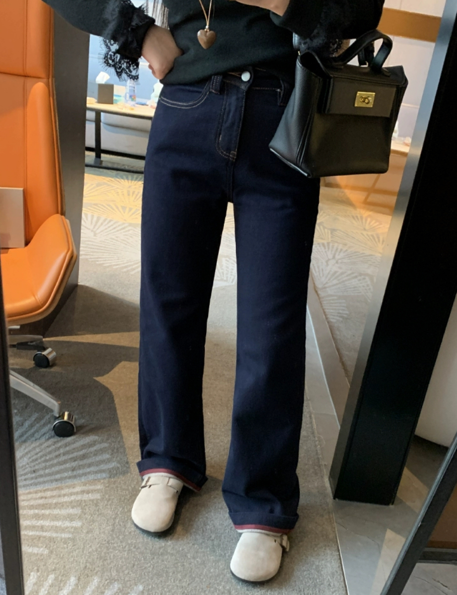 老米优品🎈3-5天!薄绒款!防褪色工艺《复古撞色设计植绒窄版直筒牛仔裤》柔软,微弹,温暖,bai搭!K241121B