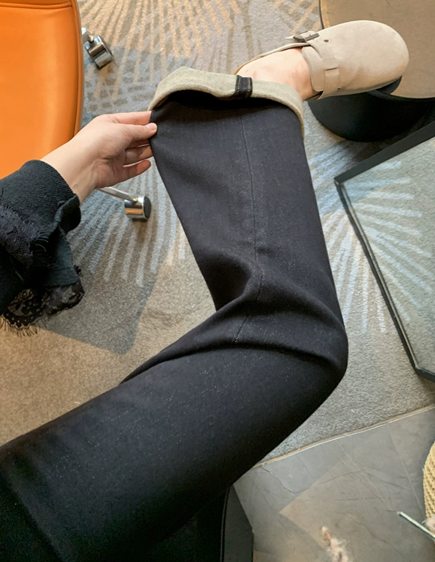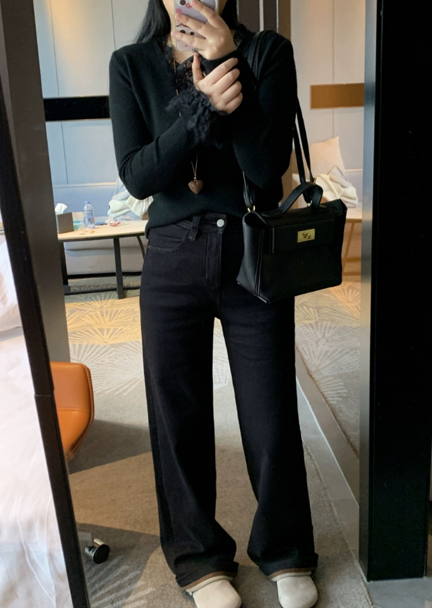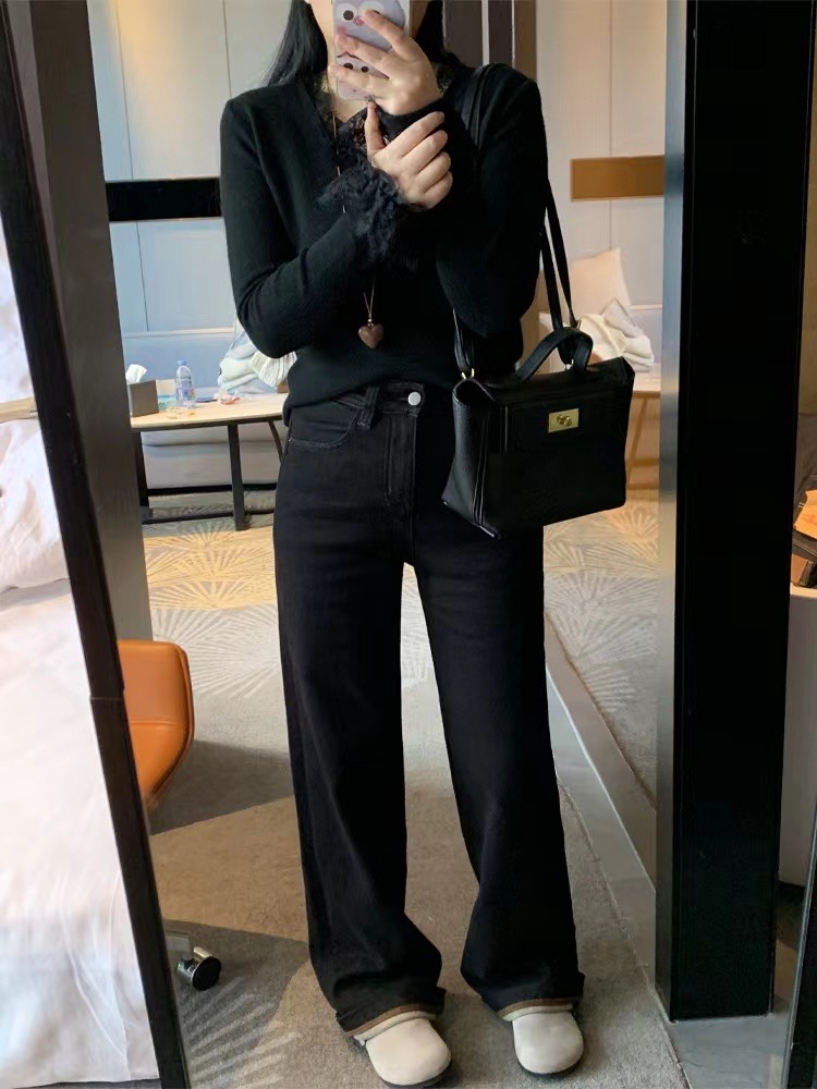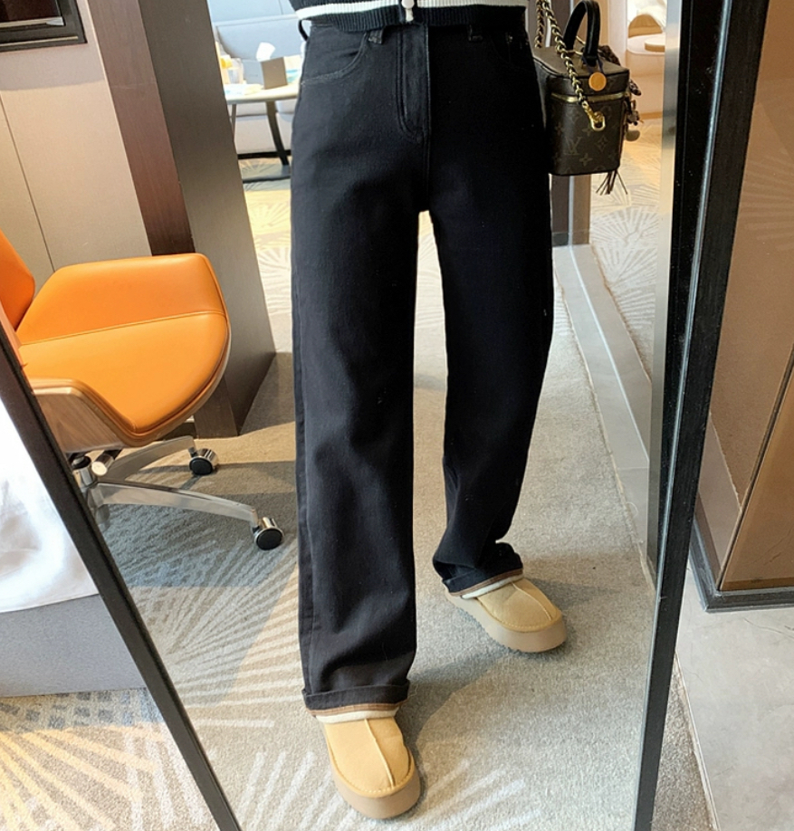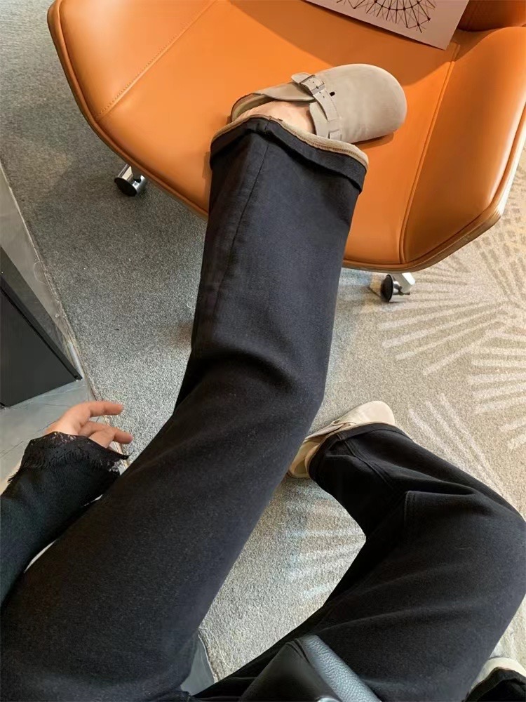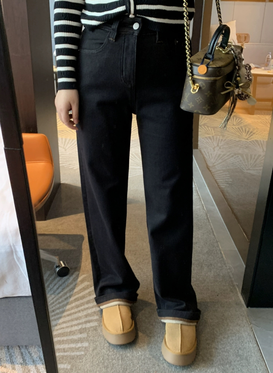 老米优品🎈3-5天!薄绒款!防褪色工艺《复古撞色设计植绒窄版直筒牛仔裤》柔软,微弹,温暖,bai搭!K241121B