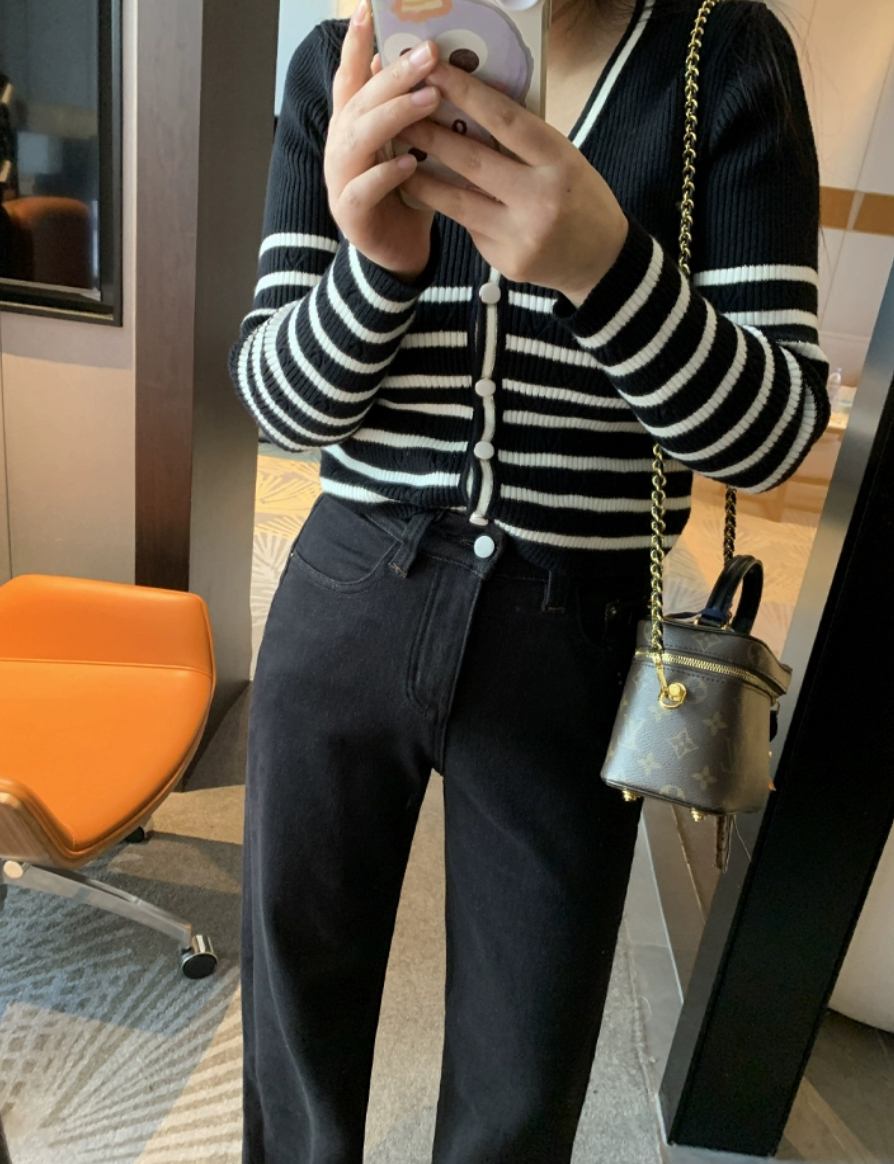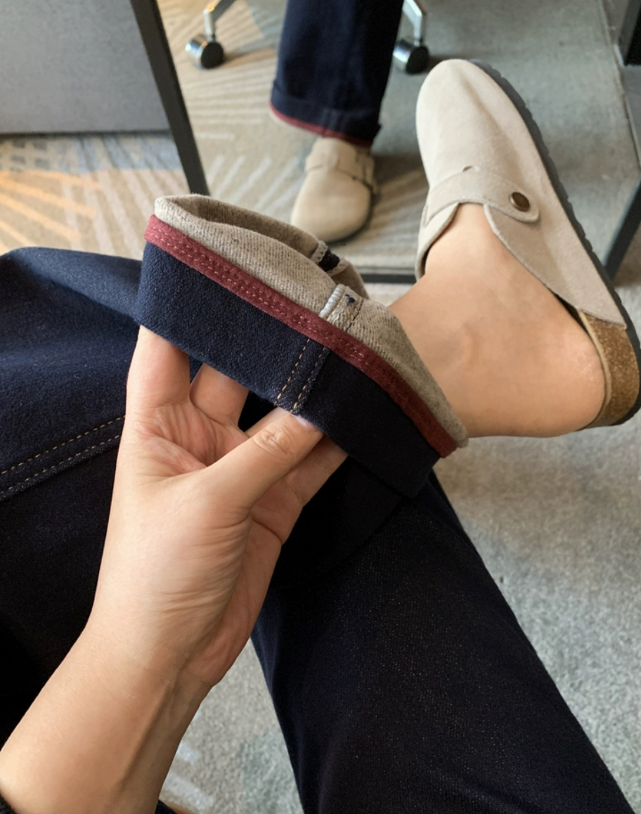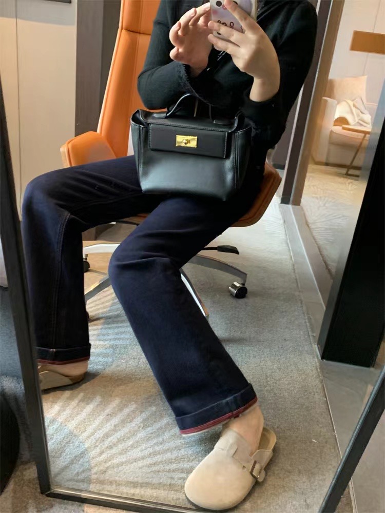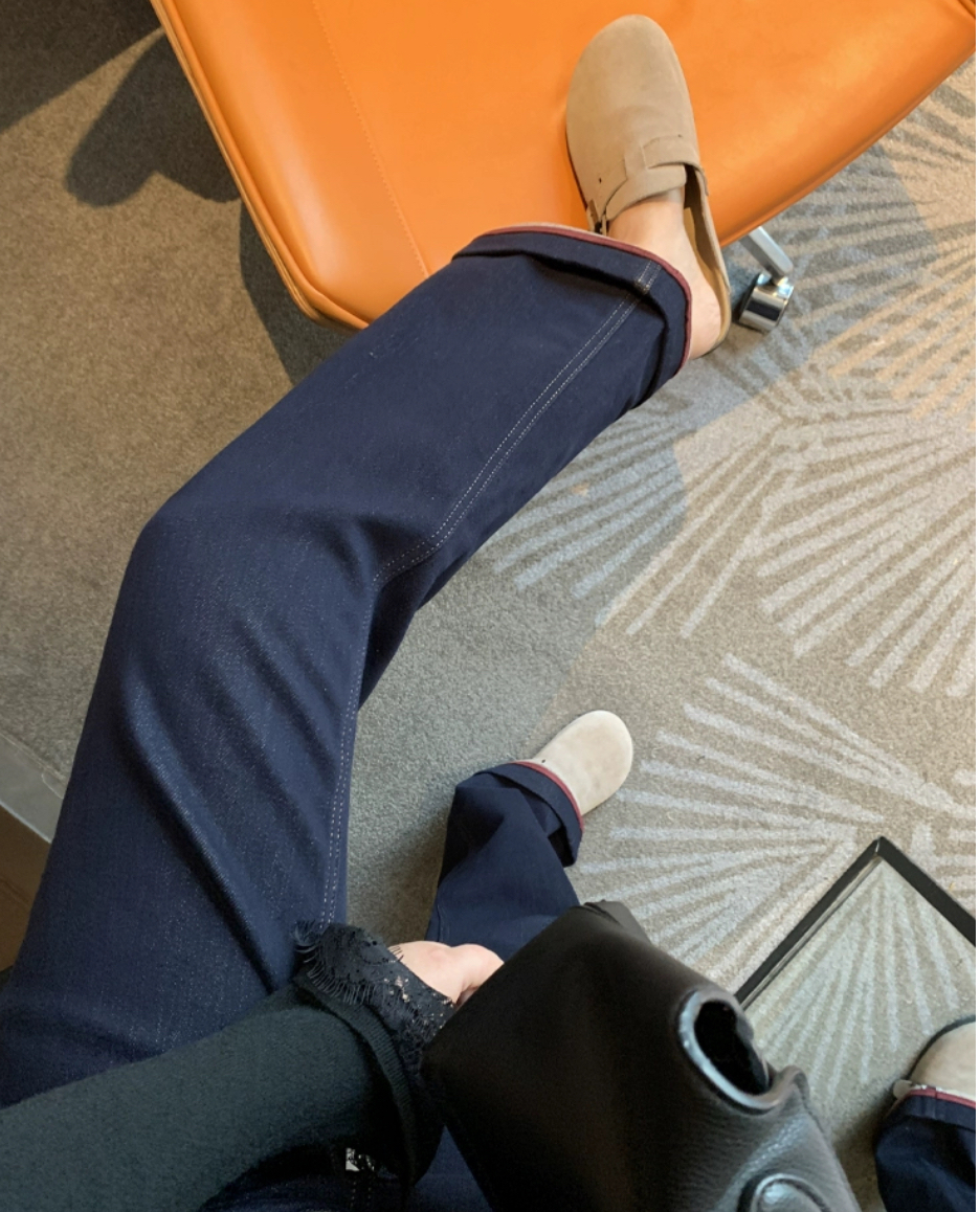 继续上秋冬牛仔裤咯,这款复古撞色设计也很棒啊!整条裤子窄版小直筒裁剪,好看,显瘦。裤腿卷一卷,亮点就来了~