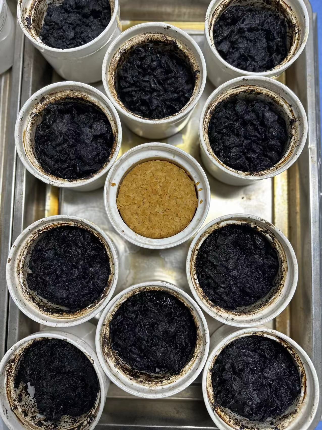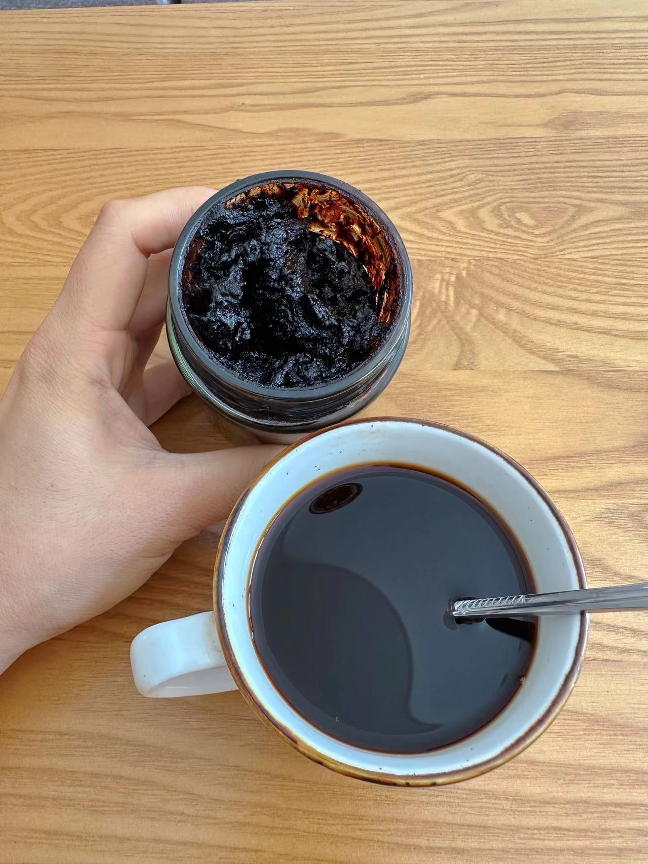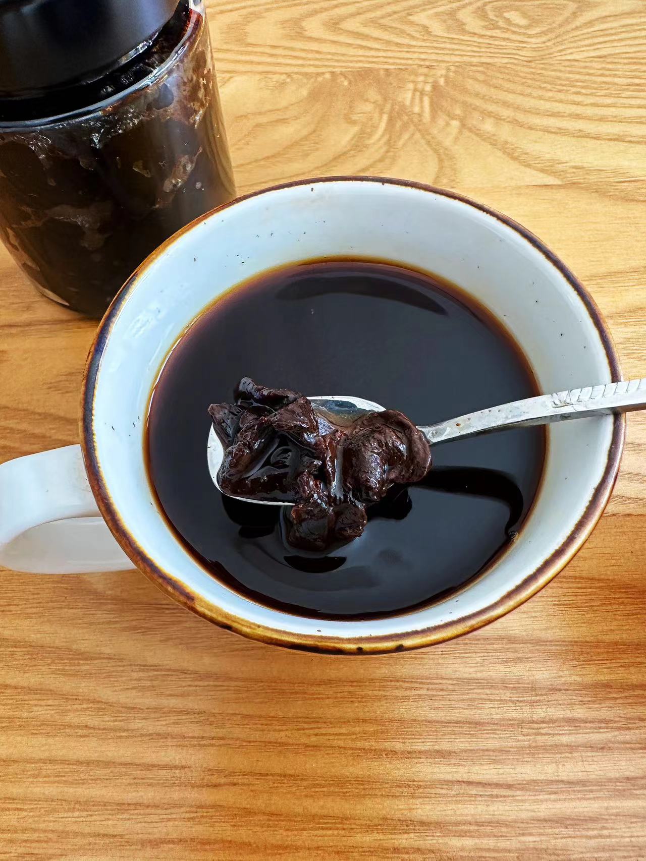 前几天拿到样品,我就太惊喜了!膏体的颜色是那种黑黝黝的,像炭一样黑,这就是品质良好的玉灵膏应该有的质地。蒸制的时间足,才会呈现出这样的颜色啊。棕色褐色的玉灵膏,那是不对的。