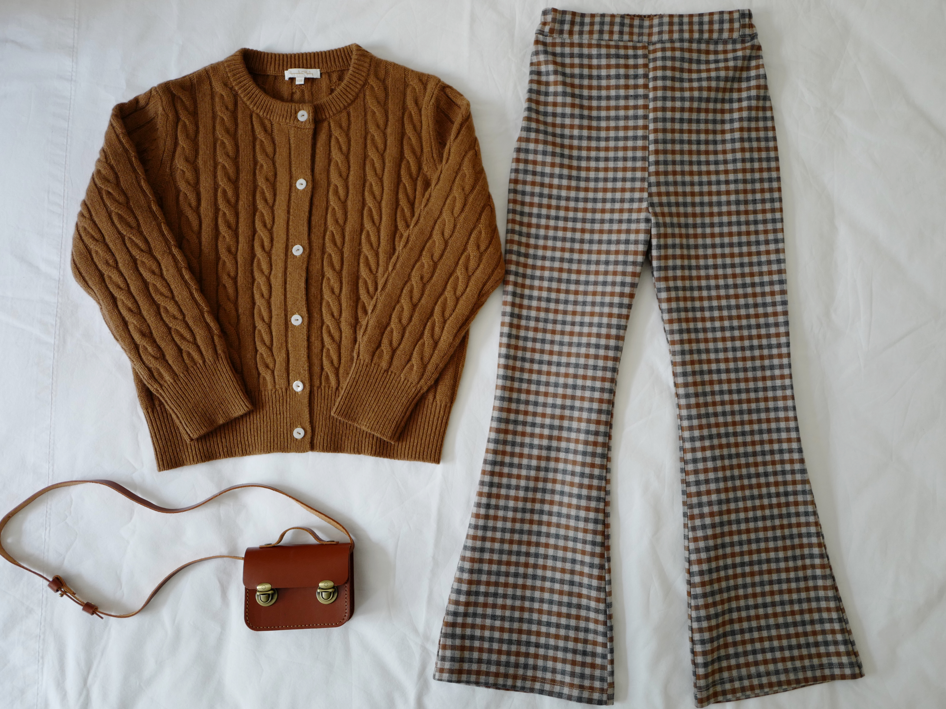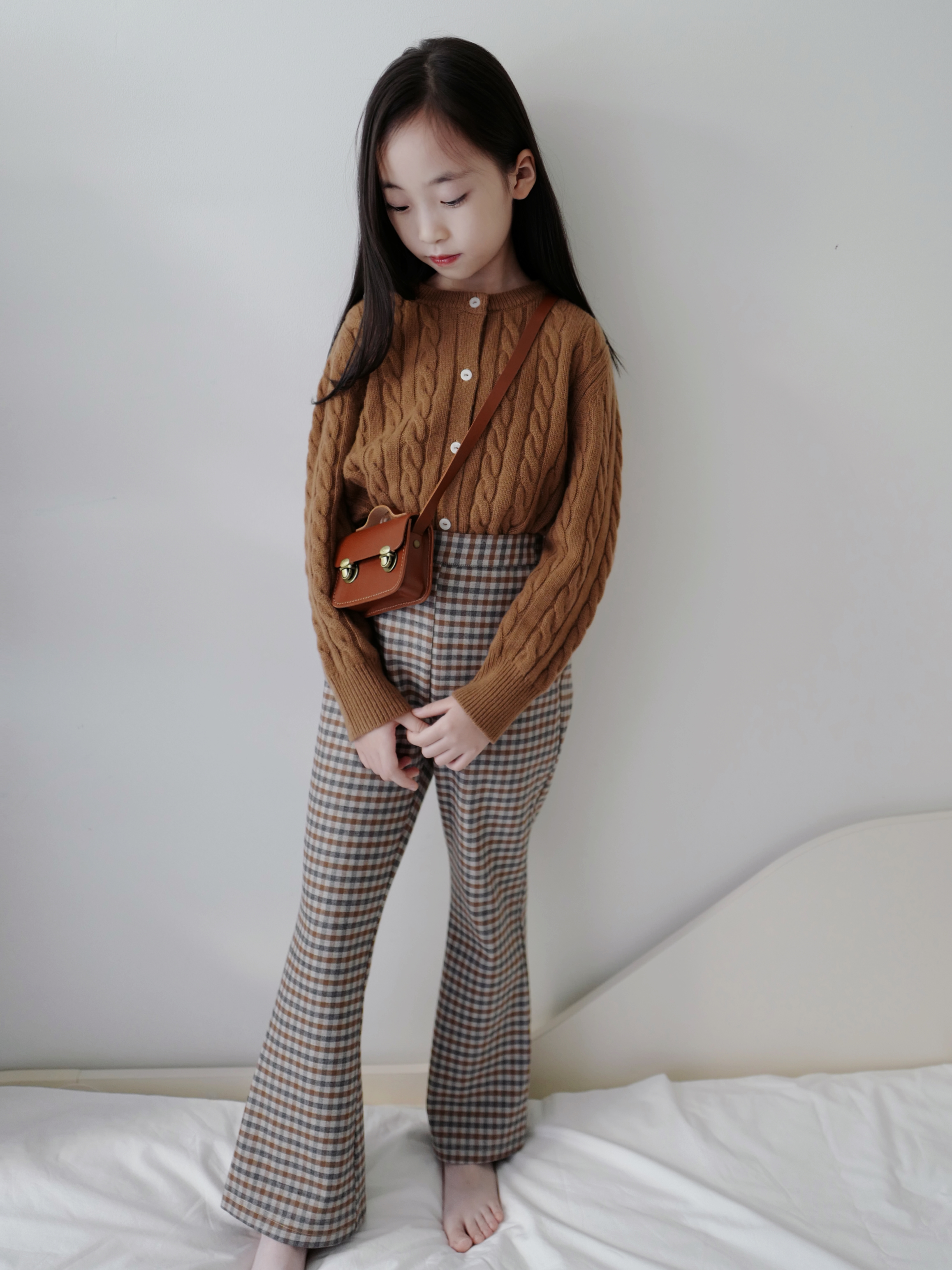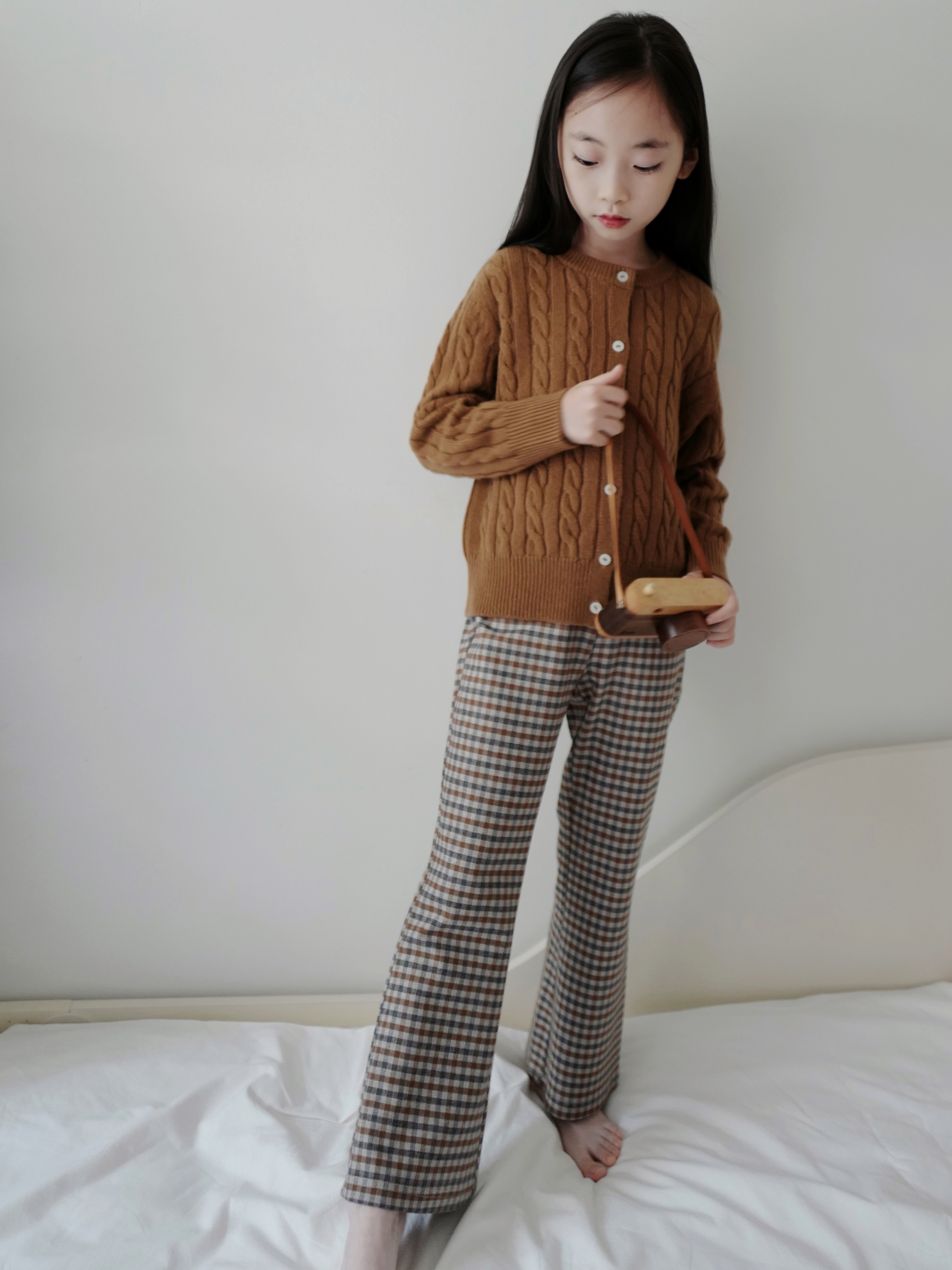 现货 / ECLECTIC&STYLISH | 亲子款 复古巧克力麻花羊绒开衫+ 时髦格纹薄绒微喇长裤