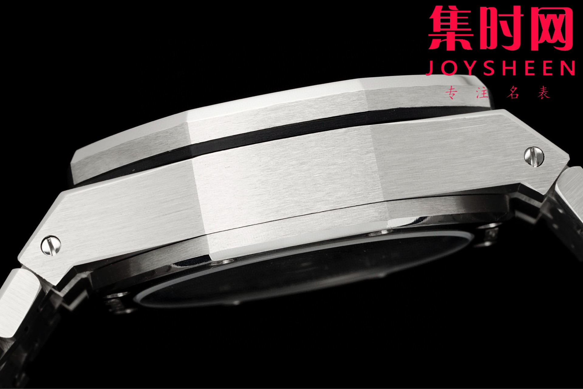 3、表径41mm精钢表壳。一如既往,它依然沿用标志性的八角形造型,搭配八角形表圈和功能性扣件(从表背固定),变化包括表圈和表背的抛光倒角更宽,表背与中层表壳更加齐平,从而提升了人体工程学。