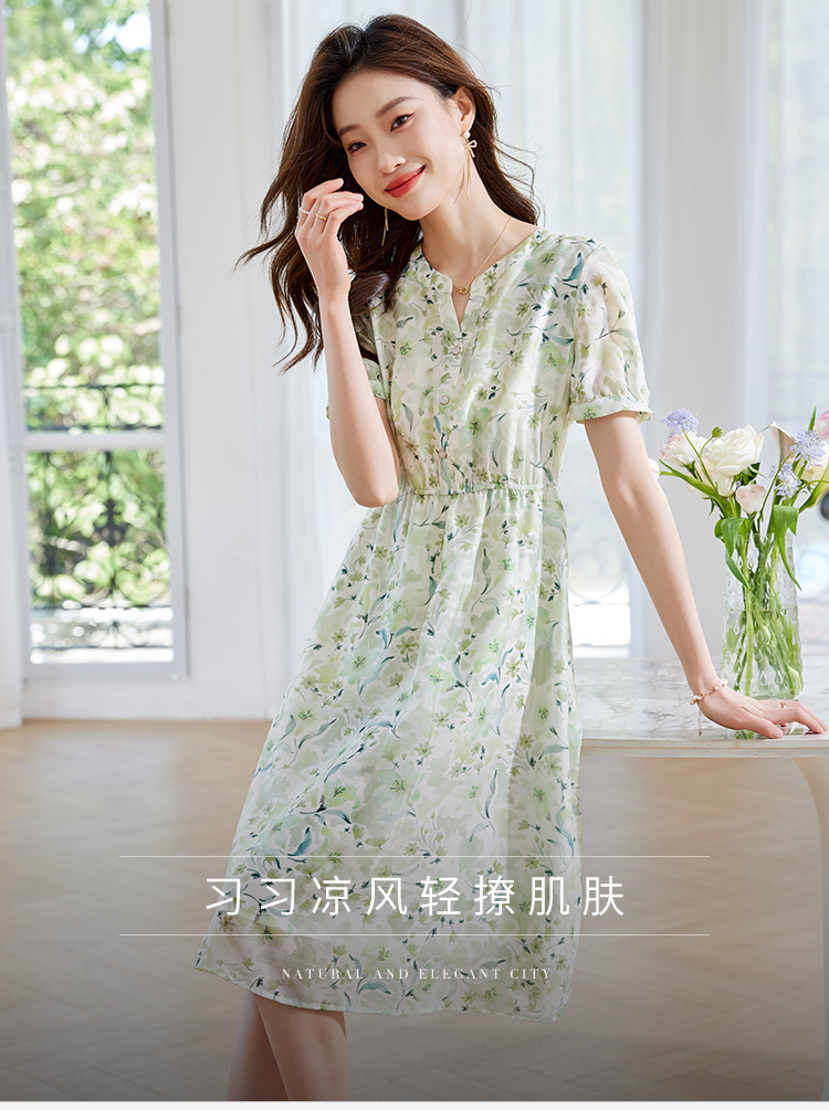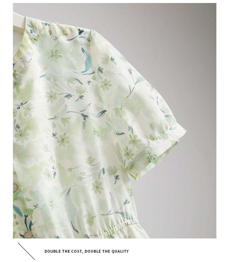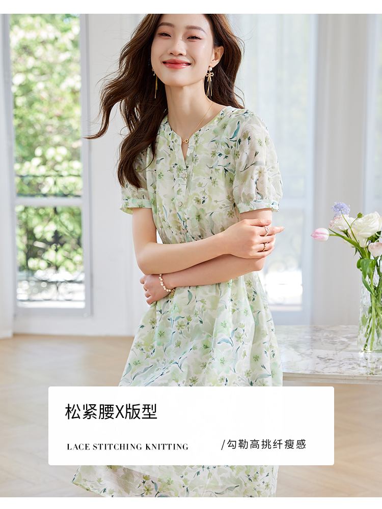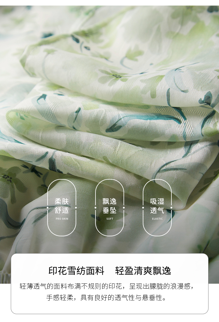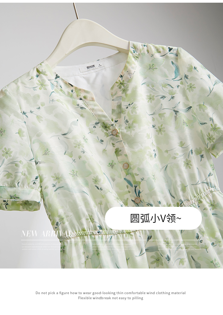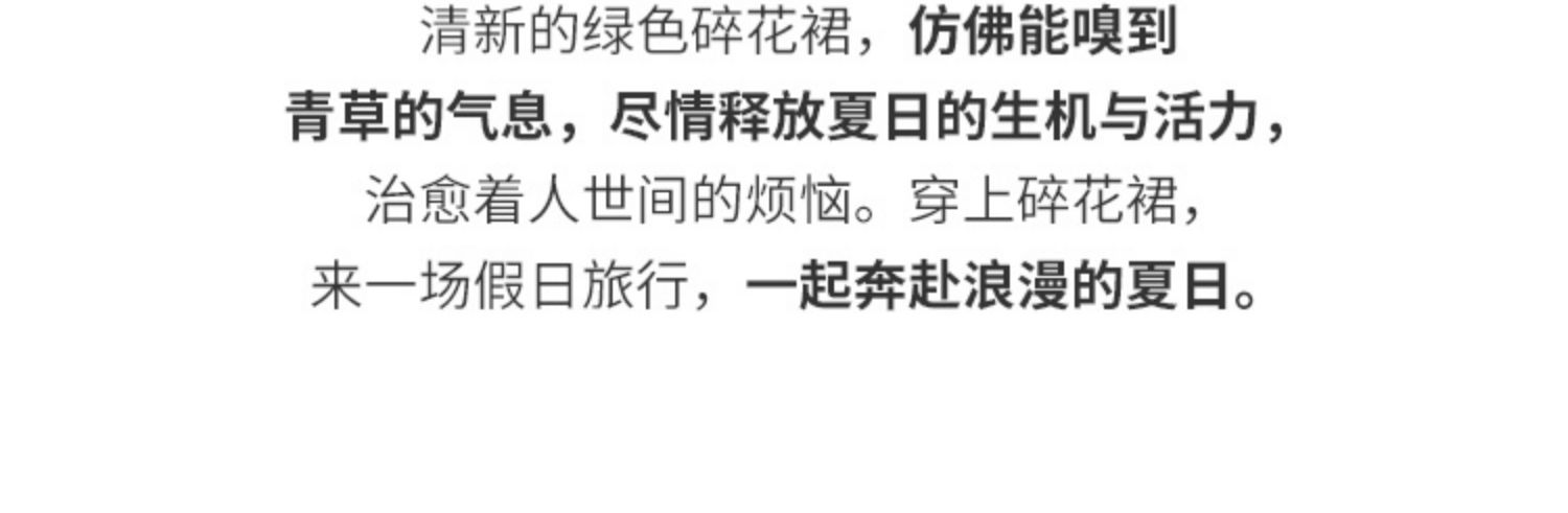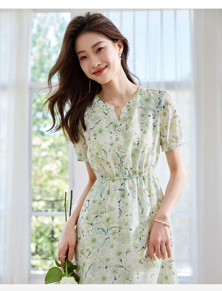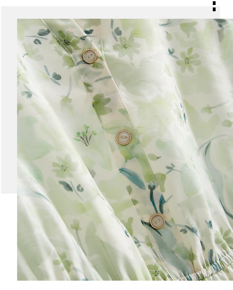 【专属特价】熙世界小清新绿色碎花连衣裙女夏温柔法式雪纺A字裙子