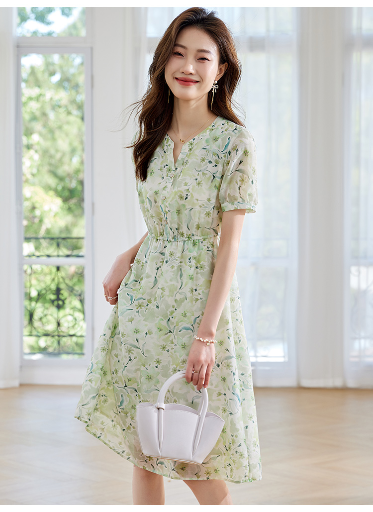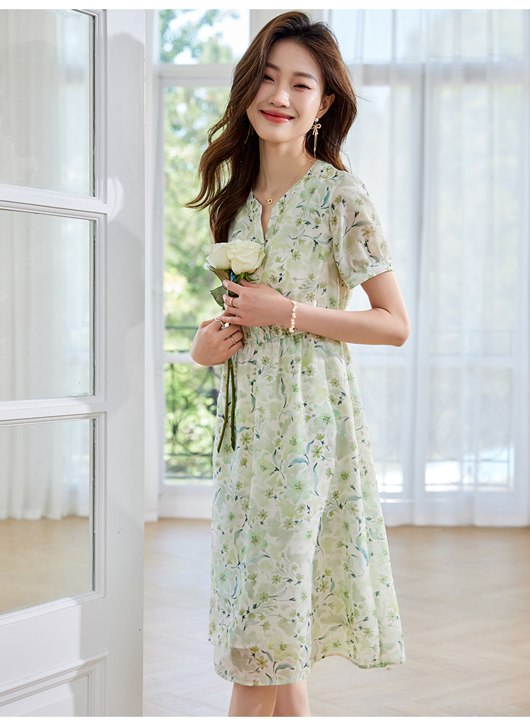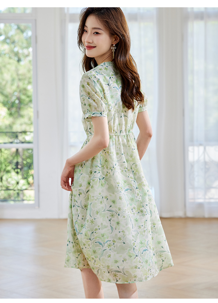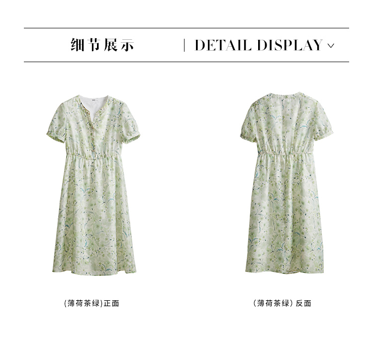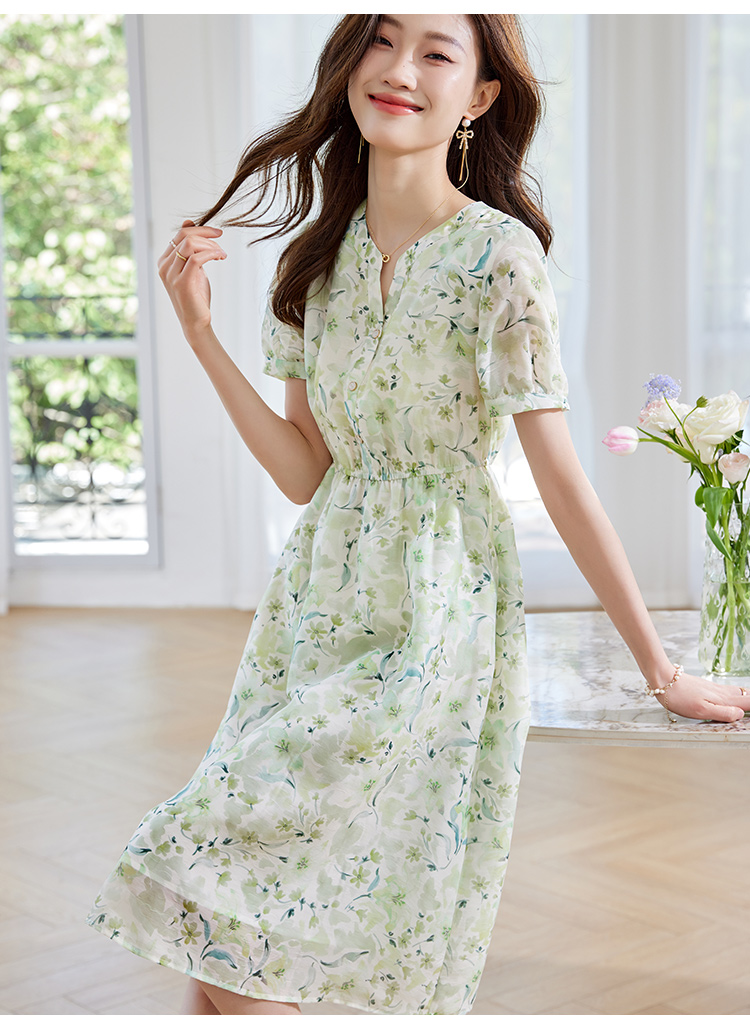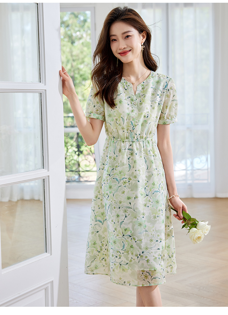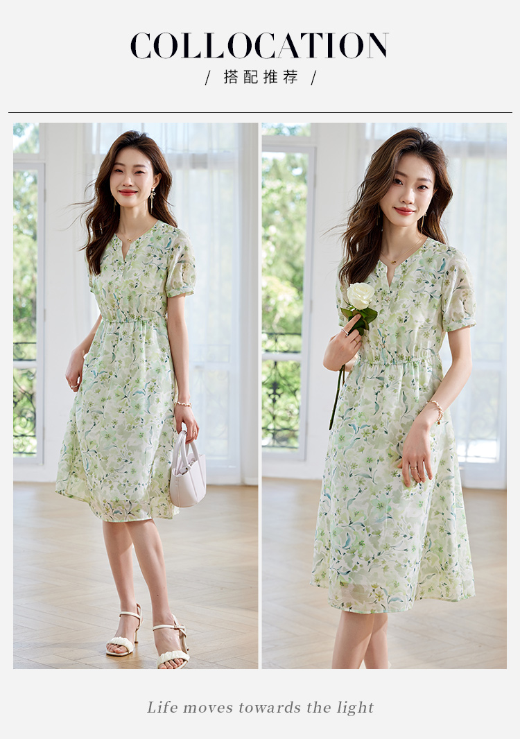 【专属特价】熙世界小清新绿色碎花连衣裙女夏温柔法式雪纺A字裙子