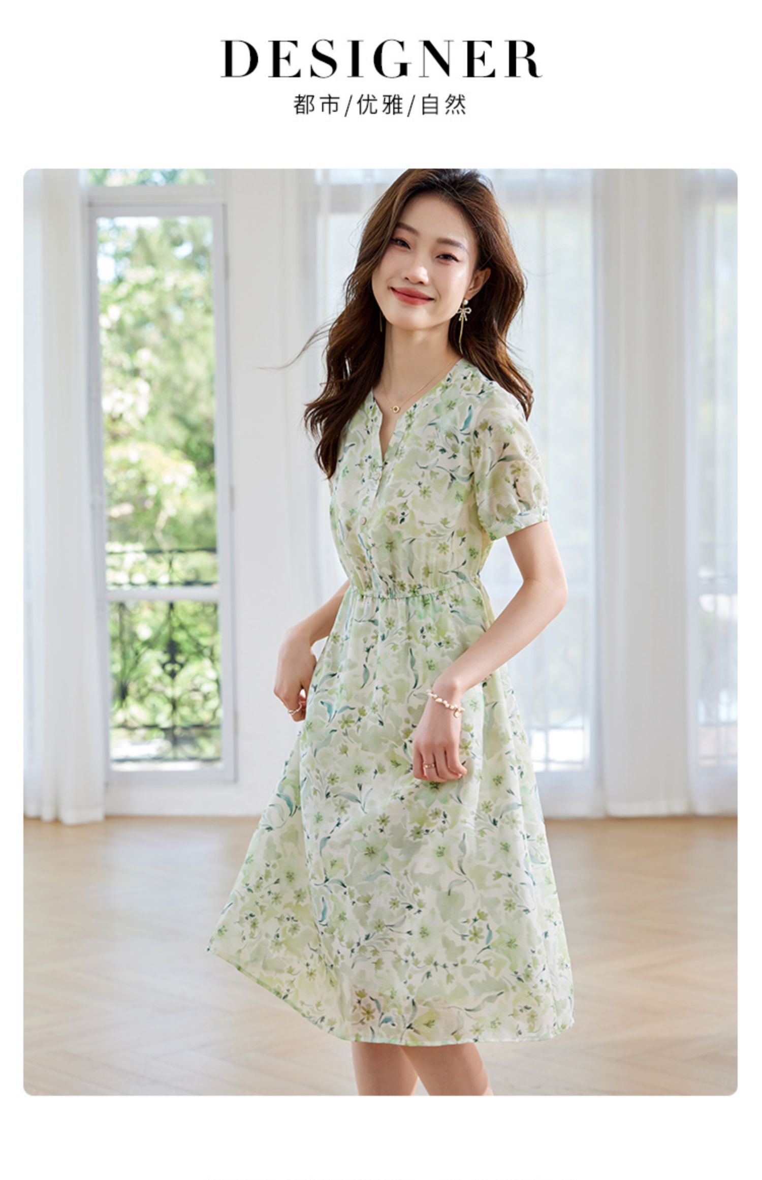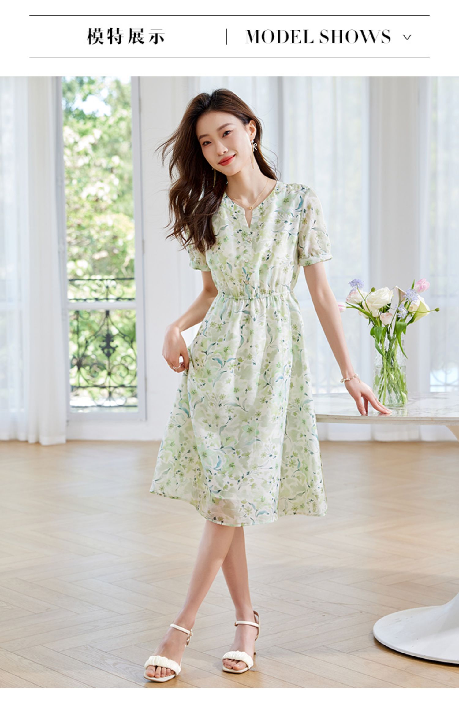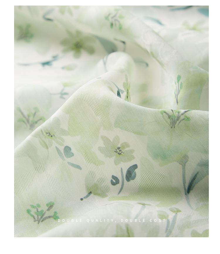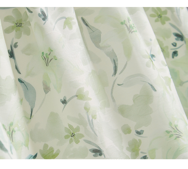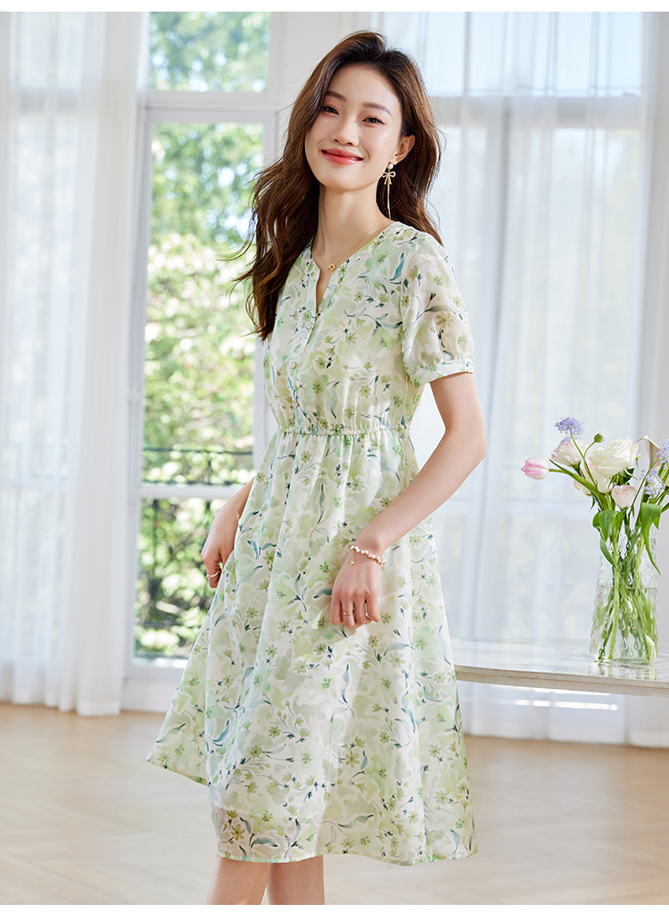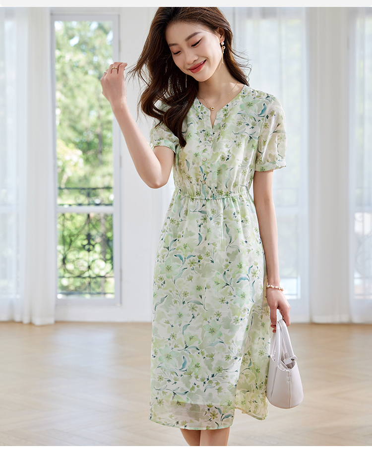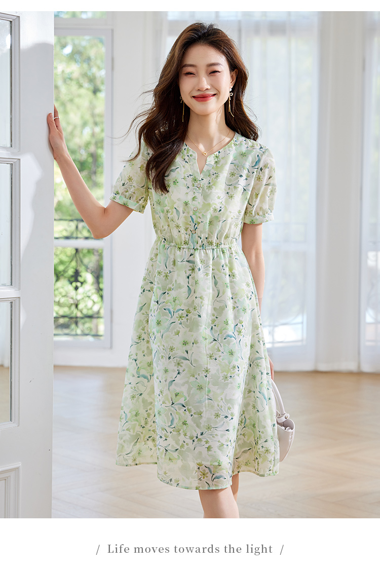 【专属特价】熙世界小清新绿色碎花连衣裙女夏温柔法式雪纺A字裙子