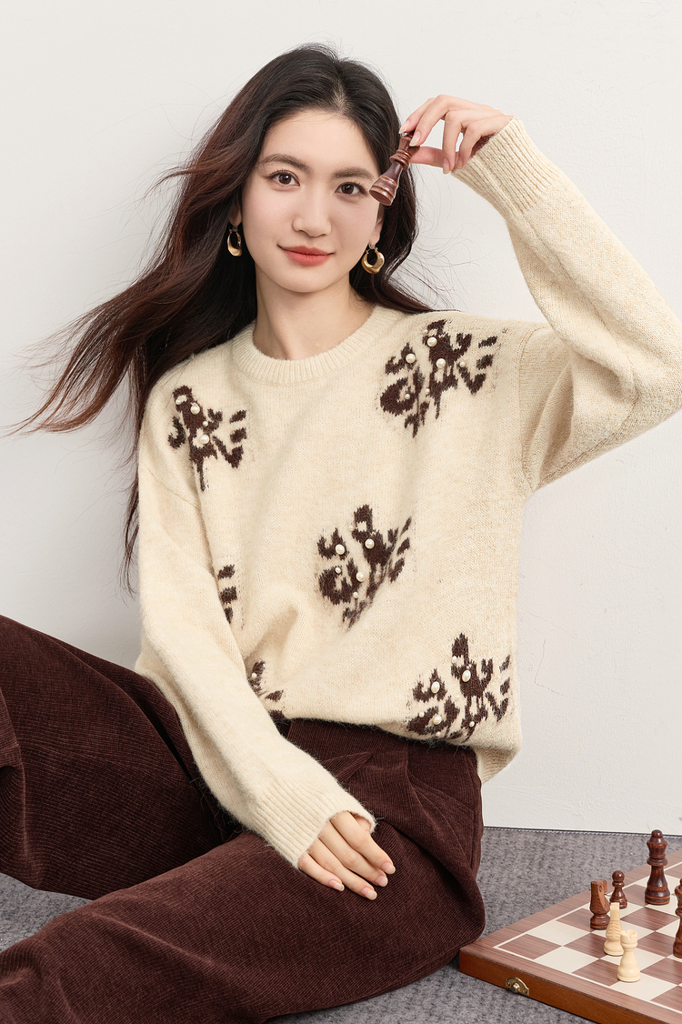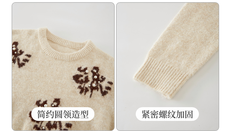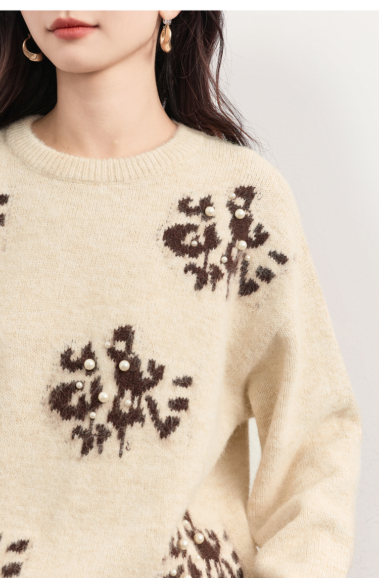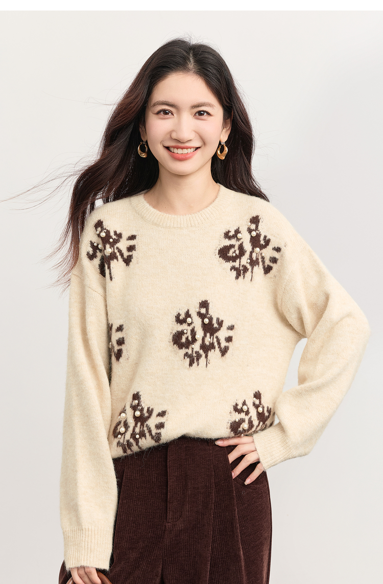 【年货节】熙世界韩系氛围感提花珍珠毛衣女秋冬长袖宽松羊毛混仿圆领针织衫
