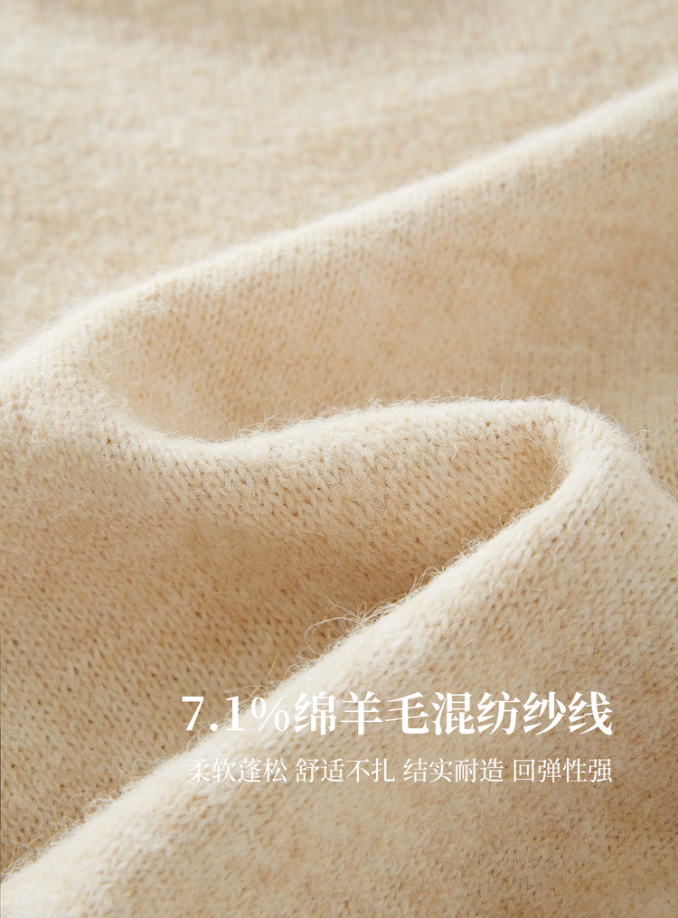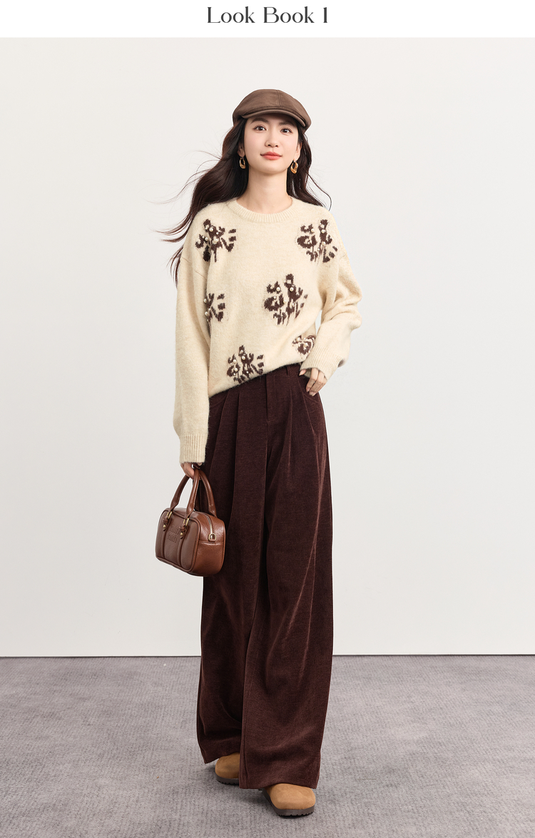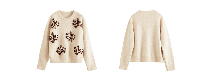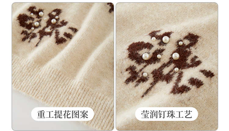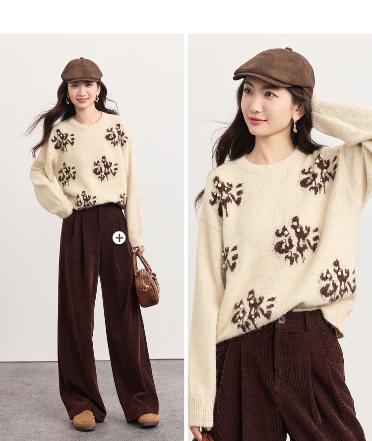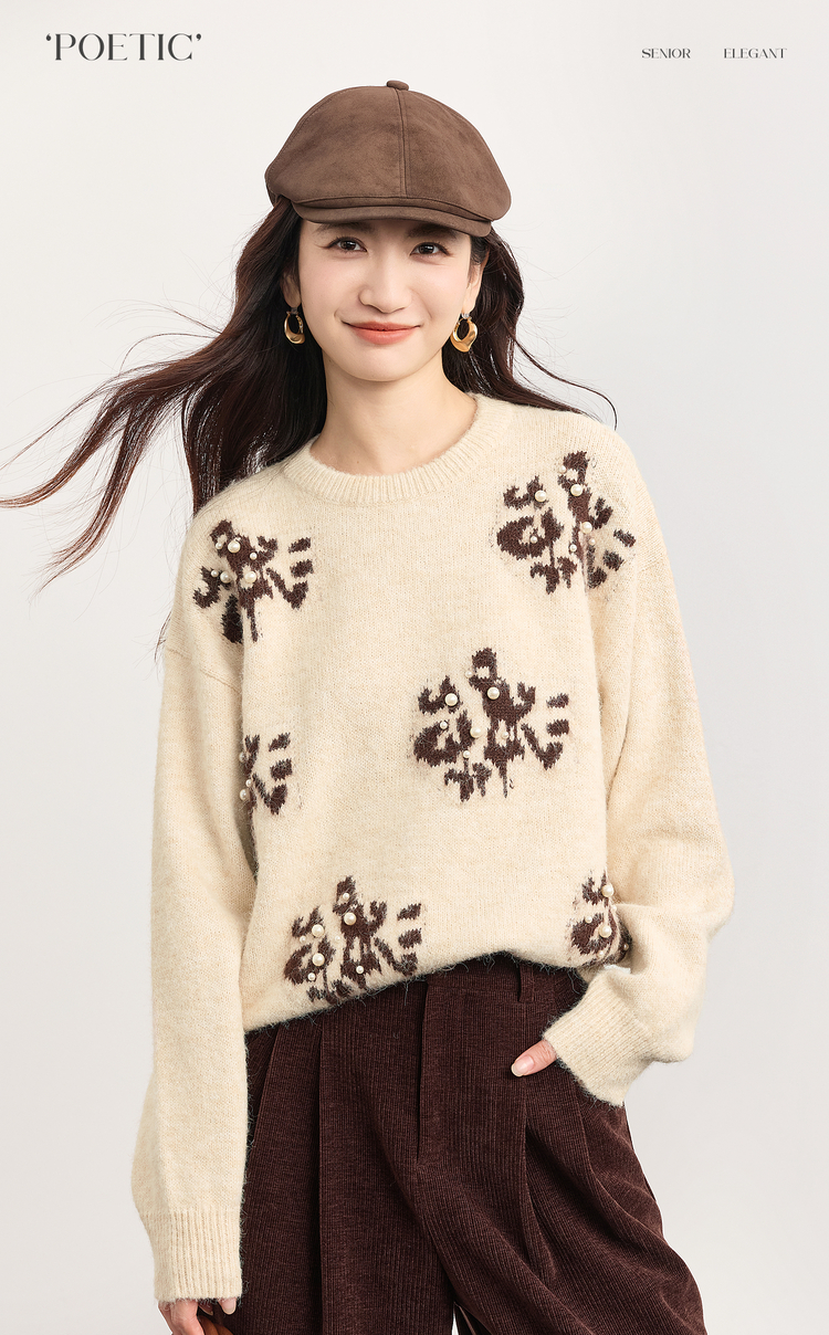 【年货节】熙世界韩系氛围感提花珍珠毛衣女秋冬长袖宽松羊毛混仿圆领针织衫