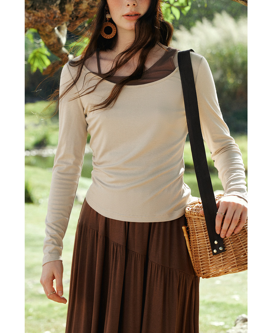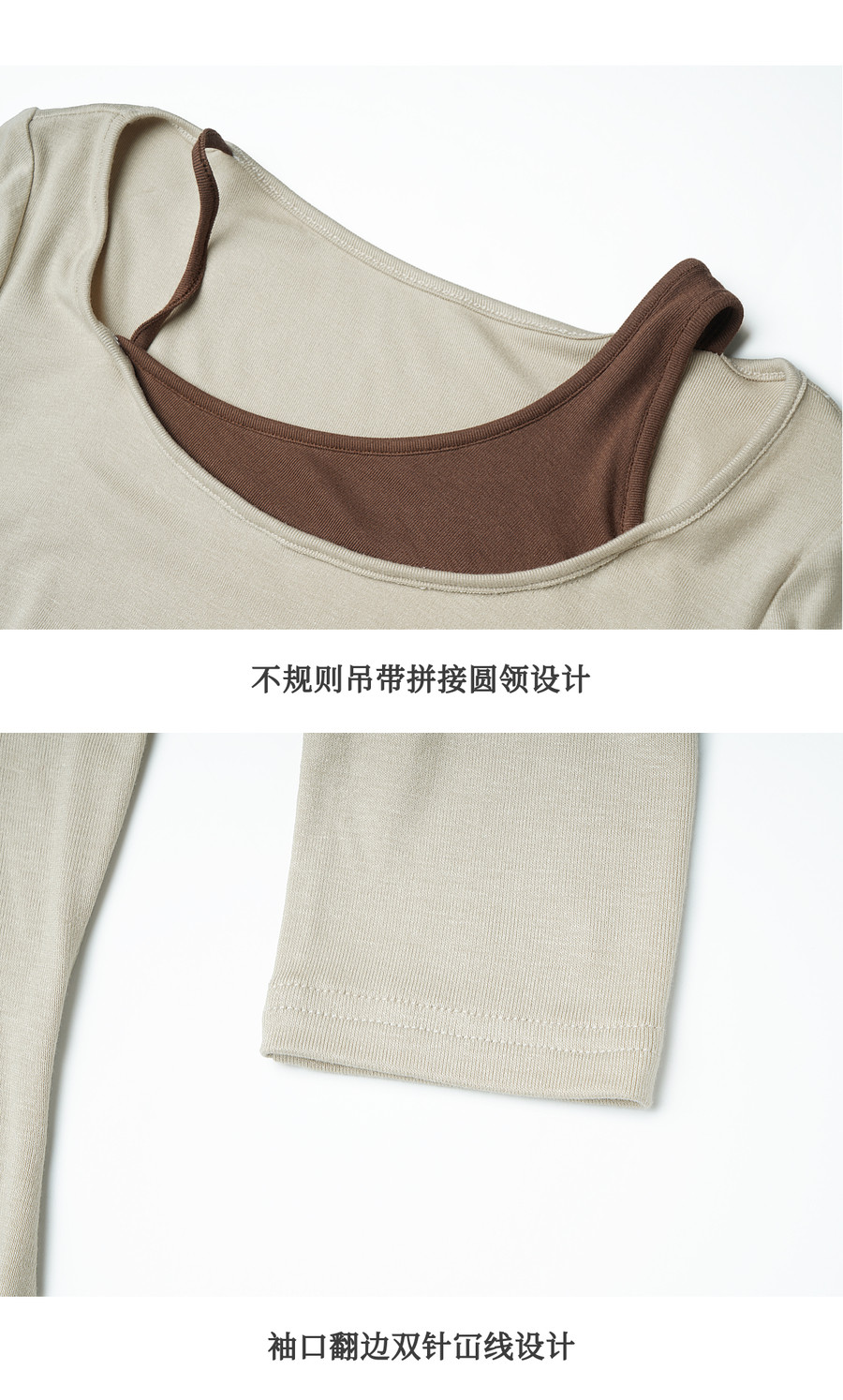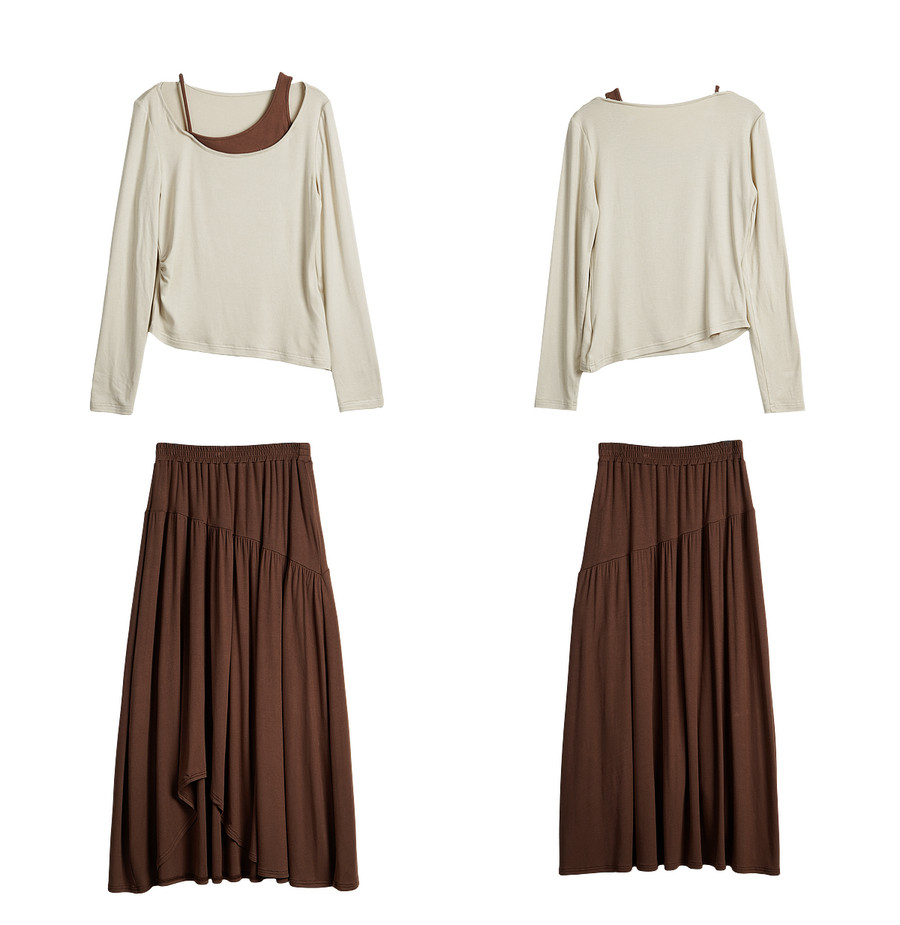 OLrain欧芮儿2026新款女春季撞色假两件长袖T恤不规则半裙两件套