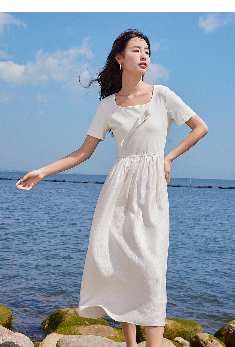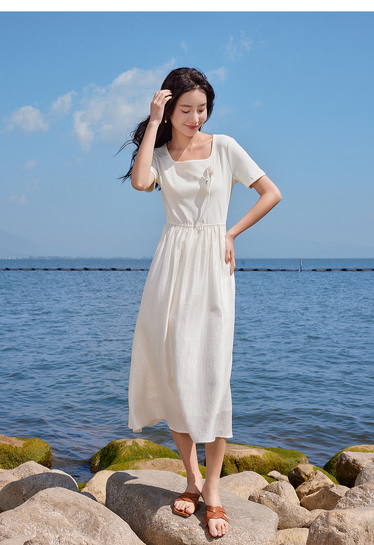 【专属特价】熙世界三醋酸天丝混纺白色连衣裙夏季收腰显瘦出游度假U领裙子