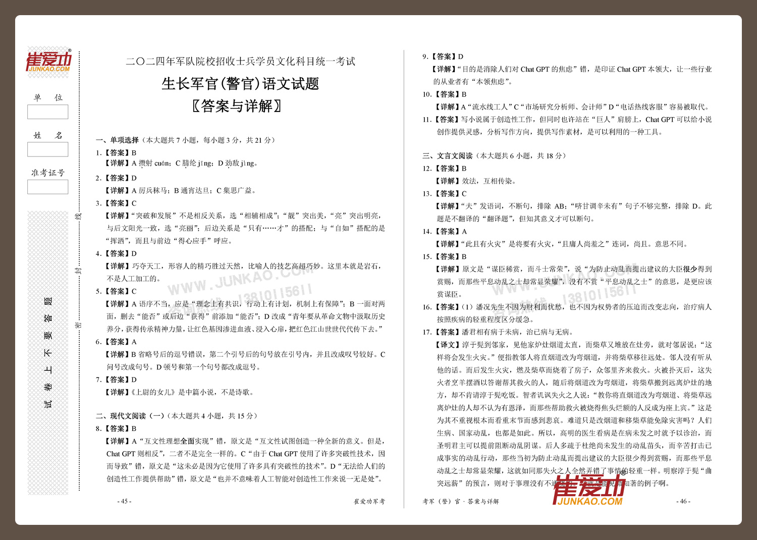 【考军官(警官)】军考历年真题试卷(2014-2024年,共11年)解放军和武警(高中和大专学历士兵)