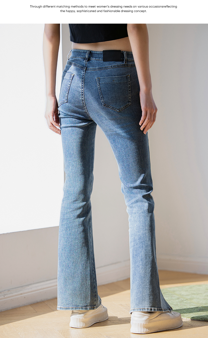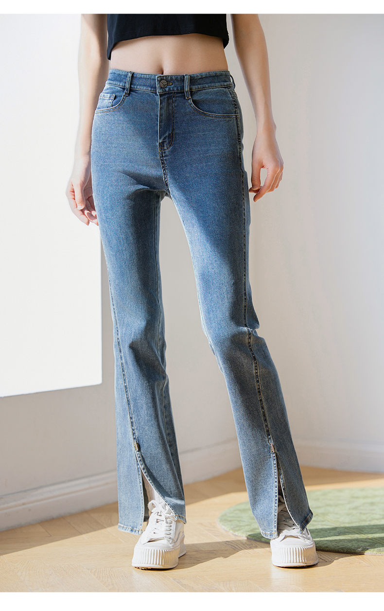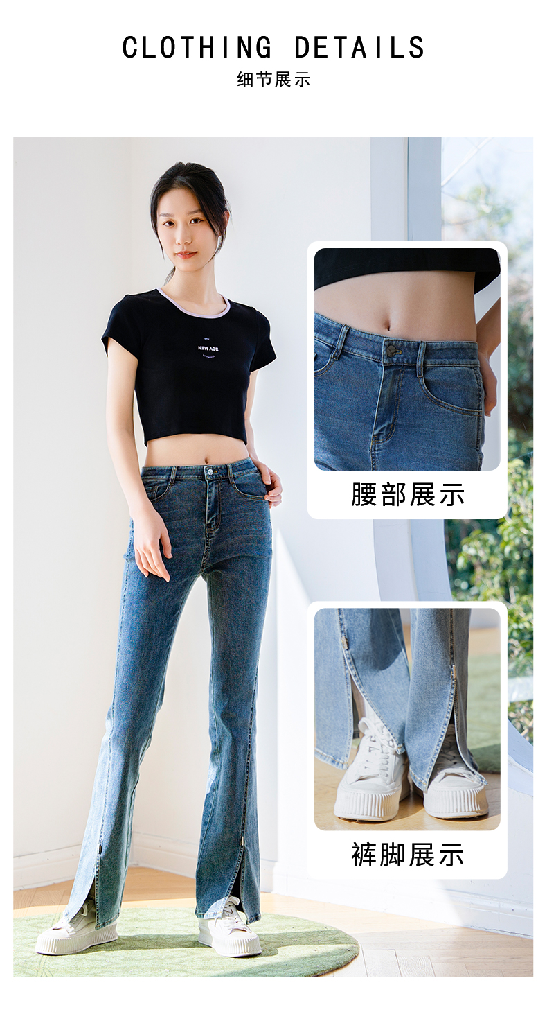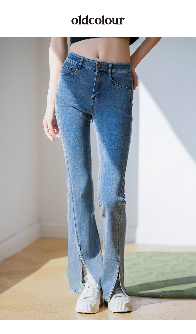 oldcolour蓝色牛仔裤夏季新款高腰显瘦时尚开叉微喇裤女P21113176