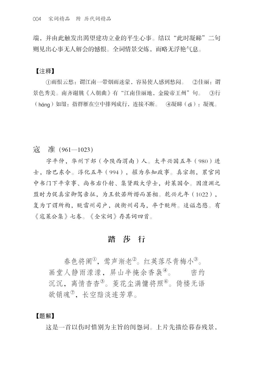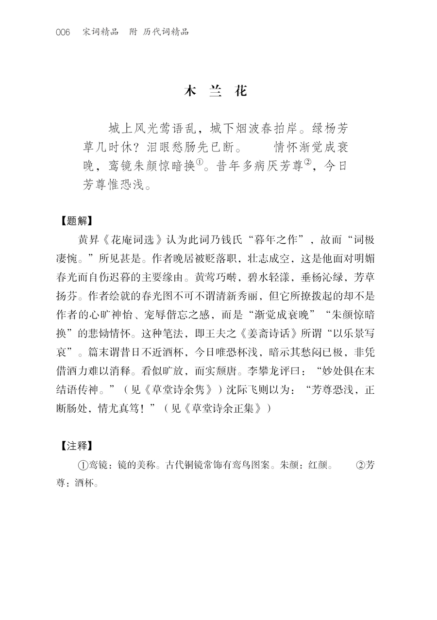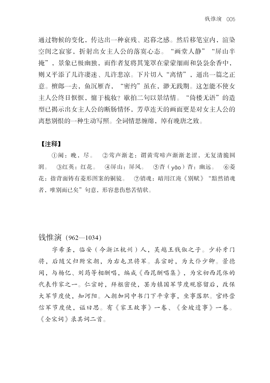 作品的注释上,体现出传统注释方式和现代注释方式相结合的特色,除了阐明词条的语意、句意,也往往引用古人作品,说明其用典、来源,让读者更能清晰明了地体会到词人写作作品时的传承,对前人优秀作品的学习和借鉴,以及其承载的文化意义。