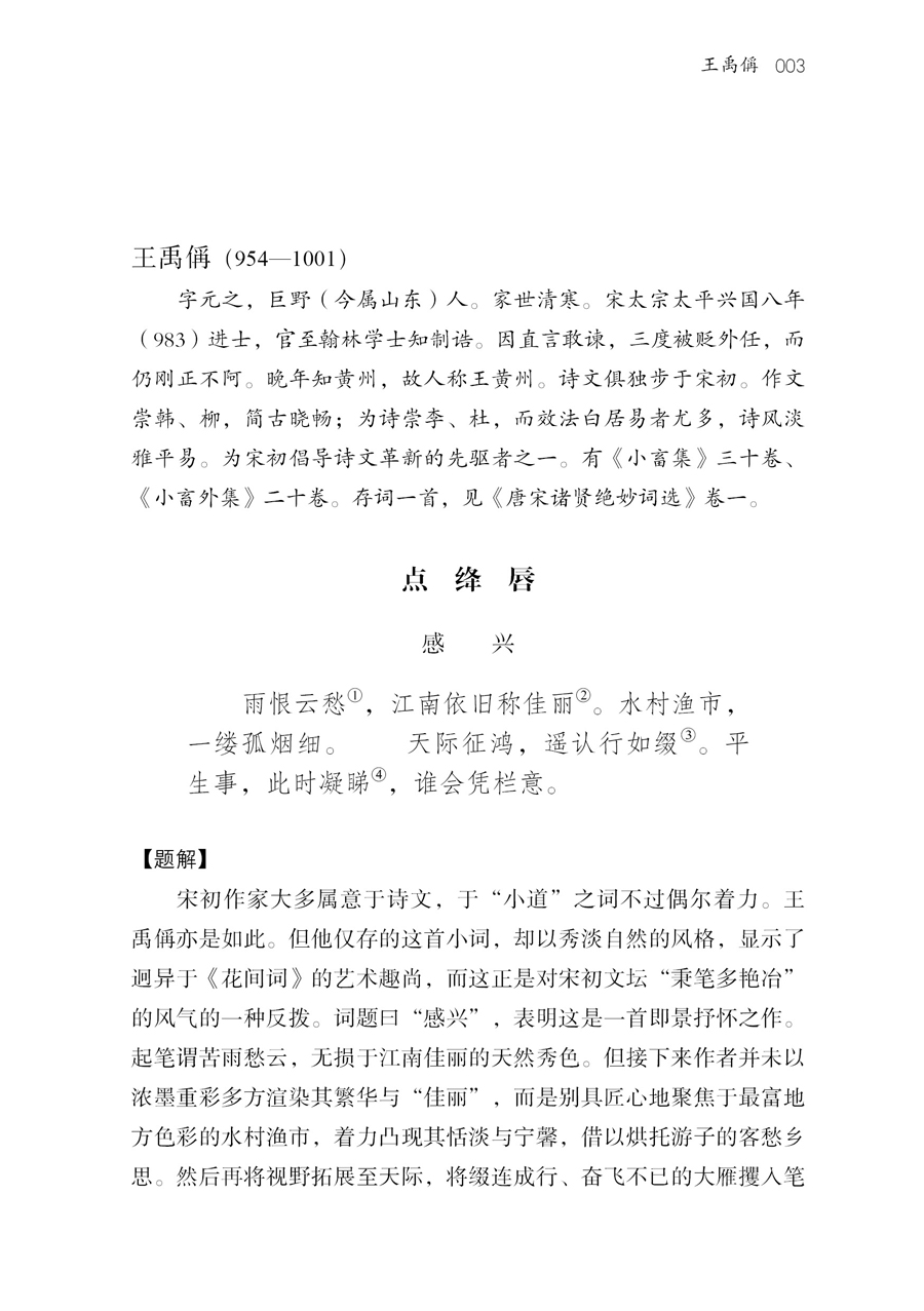 宋初作家大多属意于诗文,于“小道”之词不过偶尔着力。王禹偁亦是如此。但他仅存的这首小词,却以秀淡自然的风格,显示了迥异于《花间词》的艺术趣尚,而这正是对宋初文坛“秉笔多艳冶”的风气的一种反拨。词题曰“感兴”,表明这是一首即景抒怀之作。起笔谓苦雨愁云,无损于江南佳丽的天然秀色。但接下来作者并未以浓墨重彩多方渲染其繁华与“佳丽”,而是别具匠心地聚焦于最富地方色彩的水村渔市,着力凸现其恬淡与宁馨,借以烘托游子的客愁乡思。然后再将视野拓展至天际,将缀连成行、奋飞不已的大雁攫入笔端,并由此触发出渴望建功立业的平生心事。结以“此时凝睇”二句则见出心事无人解会的憾恨。全词情景交炼,而略无浮艳气息。