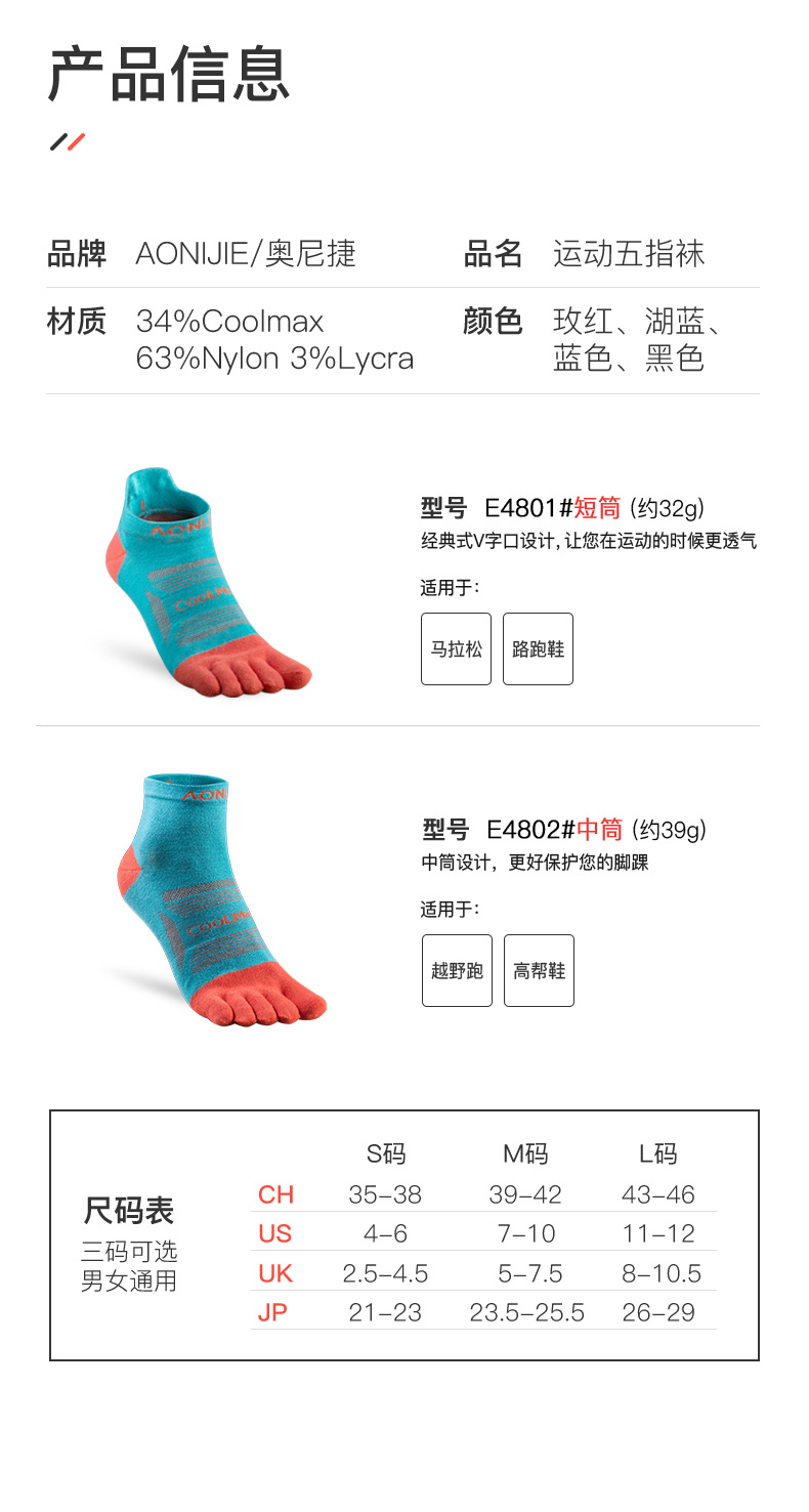 奥尼捷 五指袜专业跑步袜子男加厚运动袜越野跑马拉松袜子女E4801