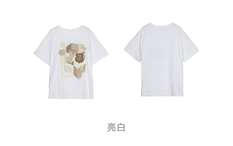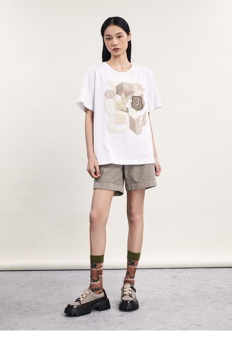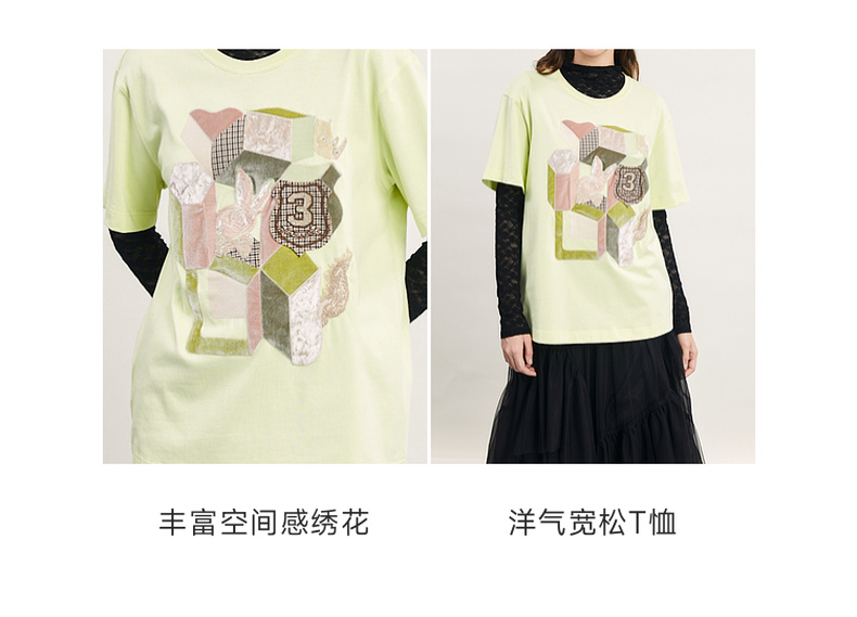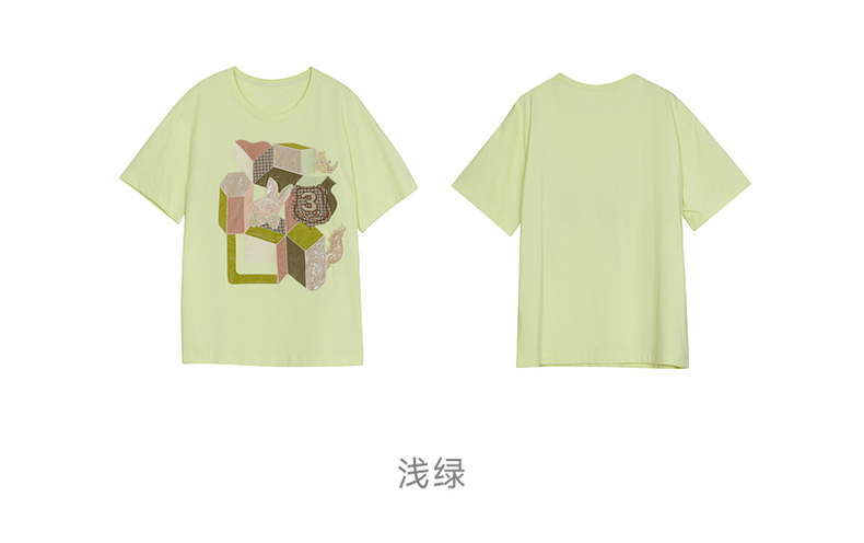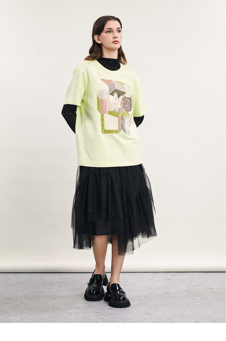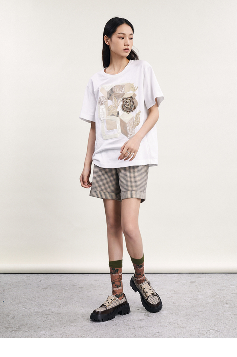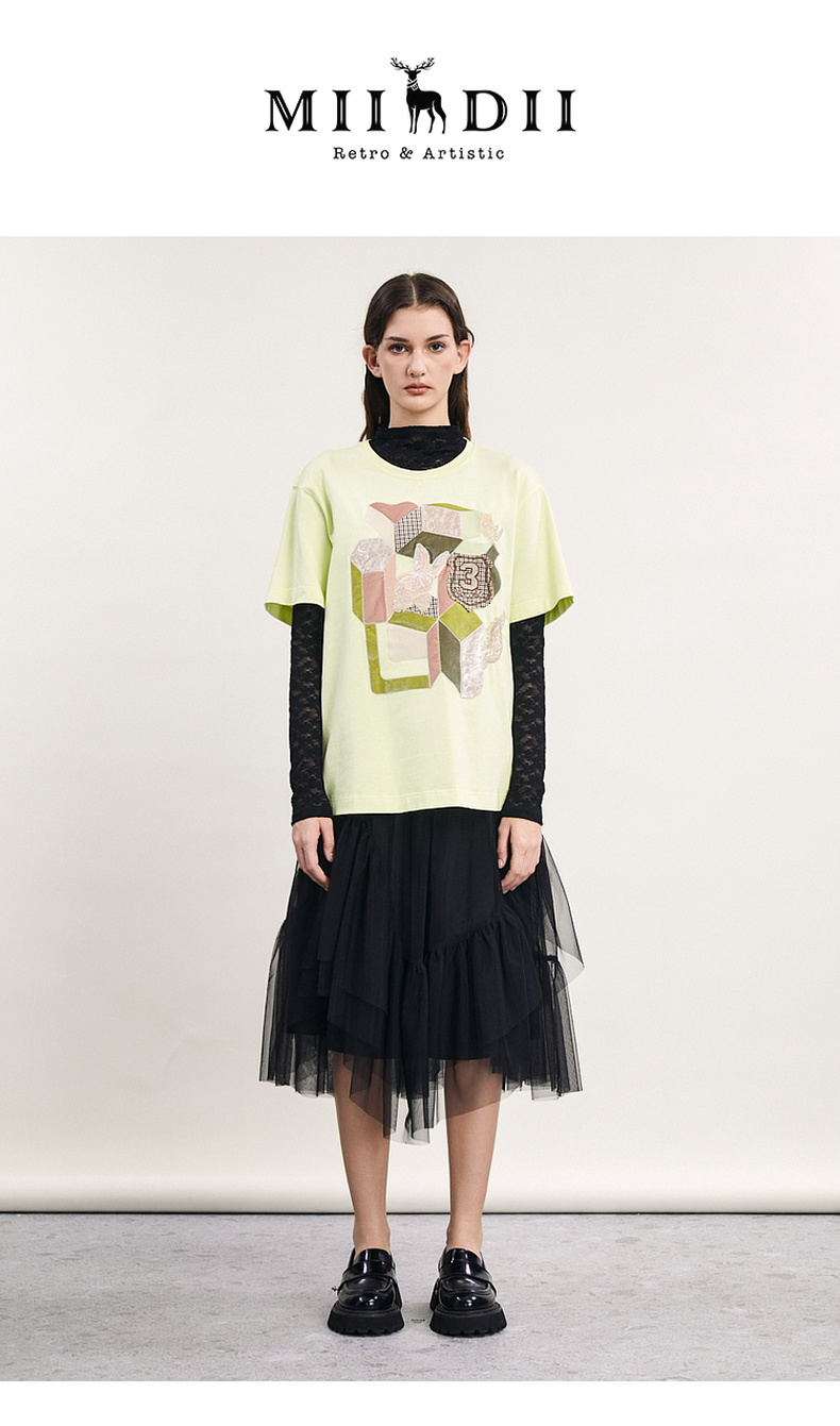谜底中长款印花T恤短袖女2024春新款学院风圆领宽松上衣241MT0054