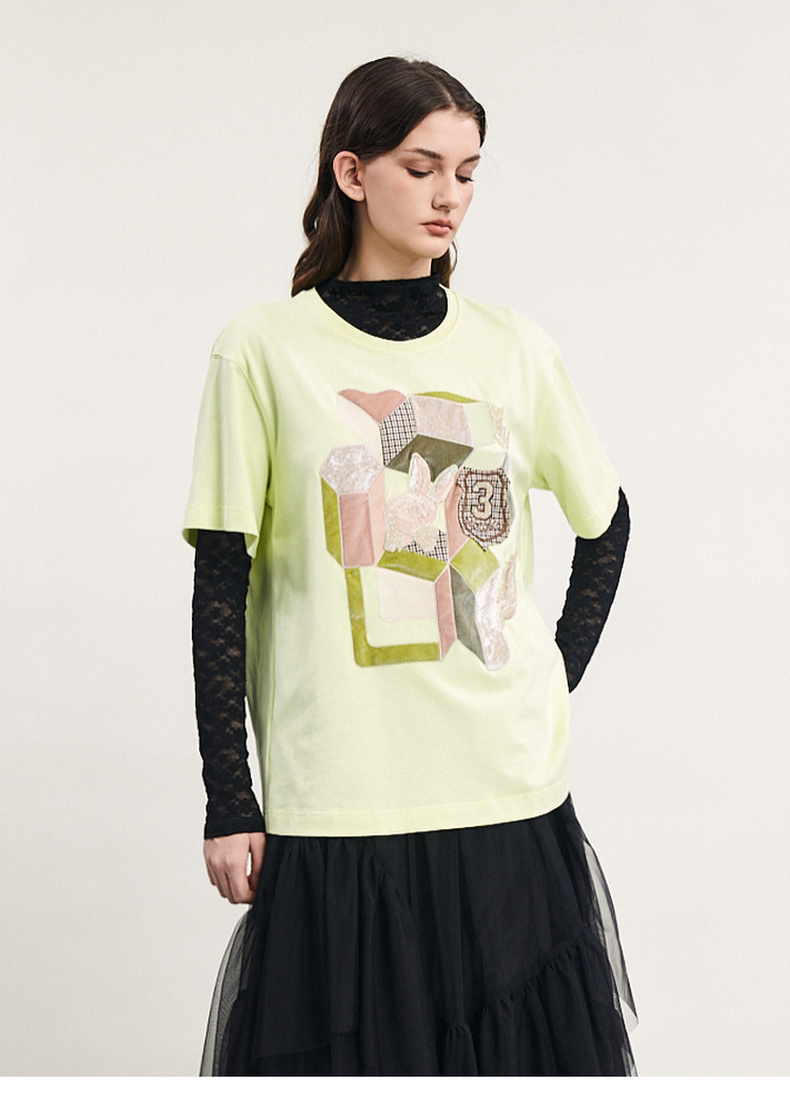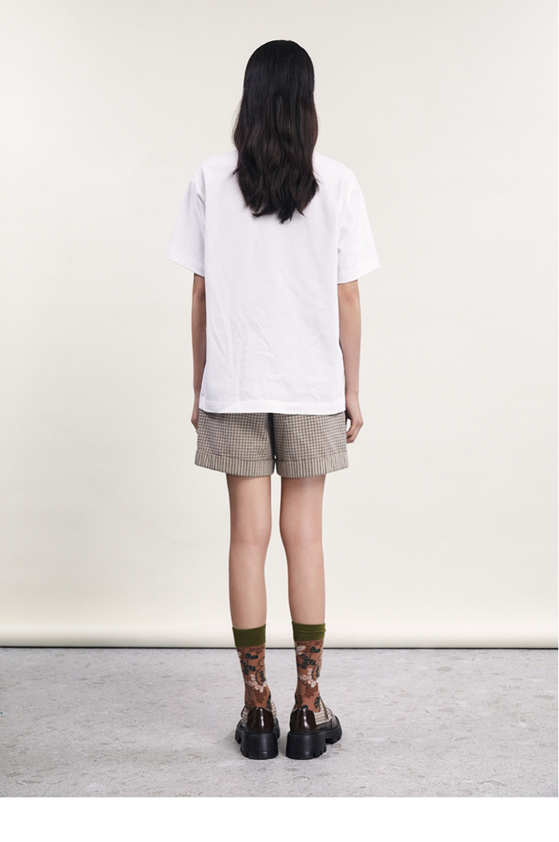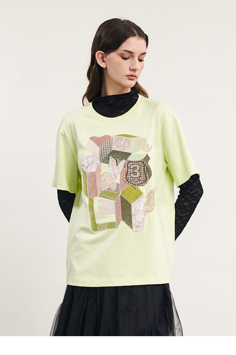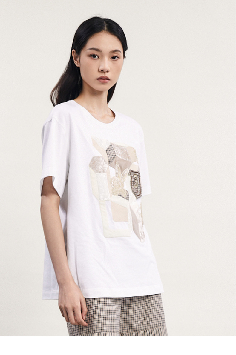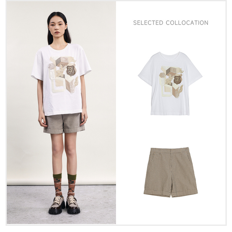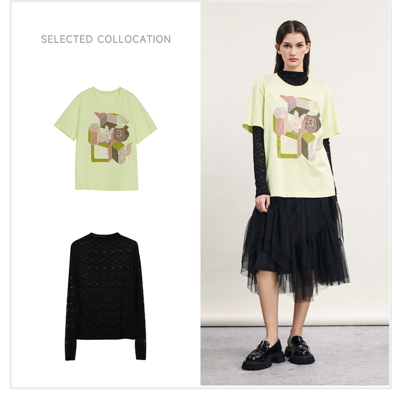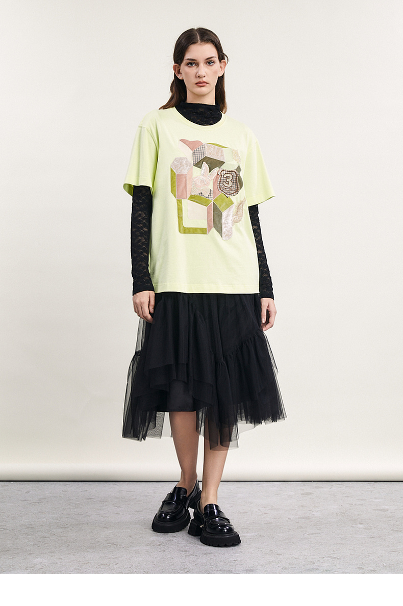 谜底中长款印花T恤短袖女2024春新款学院风圆领宽松上衣241MT0054