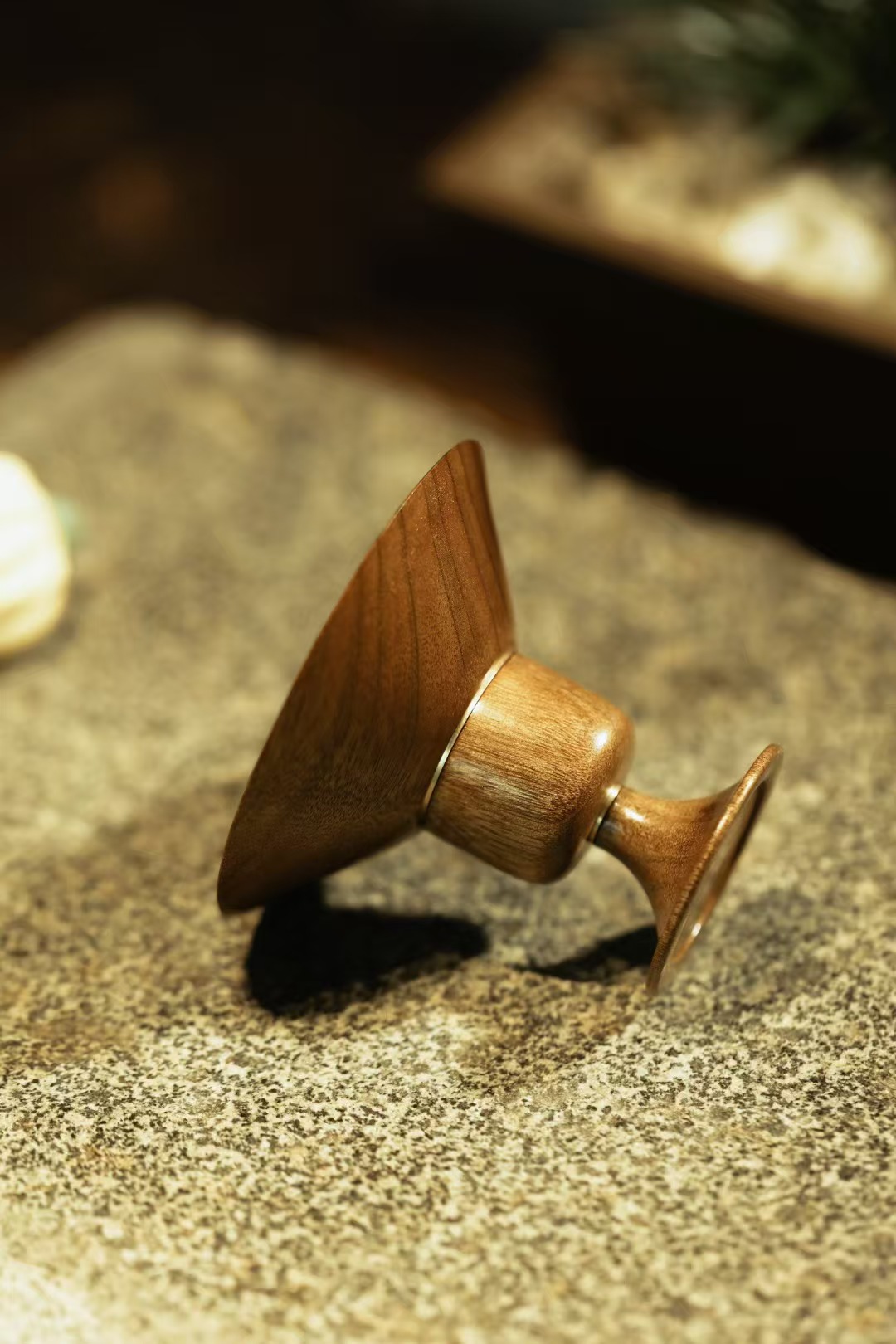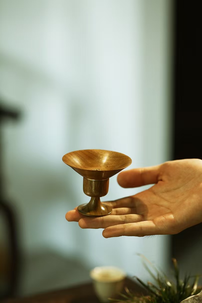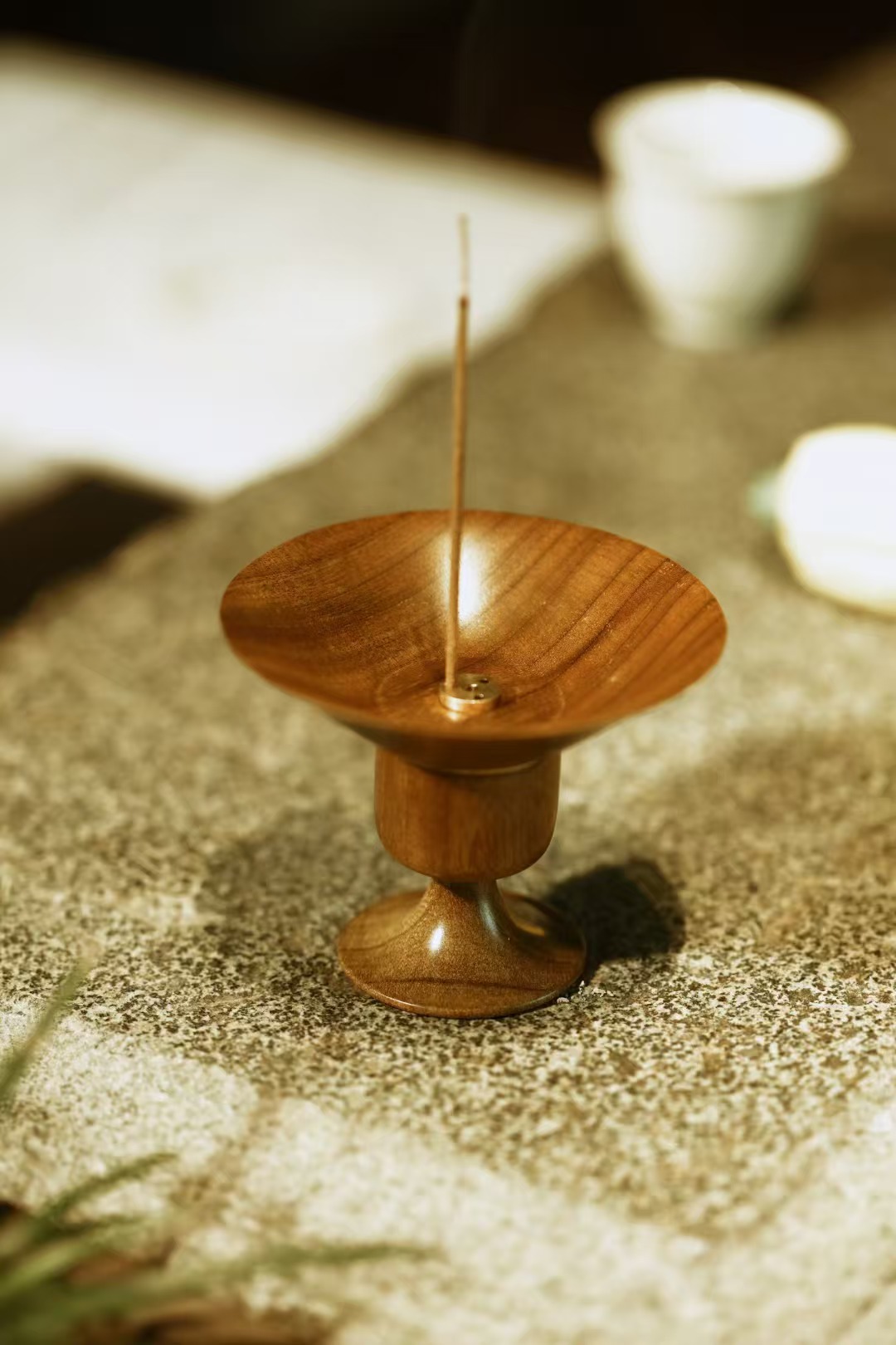 取材金丝楠老料,香插呈高足圆盘式,规整大方,材质细腻,不事雕琢,文房案头燃香造景,尤为文气。
