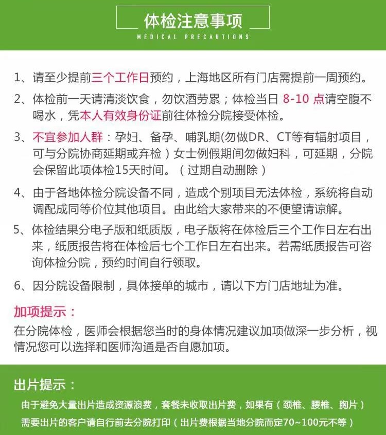 因近期体检预约人数众多,套餐需要提前3天预约,请添加客服微信,以便确认预约门店和预约时间。