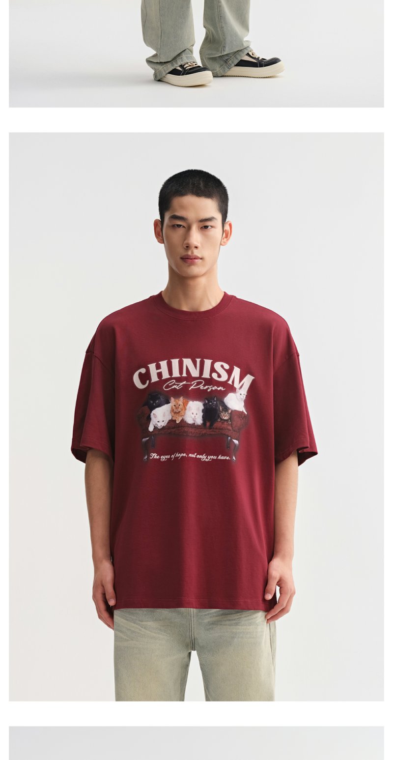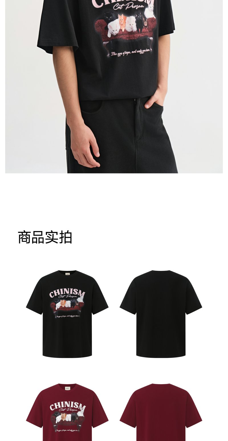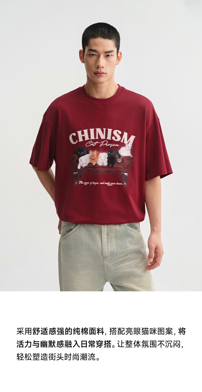 CHINISM赤尘 猫咪印花短袖T恤男新款美式亲肤纯棉半袖男士上衣