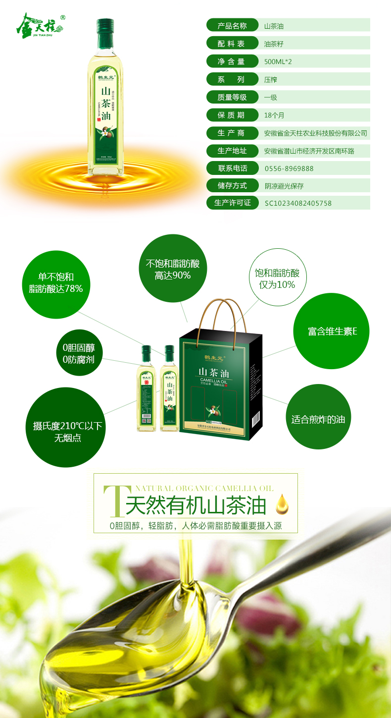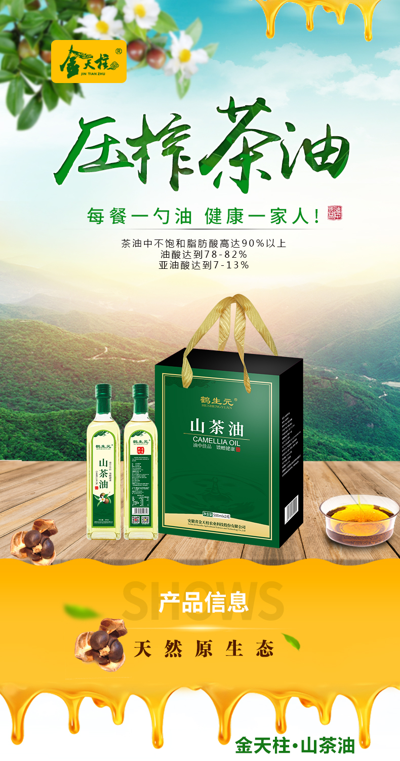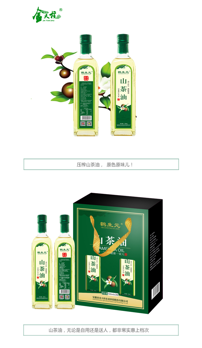 金天柱(JINTIANZHU)/安徽潜山/压榨一级油/茶籽油/热炒可口服/礼盒500ML*2