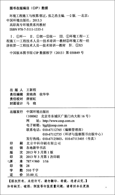 环境工程施工与核算 全国高职高专规划教材(第二版)郭正 张之浩 环境保护9787511113351