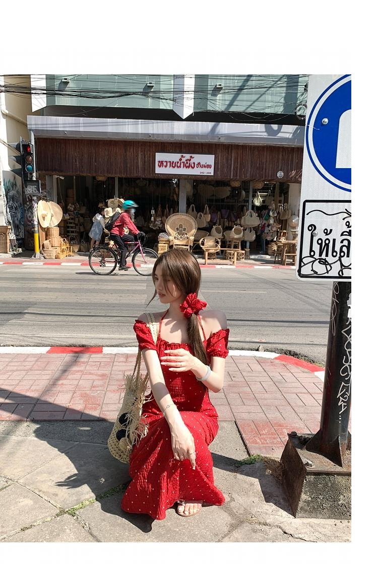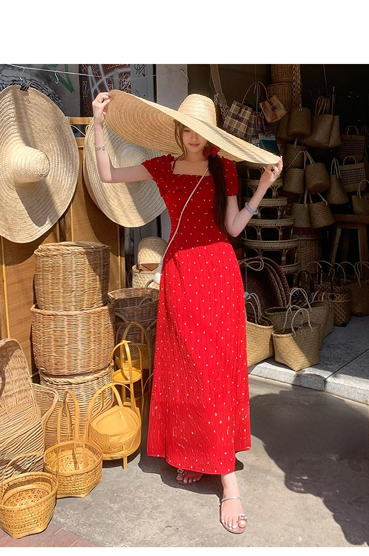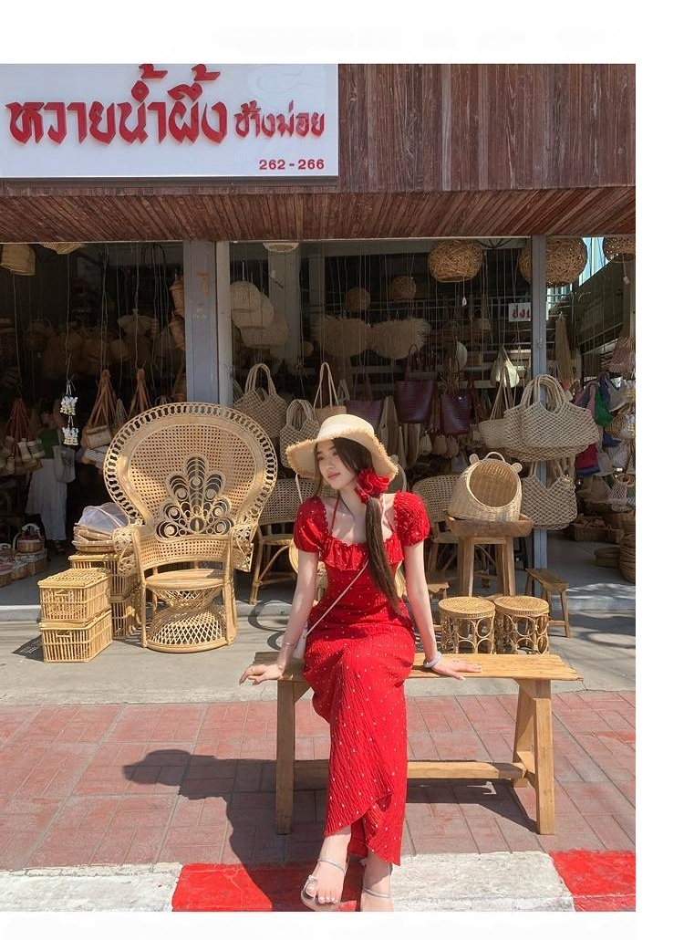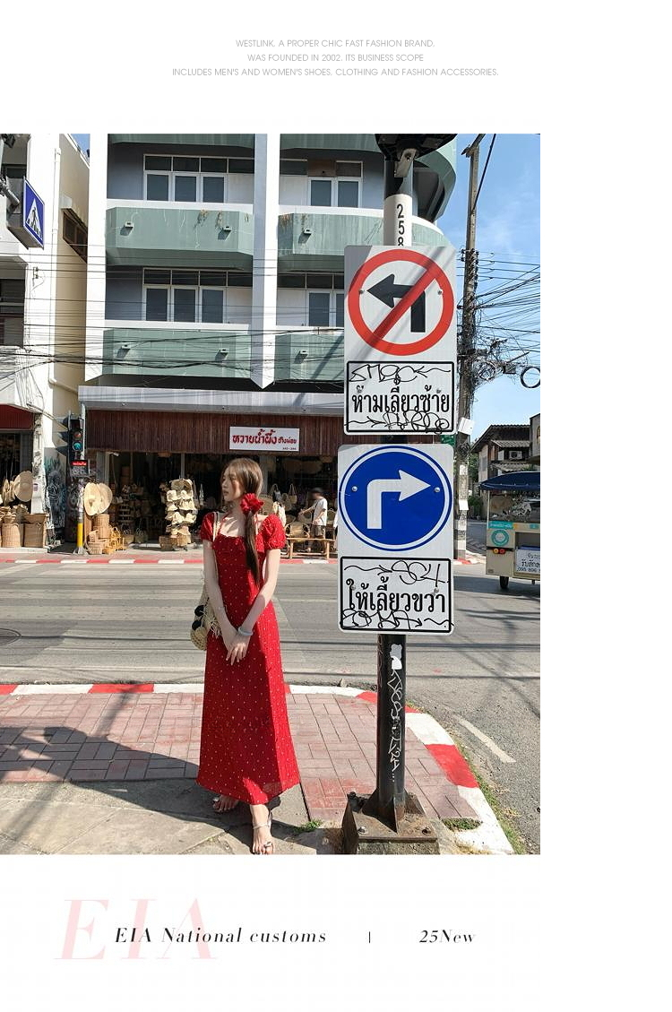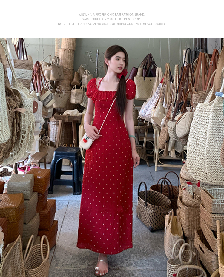 西遇红色波点连衣裙女夏季新款度假风方领a字收腰法式长裙SS050559