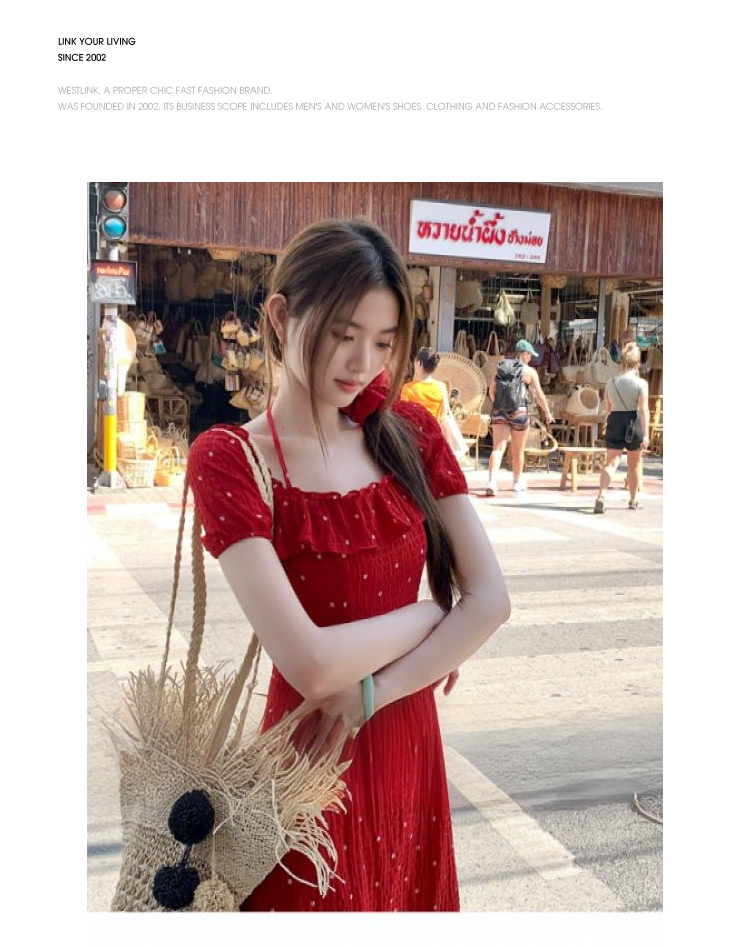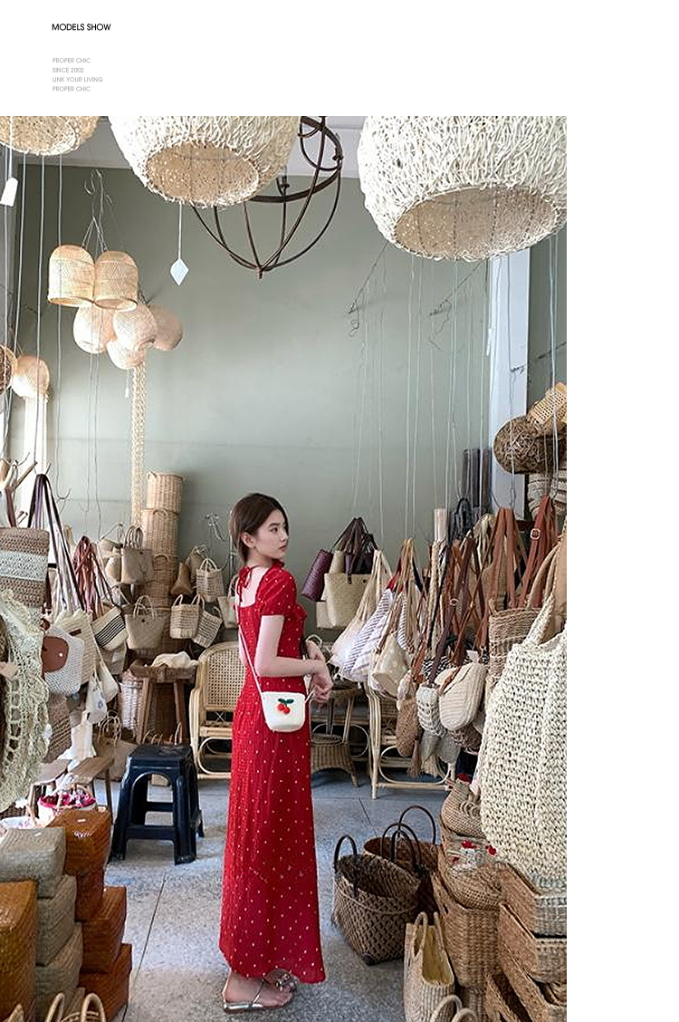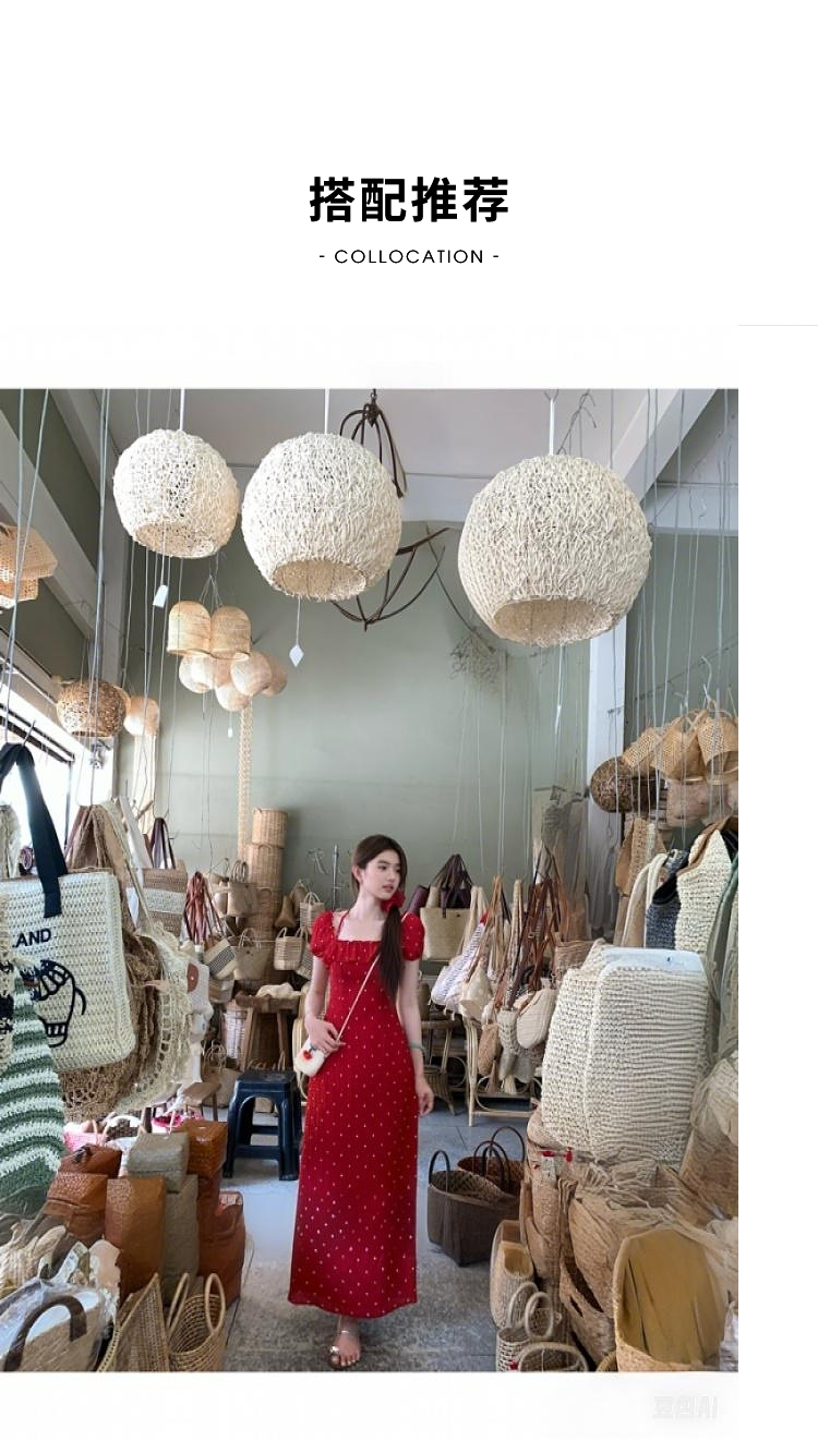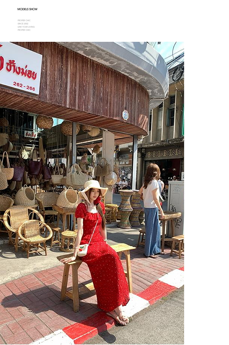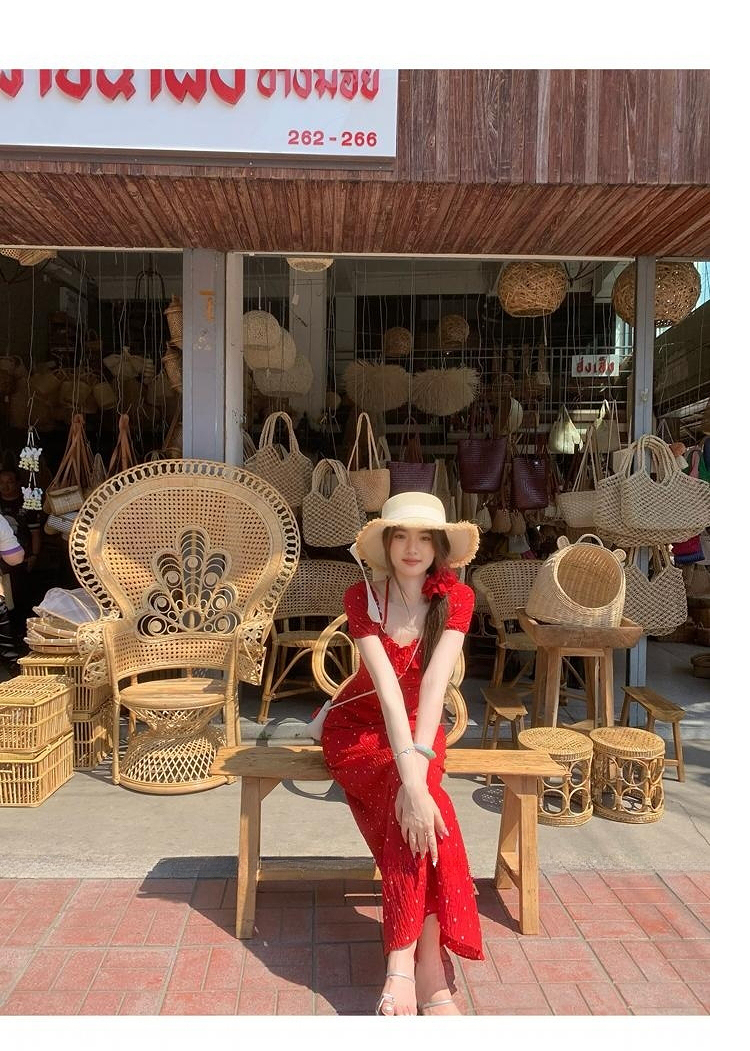 西遇红色波点连衣裙女夏季新款度假风方领a字收腰法式长裙SS050559