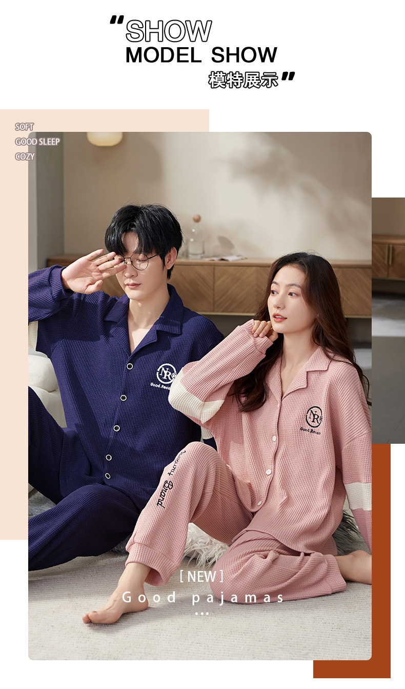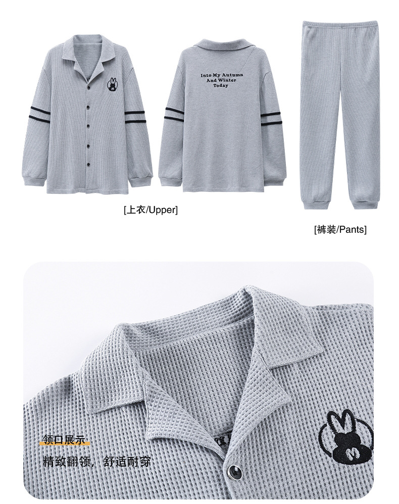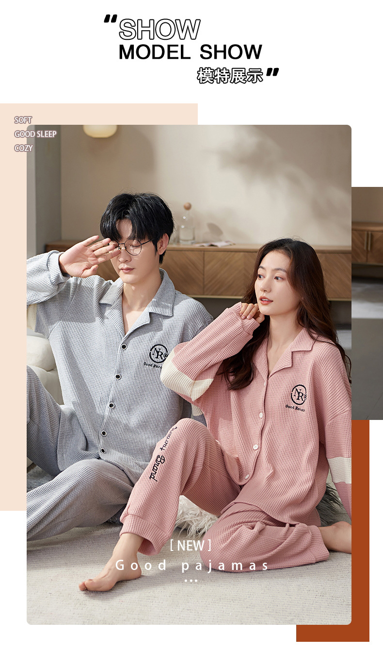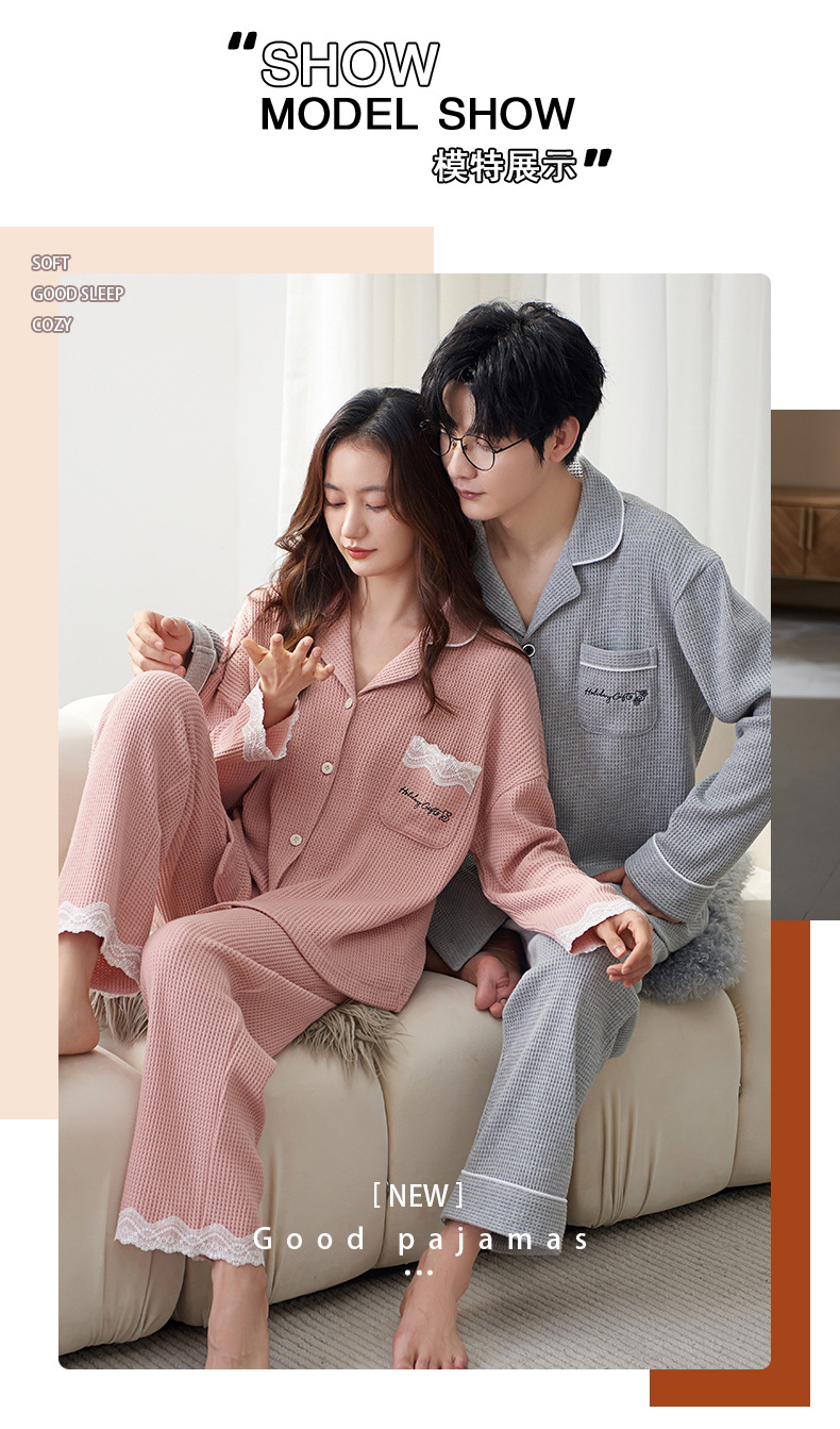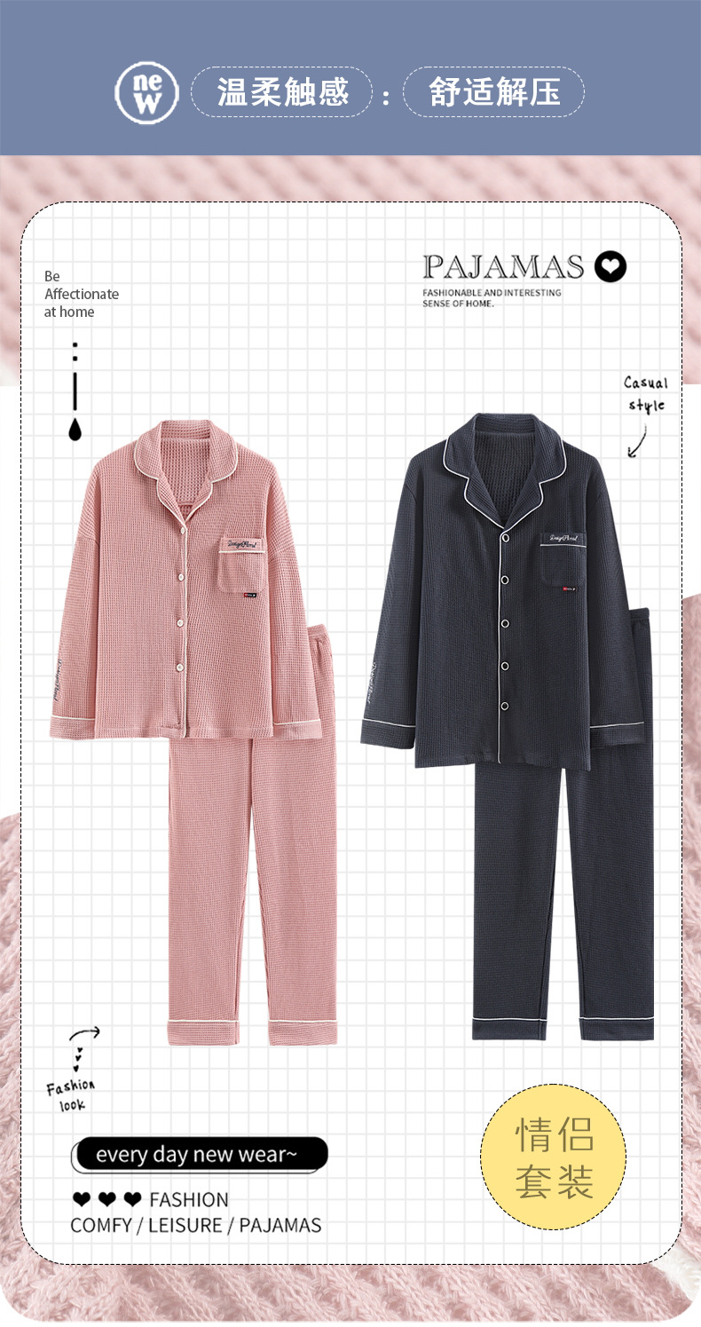 【韩式情侣款 卡通可爱超舒适!】秋冬季情侣睡衣开衫华夫格透气纯棉长袖休闲家居服男士女士春秋季
